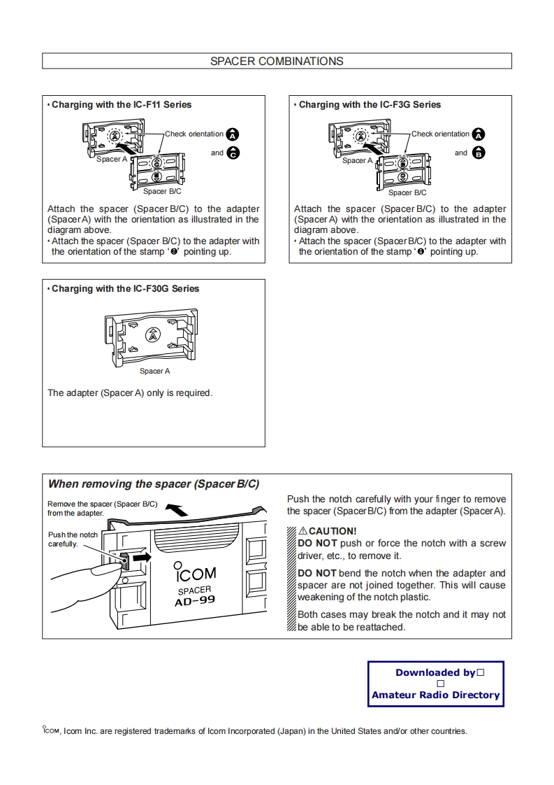 COMThank you for purchasing the BC-146 BATTERYINSTRUCTIONSCHARGER.The BC-146 charges a Ni-Cd or a Ni-MH battery pack.(Max.charging time approx.18.5 hrs:BATTERY CHARGERdepending on battery pack)BC-146Please read these instructions thoroughly before op-erating the BC-146.CAUTIONBATTERY PACK CHARGING·△USE INDOORS ONLY!NEVER expose the chargerCharging with transceiverto rain,snow or any liquids.NEVER let metal,wire,etc.touch any internal part ofthe charger.NEVER incinerate used batteries.This may cause anexplosion.Turn power OFFNEVER use the charger when it is covered by objectswhich impede heat dispersal.Place the charger in a secure place to avoid inadver-tent use by children.AVOID charging in extreme cold (under 0C;+32F)CP-1.CP-17Lor extreme heat (over +45C;+113F).Batteries may0r0PC-515L(Option)not charge fully under extreme temperatures.Keep the charger away from TV sets or radios to pre-Check orientationvent interference.and the spacer.ANEVER attempt to charge alkaline or dry cell bat-combination.The combinationteries.They may burst causing damage and personalmay differ accord-injury.AC adapter(Option;ing to transceiverBC-147A/Etype.Make sure battery and charger contacts are alwaysBC-122V)See the backclean,otherwise batteries may not fully charge.Charging indicatorpage for details.In order to get the maximum life out of your batteries:Charging battery pack only1.Avoid overcharging-batteries must be removedfrom the BC-146 to stop charging.Batteries shouldBP.209.BP.210not be charged for more than 24 hours.or BP-222 only2.Use the batteries until they become almost com-CP-1.CP-17Lpletely exhausted under normal conditions.or OPC-515L(Option)If your batteries seem to have no capacity even afterCheck orientationbeing fully charged,completely discharge them,then*Viewable stampsfully charge them again.If they still do not retain amay differ accord-charge (or very little),new batteries must be pur-ing to the spacerchased.AC adaptecombination.See(Option:the back page forBC-147A/Edetails.Recycling information(U.S.A.only)BC-122V)The battery (BP-209 or BP-222)that you have pur-Approx.charging periodCYCchased is recyclable.At the end of its life,under vari-BP.20912 hoursous state and local laws,it may be illegal to dispose ofBP.21018.5 hoursthis battery into the municipal waste stream.Call 1-BP.2226.5 hours822800-822-8837 for battery recycling options in your areaor contact your dealer.NOTE:The charging indicator will not go out even after aDownloaded by▣battery pack is fully charged.▣Amateur Radio DirectoryCount on us!Icom Inc.1-1-32 Kamiminami,Hirano-ku,Osaka 547-0003 JapanA-6026D-1EX Printed in Japan©2001 Icom Inc.