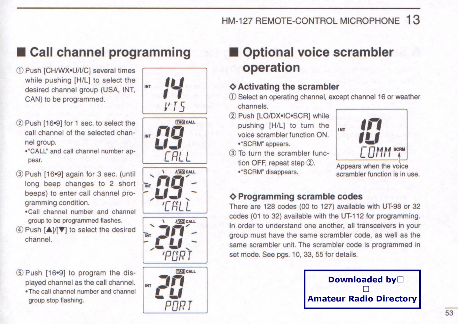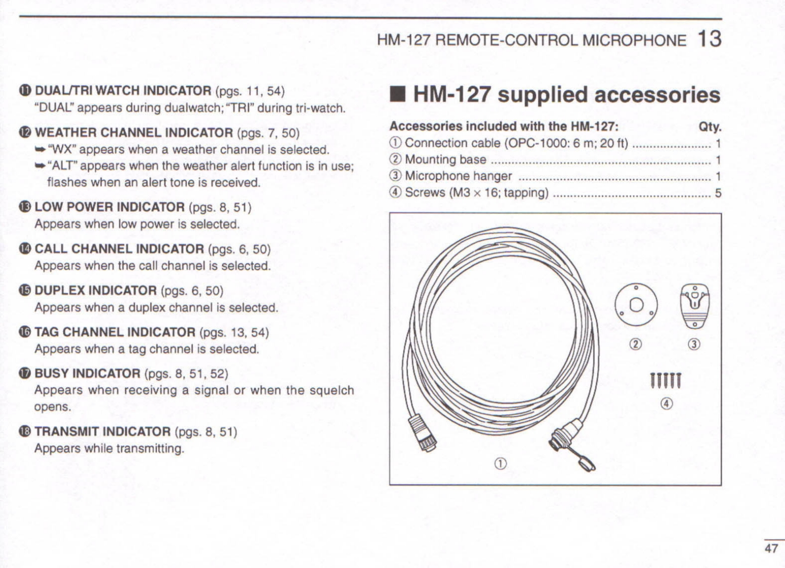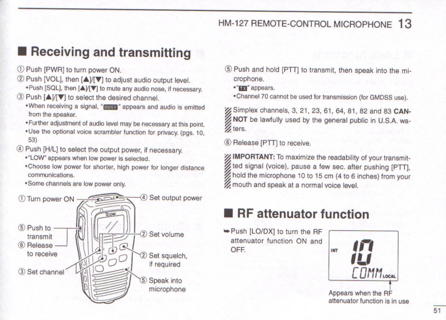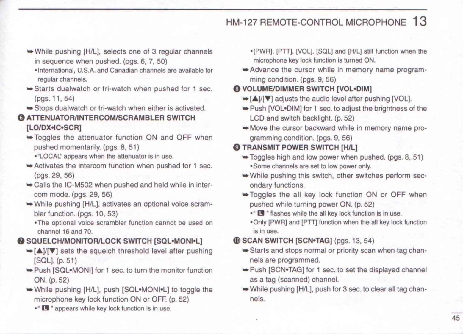 13HM-127 REMOTE-CONTROL MICROPHONEOPTIONAL■Panel description2 PTT SWITCH [PTT](pgs.8,51)Push and hold to transmit;release to receive.The optional HM-127 remotely controls the IC-M502 and pro-CHANNEL UP/DOWN SWITCHES [A[]vides an optional intercom function.Push either switch to change the operating channel,setmode contents,etc.(pgs.8,51)0While pushing [H/L],push [A[]to adjust the bright-9ness of the LCD and switch backlight.(p.52)Push either switch to adjust audio level or noise squelchlevel after [VOL]or [SQL]is pushed,respectively.(pgs.8,51)8In set mode,changes setting of the selected item.(pgs.69,55)Checks tag channels or changes scanning direction dur-ing scan.(pgs.8,54)CHANNEL 16/CALL CHANNEL SWITCH [16-9]Selects channel 16 when pushed.(pgs.6,50)Selects call channel when pushed for 1 sec.(pgs.6,50)."CALL"appears when call channel is selected.Push for 3 sec.to enter call channel programming con-dition when call channel is selected.(pgs.9,53)Downloaded by▣While pushing [H/L],enters memory name programming口condition.(pgs.9,56)Amateur Radio DirectoryEnters set mode when pushed while turning power ON.(pgs.30,55)POWER SWITCH [PWR](pgs.8,51)6 CHANNEL/DUALWATCH/TRI-WATCH SWITCHPush for 2 sec.to turn the HM-127 power ON or OFF when[CH/WX-DW-U/I/C]the IC-M502 power is turned ON.Selects and toggles the regular channels and weatherchannel when pushed momentarily.(pgs.6,7,50)44