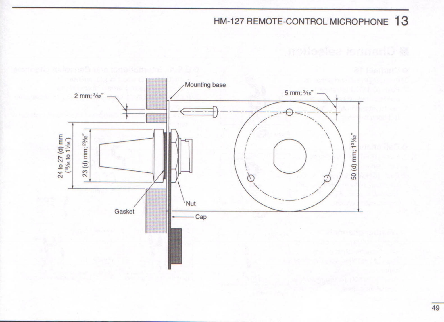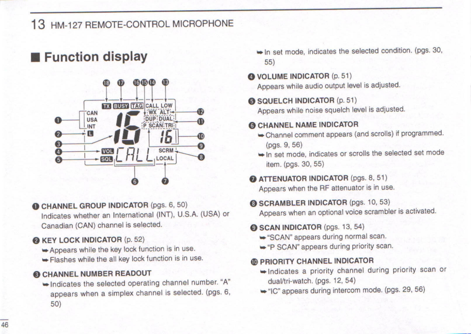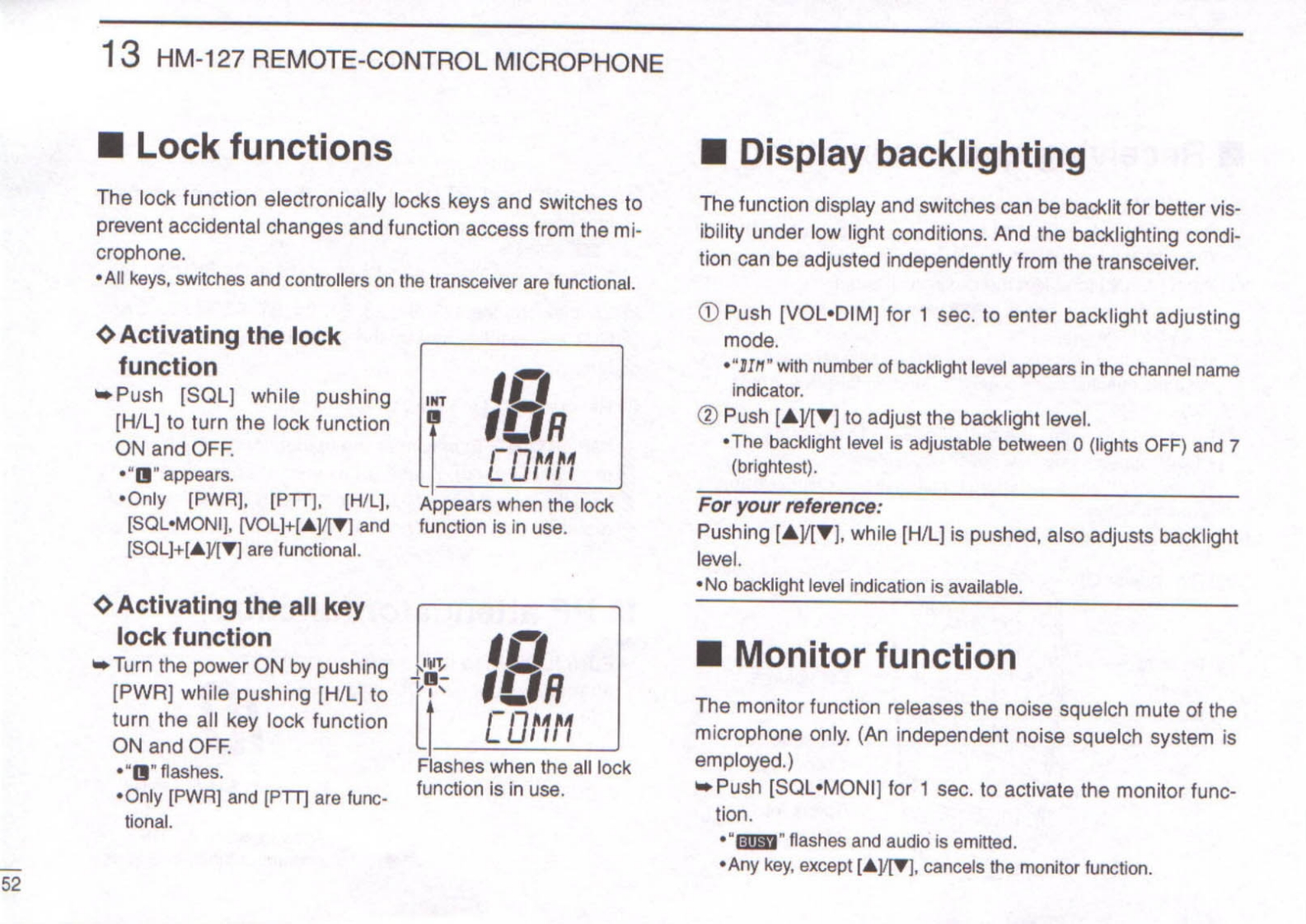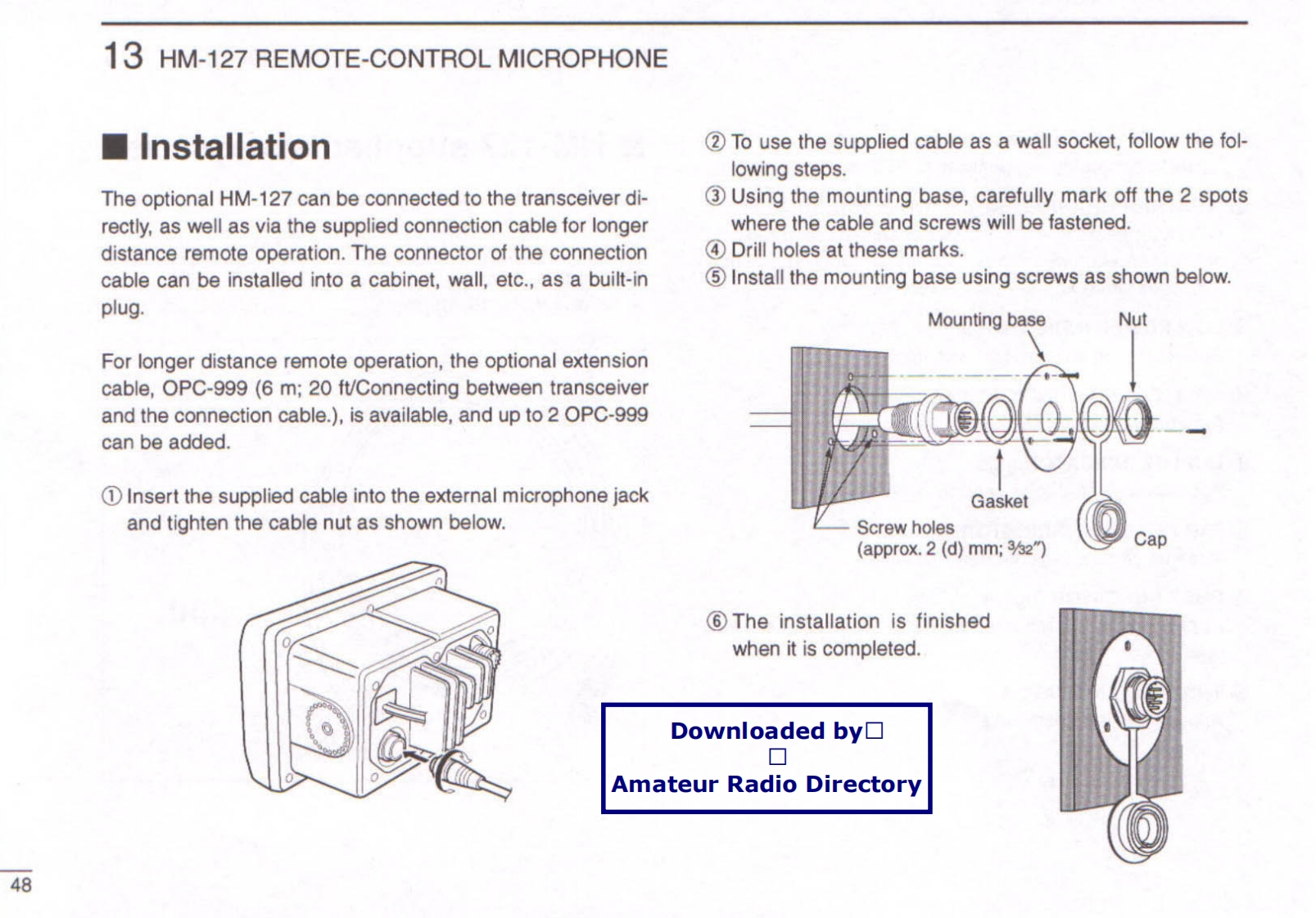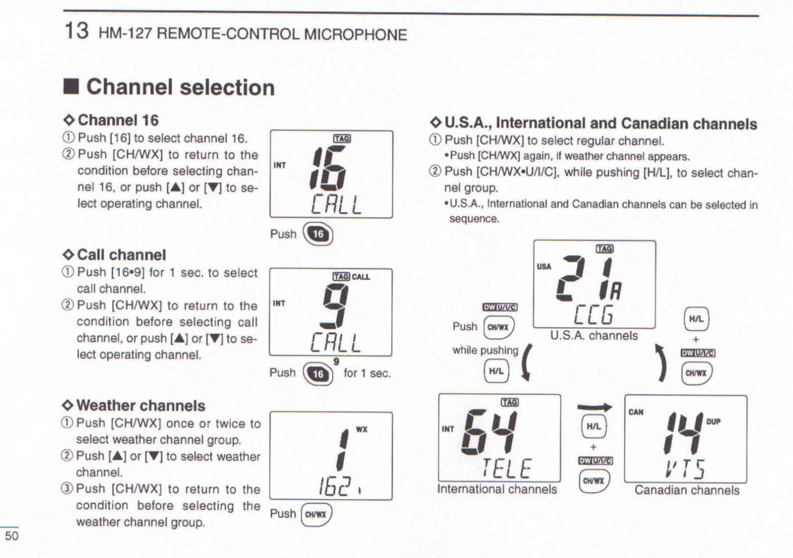 13HM-127 REMOTE-CONTROL MICROPHONEOPTIONAL■Panel description2 PTT SWITCH [PTT](pgs.8,51)Push and hold to transmit;release to receive.The optional HM-127 remotely controls the IC-M502 and pro-CHANNEL UP/DOWN SWITCHES [A[]vides an optional intercom function.Push either switch to change the operating channel,setmode contents,etc.(pgs.8,51)0While pushing [H/L],push [A[]to adjust the bright-9ness of the LCD and switch backlight.(p.52)Push either switch to adjust audio level or noise squelchlevel after [VOL]or [SQL]is pushed,respectively.(pgs.8,51)8In set mode,changes setting of the selected item.(pgs.69,55)Checks tag channels or changes scanning direction dur-ing scan.(pgs.8,54)CHANNEL 16/CALL CHANNEL SWITCH [16-9]Selects channel 16 when pushed.(pgs.6,50)Selects call channel when pushed for 1 sec.(pgs.6,50)."CALL"appears when call channel is selected.Push for 3 sec.to enter call channel programming con-dition when call channel is selected.(pgs.9,53)Downloaded by▣While pushing [H/L],enters memory name programming口condition.(pgs.9,56)Amateur Radio DirectoryEnters set mode when pushed while turning power ON.(pgs.30,55)POWER SWITCH [PWR](pgs.8,51)6 CHANNEL/DUALWATCH/TRI-WATCH SWITCHPush for 2 sec.to turn the HM-127 power ON or OFF when[CH/WX-DW-U/I/C]the IC-M502 power is turned ON.Selects and toggles the regular channels and weatherchannel when pushed momentarily.(pgs.6,7,50)44