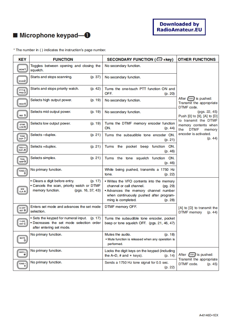 ABOUT HM-133S (for IC-2100 series)The supplied microphone HM-133S is redesigned from the HM-98S.The functionsof HM-133S are instructed in this sheet.Please refer to following information.6Downloaded byRadioAmateur.EU®⑦800①Second FunctionMic elementTONEDUP-Third FunctionFirst FunctionPush the key to accessible the first function of keys.Push the key after FUNCTION SWITCH(D)to accessiblethe second function of keys.Push the key after DTMF-S()to accessible the thirdfunction of keys.The number in (indicates the instruction's page number.O KEYPADNULL SWITCH [B]Push to accessible the first function of keys.No function.Used for controlling the transceiver,transmitting a DTMF8 FUNCTION SWITCHES(p.57)signals,etc.See back page for function details.Assign your desired key function from the front panel②ACTIVITY INDICATORswitches.Lights red while any key is pushed (except [FUNC]orDefault settings are [LOW]for [F-1]([DUP]when pushed and[DTMF-S].held)and [TONE]for [F-2]([T-SCAN]when pushed and held).Lights red while transmitting.O DTMF MEMORY SELECT SWITCH [DTMF-S]Lights green while the one-touch PTT function is in use.(pgs.22,44,45)③UP/DOWN SWITCHESPush to accessible the third function of keys.Push either switch to change the operating frequency.Turns the DTMF encoder ON and OFF.memory channel,set mode contents,etc.(pgs.15,26).When DTMF encoder is activated,function indicator lights green.Push either switch for 1 sec.to start scanning.(p.37)See back page for function details.④PTT SWITCHD FUNCTION SWITCH [FUNC]Push for 1 sec.to transmit:release to receive.Push to accessible the second function of keys.Toggles between transmitting and receiving while thePush again to cancel it.one-touch PTT function is in use.(p.20)When accessible the secondary function,function indicator lights⑤VFO/LOCK SWITCHorange.Push to select VFO mode.See back page for function details.Push for 1 sec.to toggle the lock function ON and OFF.①FUNCTION INDICATOR(p.14)Lights orange while [FUNC]is activated-indicates theG MEMORY/CALL SWITCHsecond function of switches can be accessed.Push to select memory mode.(p.26)Lights green when [DTMF-S]is activated-DTMF sig-Push for 1 sec.to select call channel.(p.32)nals can be transmitted with the keypad.