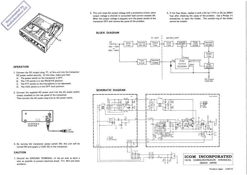d by.EUPREPARATION2.t中e power spply unit in和th时oh时sc解eICOMINSTRUCTION MANUALtow3d边e rear as shown in t价e illust打ton,and attach it to边eRadioAnIC-PS25Before performing amy work on the set.make sure that the powerchassis by the supplied screws.Pas the DC power connector,P1,through the hok which wasINTERNAL POWER SUPPLY UNITcord is unplugged from the transceiver.cloped bry the PLATE (A)before.(DC13.8V 8A SWITCHING REGULATOR)Remove the top and bottom cowers by unsorewing the six screwseach on the top and bottom,and the two screws on eoch side.Takecare not to domage the internal speaker.and unplug its conneetor.This instruction manual gives descriptions and installation instructions for the optional power wpply unit for ICOM's base transceiwersIC-271A/E and IC-471A/E.It also provides information you roedwhile using them.Pea现ead all t价e instructions carefu重before installation so youwill get maximum pertormance and full value from the set.鞋装胶图SPECIFICATIONSNumber of SemiconductorsTransistor2G1Diode6Input Voltags110W220VAC5060Hz间Allowable Voltage Flctuation±10%e4 input voltag别lsuitable lne voltagelInput Capocity230VA lat BA loadl3.Pass the DC power cable attached P1 through the hole of the ACOutput Valtage13.8V DC Negative groundpower socket plate as shown in the iuntration,then insert theMax,Load Current8A 110 mins ON/10 mins OFF]bushing into the hole.Dimentions207W.475(H0x92I0)mmAttach the AC power socket plate to the position where theWeightAppro%.10k每ASSEMBLY PROCEDUREPLATE (A)was attached before,by using the screws described inKit IncludedMain UnitPower Sodket Unit1.Tum the trangoeiver upside down.Remove the 'PLATE (A]"1.so that the AC power socket is toward the bottom of the set.AC Power Cordattached to the rear panel by the four.ThaseSpare Fusesscrews will be uted later.Installation SorewsSCREWS-PLATE IAL84.Conneet P2 connector of the power supply unit with P2 of thepower sock时unit5.Connect the internal speaker comnector and repllace the bottomand top covers of the set.Plug P1 of the power supply unit to the DC power socket of theset.Unit