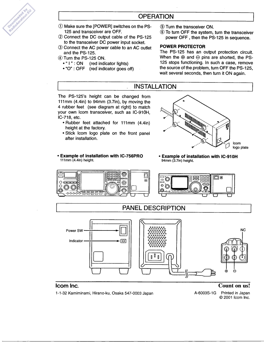 @cOMThank you for purchasing the PS-125 DcINSTRUCTIONSPOWER SUPPLY.The PS-125 is designed foruse with an Icom HF or VHF/UHF all modeDC POWER SUPPLYtransceiver.PS-125Please read these instructions thoroughlybefore operating the PS-125.PRECAUTIONANEVER apply AC voltage that exceeds theKEEP the power supply out of the reach ofspecified voltage for the PS-125 rear panel.children.Excessive voltage could cause a fire or ruinthe power supply.USE the power supply with an Icom transceiv-er only.Other brands may have different pin·△NEVER expose the power supply to rain,assignment.snow or any liquids.USE an AC outlet that can supply more than·△NEVER open the top or bottom covers.750VA capacity.AVOID the use of a multi-plugThere are no user adjustment points.Openingadaptor.the case may expose you to electric shock andincorrect reassembly may cause a fire hazard.DO NOT use strong cleaning agents such asbenzine or alcohol.ALWAYS unplug the AC·△NEVER let metal,,wire or other objects touchcable from the AC outlet,then use a dry softany internal components through the slits ofcloth when cleaning the power supply.the cases.This will electric shock.DO NOT place liquids on or near the power.ACAUTION!The socket-outlet must be nearsupply.the DC power supply and must be easilyaccessible.DO NOT place the power supply against wallsor put anything to behind the power supply.·△ACHTUNG!Die Steckdose muB nahe beiThis will obstruct heat dissipation.diesemGerat angebracht und zugangliichsein.SPECIFICATIONS·Input voltage:85-135VAC(USA)187-265V AC(EURO)Max.power consumption750VA(apparent power)400W (effective power)·Output voltage13.8VDC±5%·Max.output current:25A·Dimensions:94(W)×111(H)×287(D)mm(projections not included)4.4(W)x3.7(H)×11.3(D)inWeight3.0kg;6lb 10ozUsable temperature range:-10^Cto+60°C;+14Fto+140'F