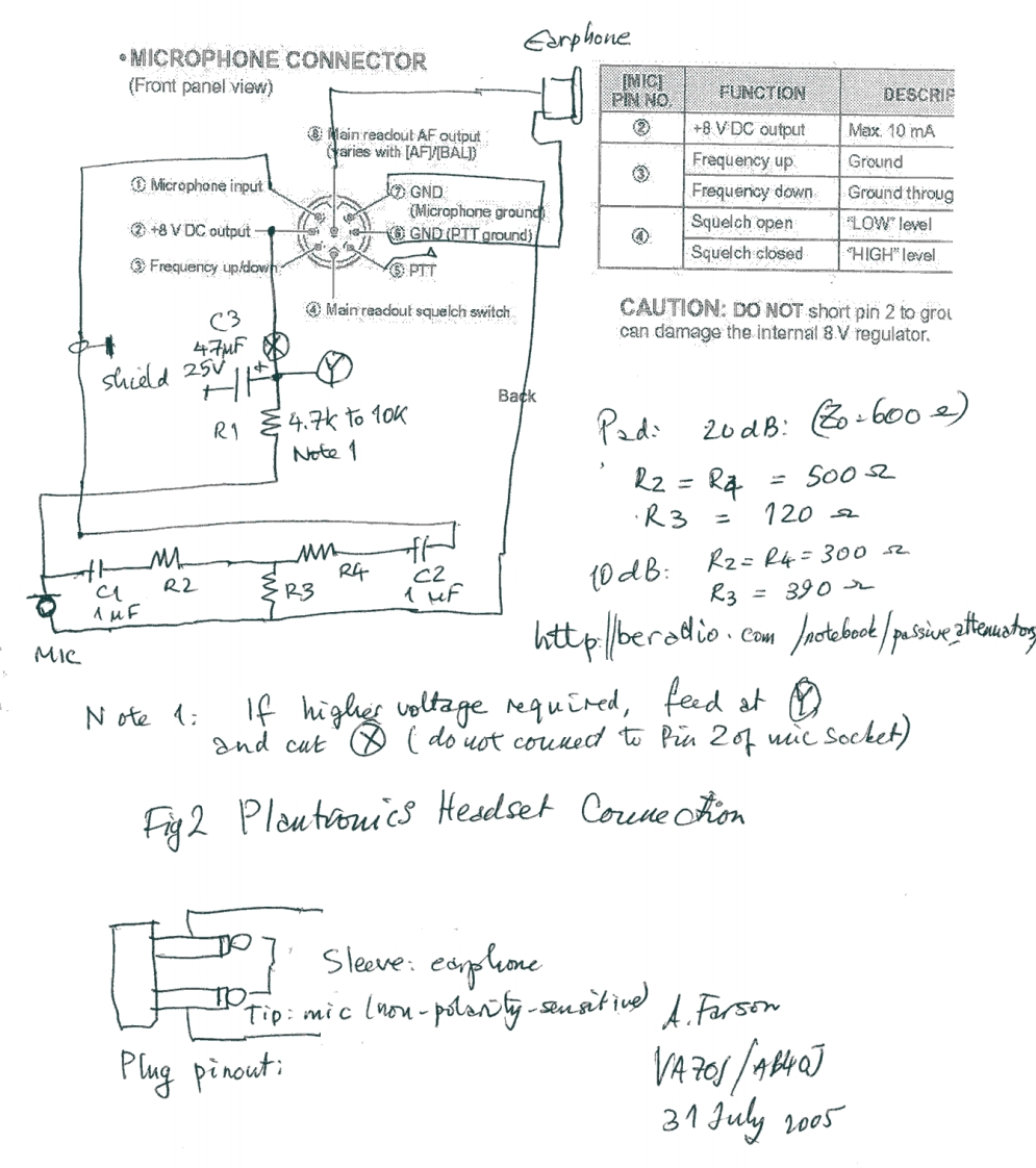 MICROPHONE CONNECTOR(Front panel view)0e1R1PIN NO,FUNCTIONDESCRIP4子k右1和KMain readbut AF output②+8.V DC outputMax.10 mAmicM(varies with [AFV[BAL])Farphone③Frequency upGround①Microphone input②GNDFrequency down.Ground throug(Microphone ground)Ct味Squelch open生OW'leel②.+8 V DC outputGND (PTTground)Squelch closedHIGH"level③Frequency up/down③PTTMain readout squelch switchCAUTION:DO NOT short pin 2 to groucan damage the internal 8.V regulator.R1,ch required if feoding eactrermic from +8VBackC1vequired if wic cloment isdynanicEloctret can also be td from Pin 1itonR1,C1wot needed,