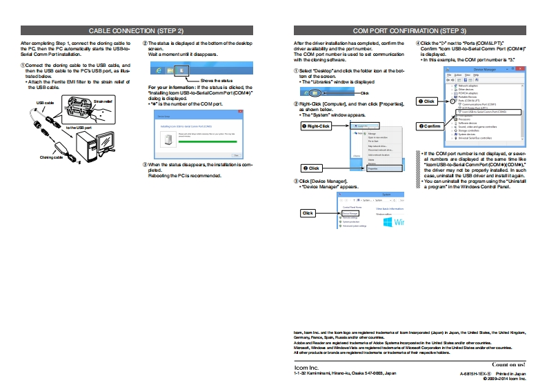 ICOMINSTRUCTIONSThank you for purchasing one of the OPC-478UC/SPECIFICATIONSSYSTEM REQUIREMENTSCLONING CABLES0PC-9eeUN0PC-1122UN0PC-18620PC-2338/OPC-478UC OPC-966UOPC-2344 CLONNG CAOLE The doring cabks ardesigned to connect an loom transosivenscaiveA PCwth the folowin的se女血ad:OPC-1122UOP℃-1862and a PC for dara cloning using loom doning sof0PC-23380PC-2344OC D 4E0C(32F0+140问Mocoo Windows 83264OPC-2338OP℃2344Pka0mdhe0is道ash0 oughy befone u净0a9-10D0日0(+14F0+140问Mocao Windows Vista3264+Ca山e langth年prooimatly+AUSB 11 or20 port0P℃47aC520mm205in过s】%e8日iver camot be used with“Taas0he的230mm98中8司OPC-1637 (USB cade)of Microso Windows&1 and Mcroao Win.500mm49aa0dows8.IMPORTANTPRECAUTIONS+igh城年prooimalyOPC-478UC40g14READ ALL INSTRUCTIONS carefully and thoeOPC-SEBU5491904CAUTION:USE ONLY INDOORS!NEVER x-0PC-1122Uw0P℃-2344oughly betee using the doning catlepose he dhtacable to min,snow or any igid.0-C1820P28SAVE THESE INSTRUCTONS!-These instuoNEVER t metaL wire or other o比米ts touch any in0rC-16gUs9ca山0)09(L7厘jdors cortain important satty and operating dataik betemal part of the connecbes.CAUTON:NEVER uso a USa cabl other than heOPC.1637.DO NOT extand the USB cable.WhenUSB DRIVER INSTALLATION(STEP 1)EXPLICIT DEFINITIONSthe cabl longer than 1.5 m (4.9 is used,a dataamor may oocu.+Whan instaling the USB driver.log in as the ad.DO NOT use harshsdvens guch as berzine or aloo.s业aog.Wiard Conpltaf appearsClick [Fnish]WORD+These instructions are based on using WinDERINITIONhol when deaning.as中yil鱼mage中eca山s.00MM8Ersure that your PC aupports U3日pc年9anyCAUTION5年men酸鱼mag0mayC0cu+eeG年ayed daog boo线indictions or年aacofirming the Uhivarsal Sarial Bus contdkr is in hePG Dovice Man3gtions may diftr sighdly ton the folowing nstuc.回yNOTENo risk of persond injuary.fire orConnect the doring cable to the PC's USB port di.tom sotngs and8ae0pEk超vdecfy or to a s-powered US8 hubApproodmately 20 mA of ourrent is requined tbe theMake sure Windows has complatodit's startup andSUPPLIED ITEMScloring cade Insufident ourrant capadry df he USBport can cause unstable cloning cperation and a dataIisart he suppliad CD into the CD dirive③Dobl ci1o0MUs9 Driverins tallr_且dcentained in the CDCloni ng software compatibility+hen店Accoun酸Contrd'appears dick [Yes]CSckFnishtocotine.The Usa type doning oatks OPC478UCNOPC-96EUOPC.1 t22U,are almost the same as the RS-232Ccld0a”to start the US日divar instal tio.NOTE:type doring cbles OPC-478/OPC-06E/OPC-1122.Welcone to the lnstal Shicld Wizard tor ICOM USBTheror.moat fhe loom coning ware which0adal9r日ga年0生pleted (Stap 1 connect the doning cadle to the09047w009C0四0901122Uregire the RS-232C type cabls can be used withPC ()-Windows3acut/a年asdi以1nar.IMPO RTANT:Some lcom cloing software oan onlyselct ports 1 to 4.When soveral peripheral aquip-mert.such as a printer scaner and hard disk ddveare connected b the USB port,the port number aval-a止kahe少ning sofwane may b0 port 5 or higher.5=200-经0c-167090-3填Thersbre,you cannot choose the proper port nuber.e中