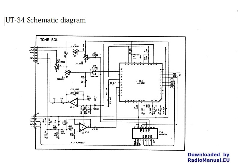 ICOM1Connect the DC power cable to theINSTRUCTIONSINTRODUCTION4 Push the [SET]SWITCH again.transceiver,then push the POWERThank you for purchasing an optionalSWITCH ON.Tone frequencies are memorized on theUT-34UT-34 Tone Squelch unit.Use this unitVFOVFO A/B or memory channels.with IC-275 and IC-475 series base trans-45.000.0FMFOEceivers for interference-free communica45.000.0TONE SQUELCH UNITtions with other stations equipped with a②Push the[T-SQL】SWITCH.TONE-S"TONE-ISTone Squelch System.appears on the FREQUENCY DISPLAY.⑤Push the[T-SaL】SWITCH again,andINSTALLATIONEMF0目the tone squelch will turn OFF.Detach the power cable and turn OFF theAttach this unit to the rear of the145.000.0TONEHOW TO USE THE TONE SQUELCHpower switch before installing this unit.speakerSYSTEM3 Push the [SET]SWITCH and the tone1Remove the top and bottom covers.frequency appears on the DISPLAY.The transceiver squelch will be opened by5 Connect P46 (6 pins)from the MAINsignals which have the same programmedUNIT to J1 (6 pins)on this unit.2Unplug the connector of the speakerSet the required tone frequency bytone frequencies.cord from the MAIN UNIT.6 Connect P47 (5 pins)from the LOGICusing the TUNING CONTROL.and FRONT UNITS to J2 (5 pins)onOperate the transceiver in the usual manner③Remove the PA UNIT.as explained in the transceiver instructionthis unit4688.5manual.TONE--P46 (6 pins)①Set the FM mode.P47 (5 pins)fromMAIN②Set tone frequency.UNITTone frequency list[Unit:Hz]Memory channels will store tone-P167.0110.9173.8PA UNITfrequencies for easy operation.Sp.71.9114.8179.9Speaker cord74.4118.8186.2.When operating with the TONE77.0123.0192.8SQUELCH unit,confirm that the7 Re-plug the speaker connector cord and79.7127.3203.5station you wish to communicate withis using the same tone frequency.replace the top and bottom covers.82.5131.8210.785.4136.5218.1OPERATIONWhen the transceiver receives a subau-88.5141.3225.7diable tone,a humming sound is emit-The same tone frequencies of other stationsSUBAUDIBLE TONE NUMBER PRO91.5146.2233.6ted from the speaker,opening themust match that of the UT-34 in order forGRAMMING94.8151.4241.8squelch.This humming noise isthe unit to function properly.100.0156.7250.3normal.103.5162.2The UT-34 is eauipped with a subaudibletone encoder/decoder function which107.2167.9ICOM INCORPORATEDallows individual programming of 37 dif-1-6-19,KAMIKURATSUKURI,HIRANO-KU,ferent tones in the 67~250.3Hz range.Downloaded byOSAKA 547,JAPANThis function also controls the squelchIT-SQL】[SET]RadioManual,EUON and OFF operation in the transceiver.A quality scan/PDF-conversion from www.rigpix.comA-0848Printed in Japan
