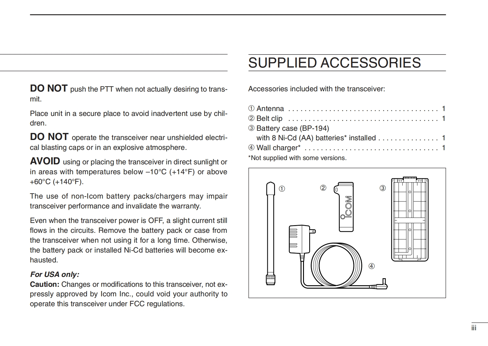 COMINSTRUCTION MANUAL144 MHz FM TRANSCEIVERT2HThis device complies with Part 15 of the FCC rules.Operation is subject to the following two conditions:(1)This device may not causeharmful interference,and(2)this device must accept any interferencereceived,including interference that may cause undesired operation.Icom Inc.