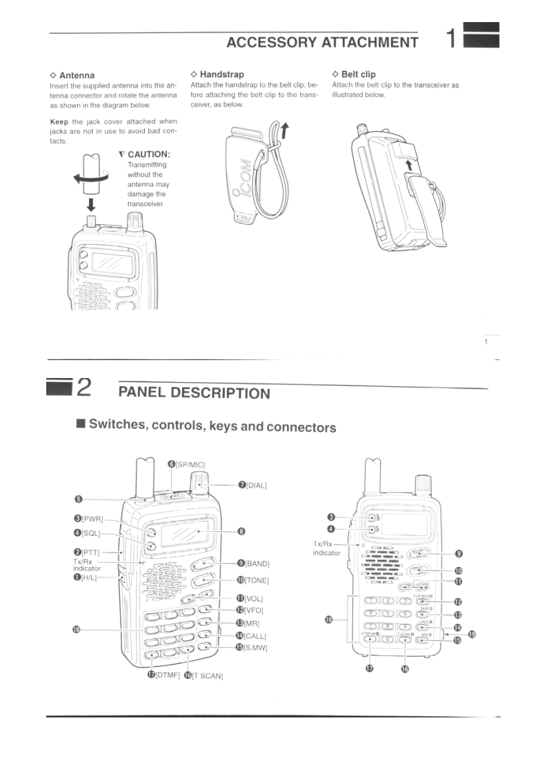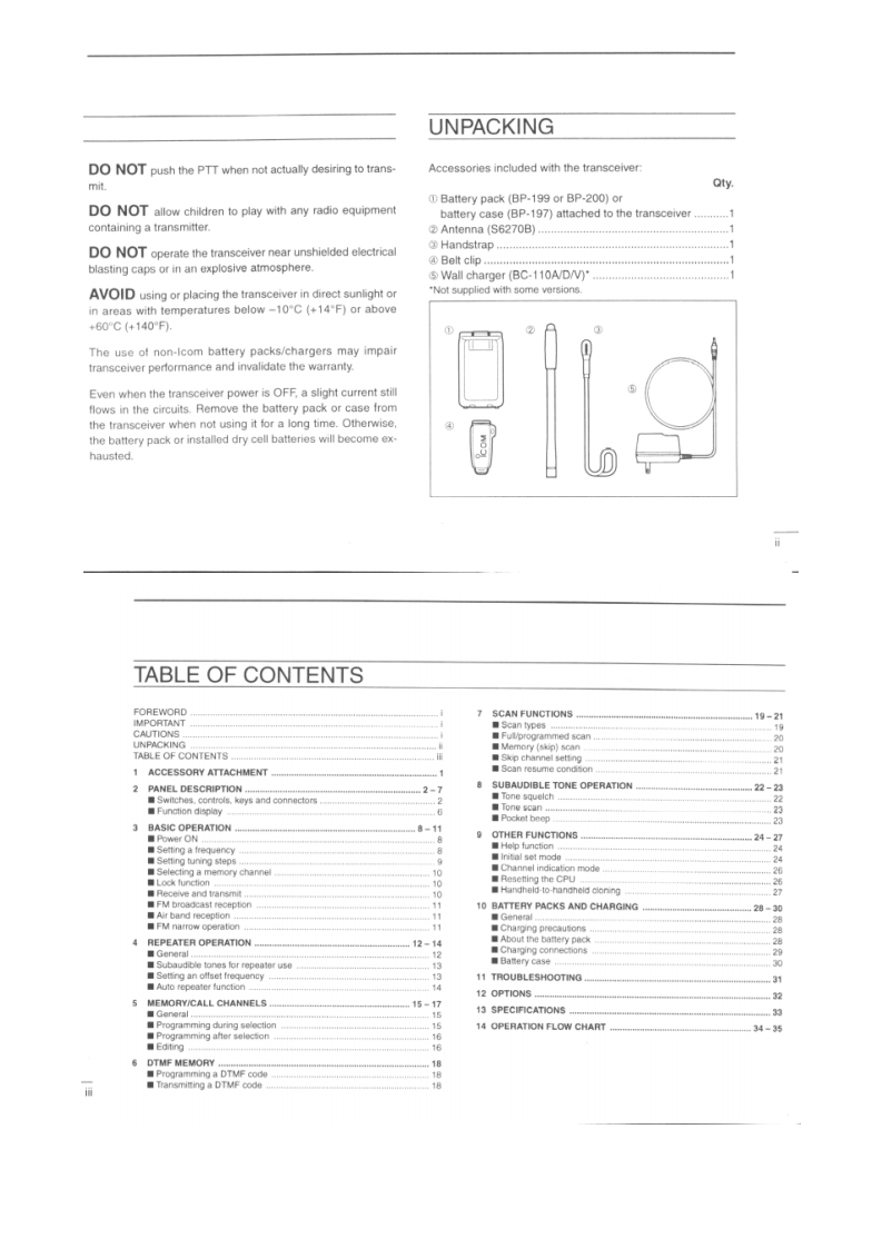 INSTRUCTION MANUALFM TRANSCEIVERS-T85haul interferenc and (2)this device must accpt any norurenceuceived,including interfornce that may cause undesired operation.Icom Inc.FOREWORDCAUTIONSThank you for purchasing the IC-T8A or IC-T8E.This prod-AWARNING!NEVER hold the transceiver so that theuct represents lcom's state-of-the-art handheld transceiverantenna is very close to,or touching exposed parts of thetechnology.The IC-T8A/E features tri-band capabilities (VHF.body.especially the face or eyes,while transmitting.TheUHF operation and 50 MHz reception).numerous functionstransceiver will perform best if the microphone is 5 to 10 cmand superior performance-in a package as compact as that(2 to 4 in)away from the lips and the transceiver is vertical.of a single bander.With proper care this Icom product willAWARNING!NEVER operate the transceiver with aprovide years of trouble-free operation.headset or other audio accessories at high volume levels.Hearing experts advise against continuous high volume op.eration.If you experience a ringing in your ears,reduce theIMPORTANTvolume lovel or discontinue use.NEVER connect the transceiver to an AC outlet or to aREAD ALL INSTRUCTIONS carefully and completely beforepower source of more than 16 V DC.Such a connection willusing the transceiver.damage the transceiver.SAVE THIS INSTRUCTION MANUAL-This instruction man-NEVER connect the transceiver to a power source that is DCual contains important operating instructions for the IC-T8Afused at more than 5 A.Accidental reverse connection will beand IC-TBEprotected by this fuse.higher fuse values will not give any pro-tection against such accidents and the transceiver will be ruined.The IC-TBE complies with essential requirements of theNEVER attempt to charge alkaline or dry cell batteries.Be89/336/EEC directive for Electromagnetic Compatibility.aware that external DC power connections will charge batter-This compliance is based on conformity with the ETSIies inside the battery case.This will damage not only the bat-specification ETS300 684 (EMC product standard fortery case but also the transceiver.Commercially Available Amateur Radio Equipment)