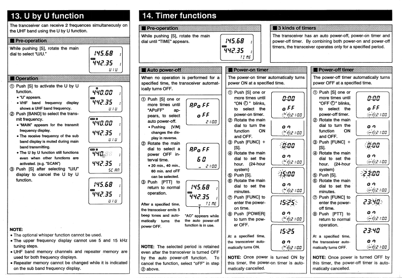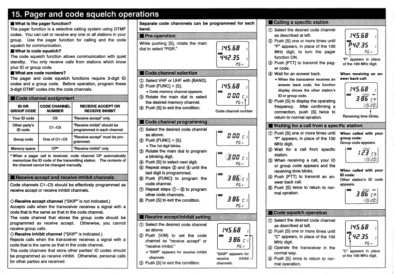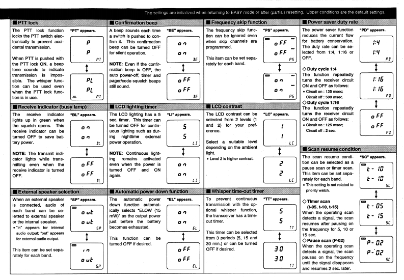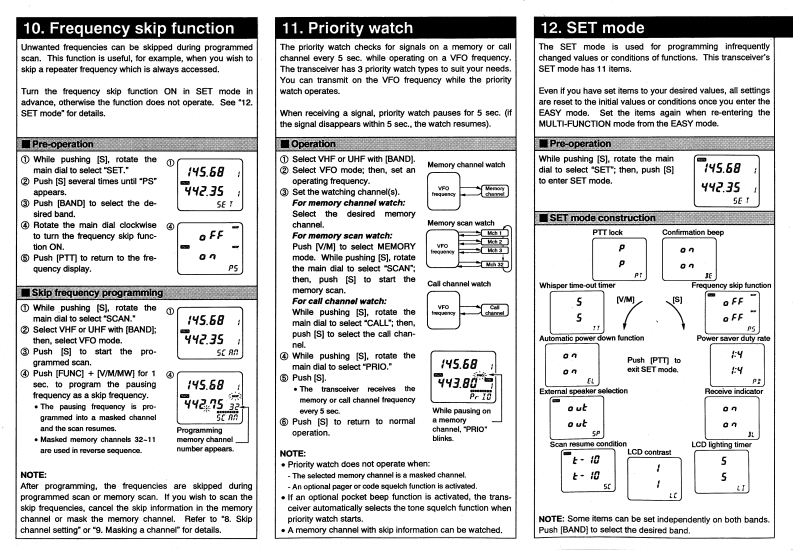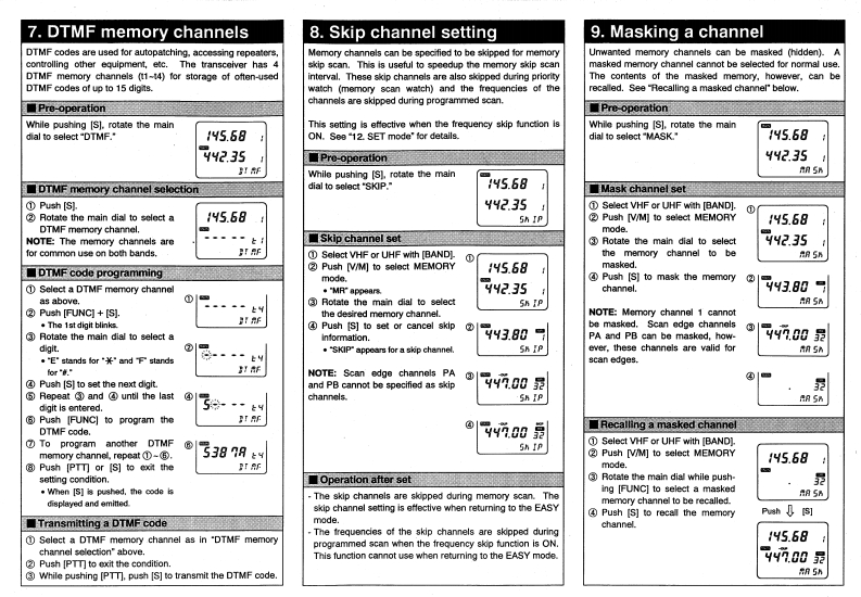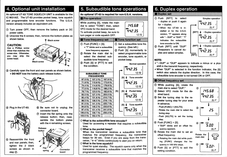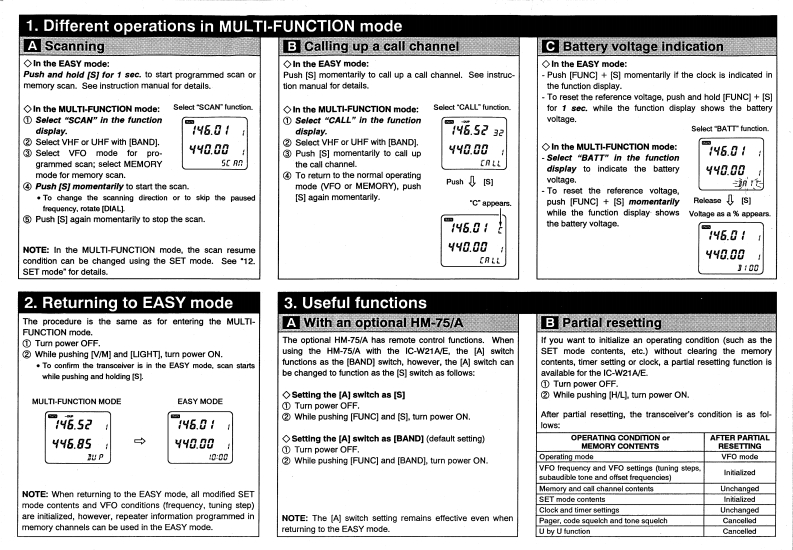 To activate advanced functions,please learnHow to expand functionsthe operations on this page completely.ICOMEASY mode and MULTI-FUNCTION modeI Selecting a functionThe IC-W21A and IC-W21E have an EASY mode and aPush and hold [S]until the function indicator flashes.MULTI-FUNCTION mode.While continuing to push [S].rotate the main dial to selecta desired function.EASY made covers all basic functions such as transmitting.③Release [S.]recelving,scanning.clock settings,LCD Eghting.etc..essen-tial for daily operations.②Rotate theTECHmain dial.Repeater operation with default settings is also possible.Ifyou program repeater information,including offset frequency45.68and subaudible tone frequency,into memory channels in theMULTI-FUNCTION mode,this information can also be used2.35in the EASY mode.E:8The MULTI-FUNCTION mode has many advanced functions,①Push andTALKhold [S].such as subaudible tone setting,*offset frequency setting.Release [S]timer,memory skip/mask,priority watch,DTMF memories,etc.This Tech Talk gives you information about thesefunctions which is not described in the instruction manualOptional for non-U.S.A.versions.Entering the MULTI-FUNCTION modeSelectable functions①Turn power OFF.FUNCTIONFUNCTIONSREF.INDICATORSECTIONMulti-function②While pushing [V/M]and [LIGH可.turn power ONS00.To confirm the transcelver is in the MULTI-FUNCTION mode,Time indication5C AAScan1Aoperation guidethe clock indication or BATT"blinks whie pushing and holdingrDTMF memory channels7[5].TO RE*Tone encoder.tone squelch.pocket beep4.5BUPDuplex set,offset froqucney sat6P5Pager,code squelch15Iew经抢Pr itPrority watch11SA IPSkip channel setting8,10ER SNMasking a channelTI AETimer functions14SE TSET mode12CALLCall channel18POWER]U by U function13JA ITBatlery voltage indication1C[UGHTAn optionall UT-63 is necessary for non-U.5A.version8.Icom IncNOTE:Al (Artificial Intelligence)in the transceiver automat-ically memorizes the order of selected functions.188