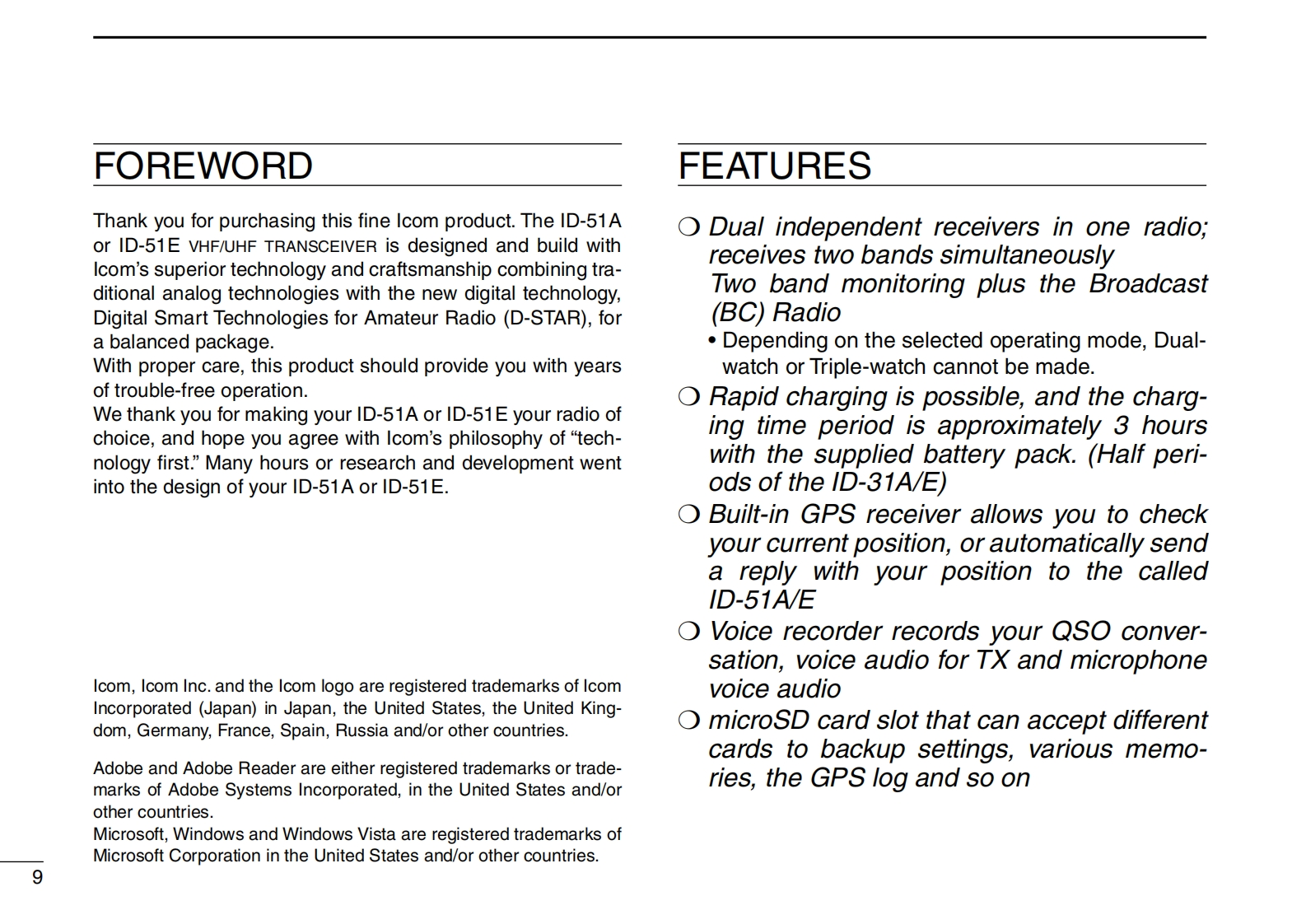 icOMBASIC INSTRUCTIONSLet's begin using D-STAR!VHF/UHF TRANSCEIVERID-51AVHF/UHF TRANSCEIVERID-51EThis device complies with Part 15 of the FCC Rules.Operation issubject to the following two conditions:(1)this device may not causeYou can easily begin usingharmful interference,and (2)this device must accept any interferencereceived,including interference that may cause undesired operation.D-STAR repeaters!WARNING:MODIFICATION OF THIS DEVICE TO RECEIVE CEL-LULAR RADIOTELEPHONE SERVICE SIGNALS IS PROHIBITEDUNDER FCC RULES AND FEDERAL LAW.Icom Inc.