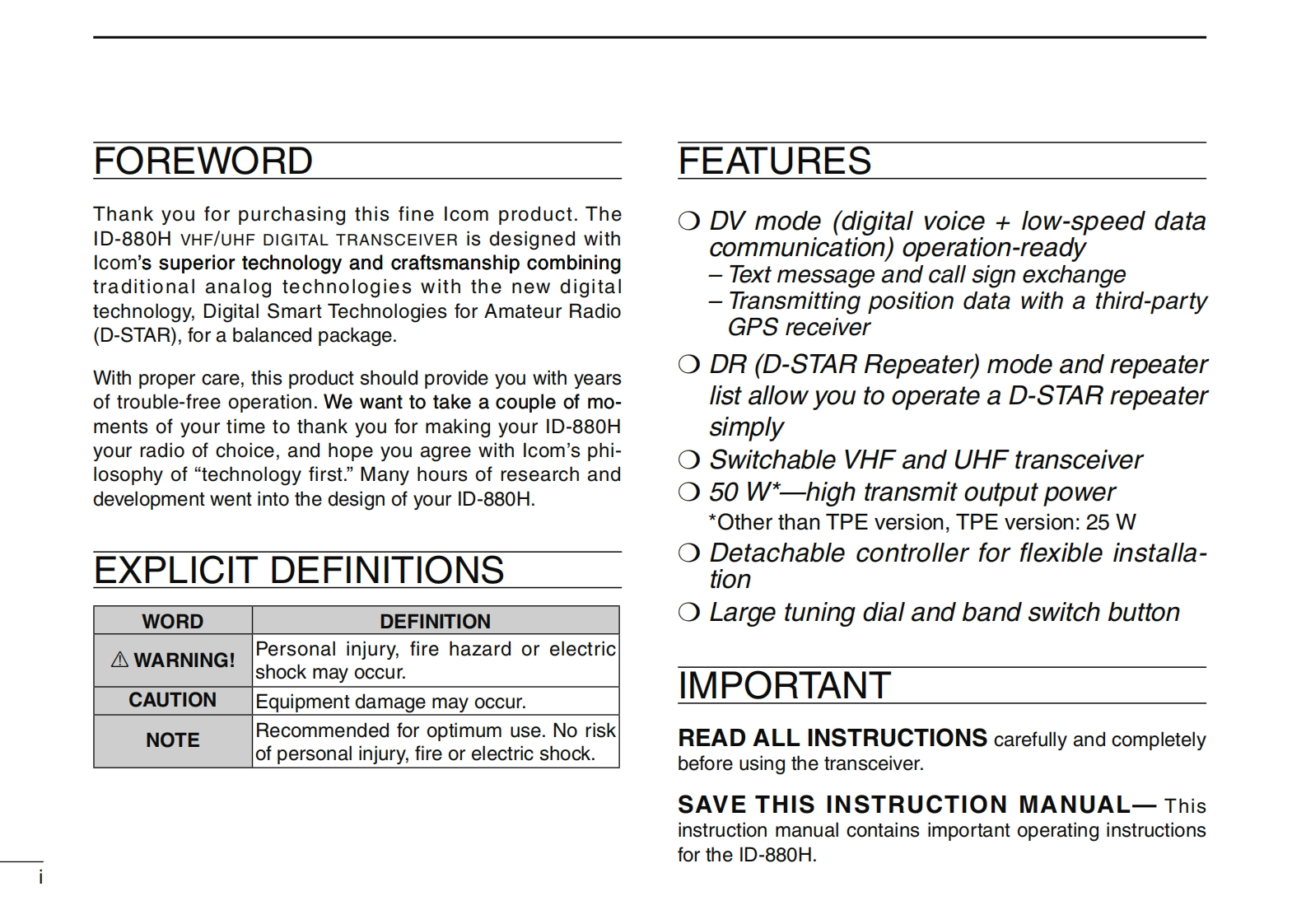 icOMINSTRUCTION MANUALVHF/UHF DIGITAL TRANSCEIVER1D-880HD-STARID-880H°This device complies with Part 15 of the FCC Rules.Operation is四前6四四subject to the following two conditions:(1)this device may not causeharmful interference,and (2)this device must accept any interferencereceived,including interference that may cause undesired operation.WARNING:MODIFICATION OF THIS DEVICE TO RECEIVE CEL-LULAR RADIOTELEPHONE SERVICE SIGNALS IS PROHIBITEDUNDER FCC RULES AND FEDERAL LAW.Icom Inc.