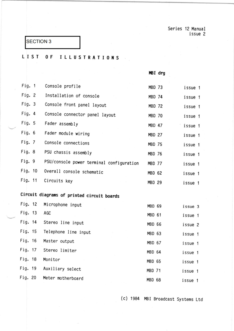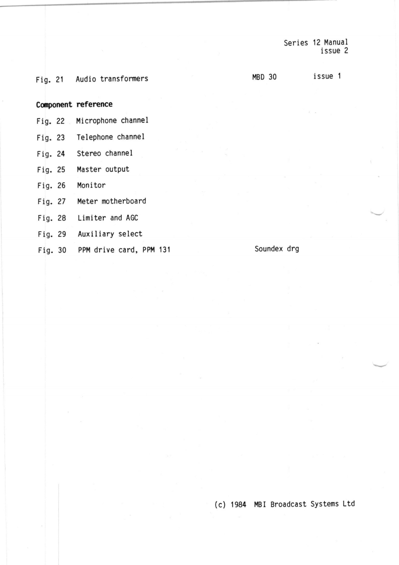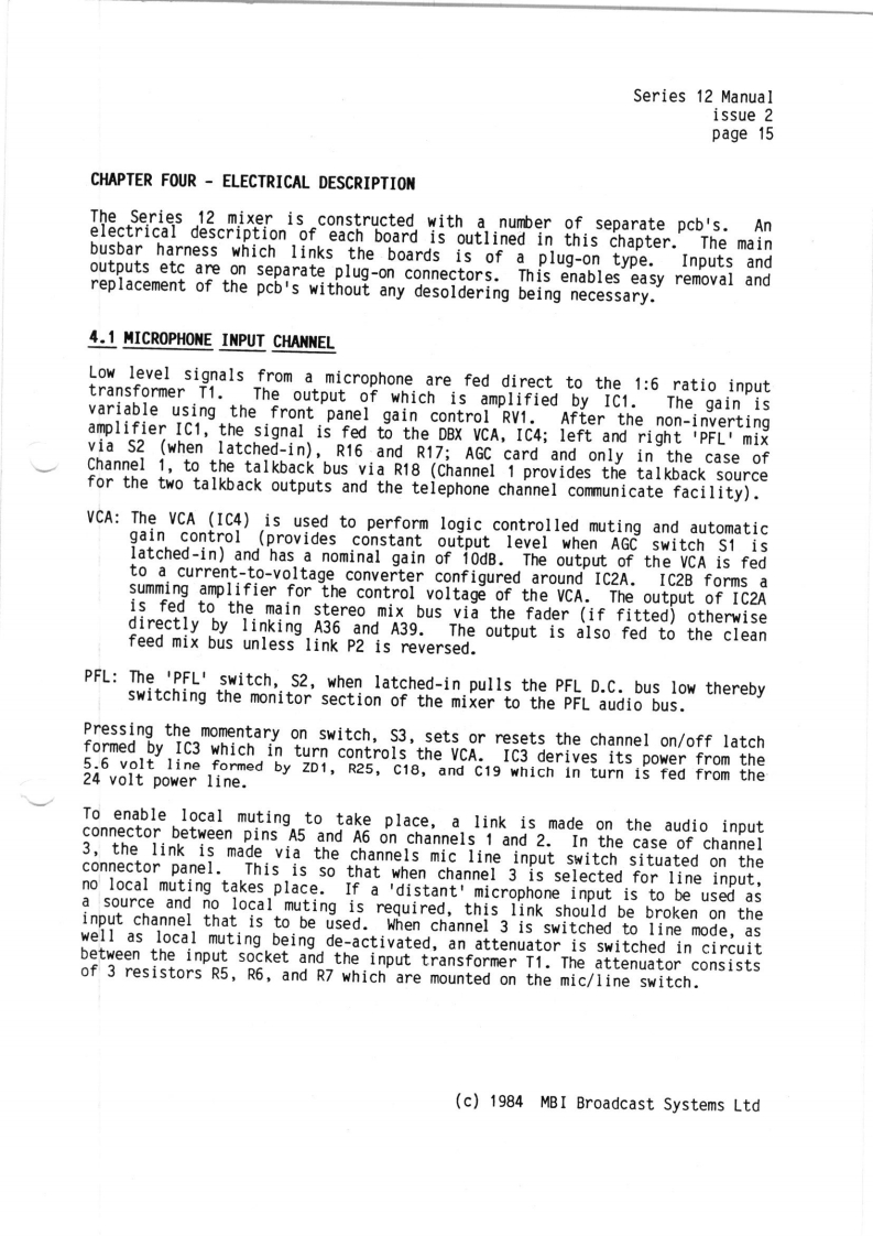 Series 12 Manualissue 2INTRODUCTIONThe Series 12 mixing console is designed for full stereo operation throughout,but can be used in a mono mode if required.It is primarily designed for usein applications where a simple operation is required such as in busynewsrooms,dubbing suites,and outside broadcasts.The mixer will'fully meetIBA technical specifications and may be used in a number of differentoperational configurations.It is ruggedly constructed and its circuit designis of modular construction.It consists of three components:the mixer,power supply,and optional Pennyand Giles fader pack.Each component may be 19"rack mounted and mountingbrackets with handles are supplied if specified.Alternatively,the systemmay be fitted in console woodwork or a flight case.The mixer and power supplymay either be used on their own or linked with the fader pack which can beretro-fitted after purchase.The mixer is equipped with two microphone inputs,one switchable mic/lineinput,a mono line/telephone input which generates a clean feed of mixeroutput,four stereo line inputs,and a stereo line input selectable betweenfour stereo sources.It also has three separate monitor feeds:guestheadphones,presenter headphones,and monitor loudspeakers,each with theirown individual volume controls.This manual gives a detailed description of the mixer and all the informationnecessary for the correct installation and maintenance of the equipment.MBI Broadcast Systems Limited reserves the right to modify any specificationsor drawing in this manual without notice.(c)1984 MBI Broadcast Systems Ltd