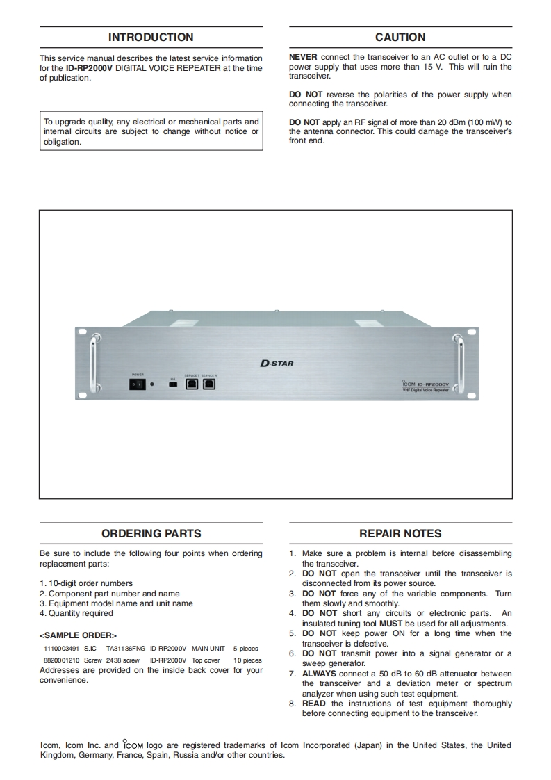 ICOM艾可慕ID-RP2000V_serv维修手册含电器原理图找手册网31天前发布关注私信3.79MB31页045ICOM艾可慕ID-RP2000V_serv维修手册含电器原理图此内容为付费资源,请付费后查看¥19¥21黄金会员免费钻石会员免费登录购买付费资源 第1页 / 共31页 第2页 / 共31页 第3页 / 共31页 第4页 / 共31页 第5页 / 共31页 第6页 / 共31页 第7页 / 共31页 第8页 / 共31页 第9页 / 共31页 第10页 / 共31页 试读已结束,还剩21页,您可下载完整版后进行离线阅读 THE END艾可慕 文本预览 GcOMSERVICEMANUALDIGITAL VOICE REPEATERID-RP2000VS-14308XZ-C1Dec.2006Icom Inc. 查看更多 收起部分 喜欢就支持一下吧收藏