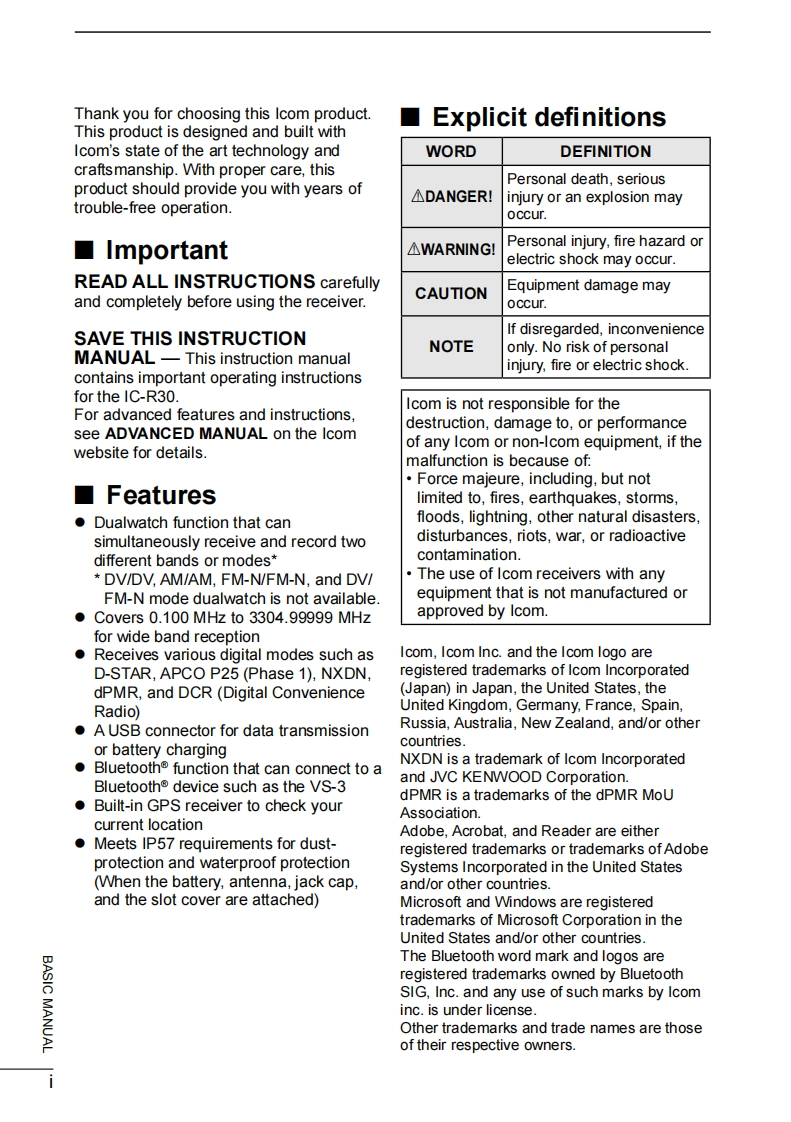 icomBASIC MANUALCOMMUNICATIONS RECEIVERIC-R30COM+9120四AMEThis device complies with Part 15 of the FCCrules.Operation is subject to the following two121.600conditions:(1)This device may not cause harmfulNar i ta RAPPinterference,and(2)this device must accept any器只212interference received,including interference thatmay cause undesired operation.434.400NAABARBAME03-04WARNING:MODIFICATION OF THIS DEVICETO RECEIVE CELLULAR RADIOTELEPHONESERVICE SIGNALS IS PROHIBITED UNDERFCC RULESAND FEDERAL LAW.1 BAND 2 MHE 3MODE4 SCAN 5 SCOPE 6 SKIP7 ATT 8 MW 9 TSO REC F-INPIcom Inc.1C-30