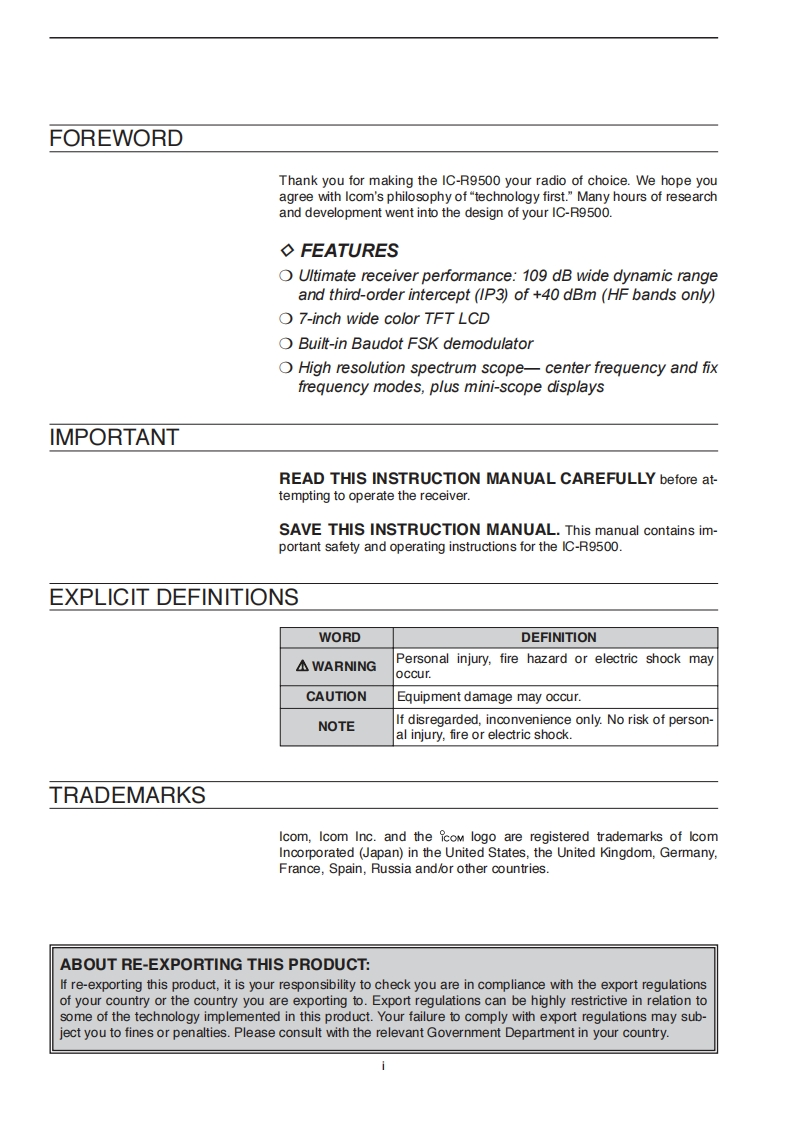 IC-R9500_使用说明书手册找手册网31天前发布关注私信20.33MB194页029IC-R9500_使用说明书手册此内容为付费资源,请付费后查看¥19¥21黄金会员免费钻石会员免费登录购买付费资源 第1页 / 共194页 第2页 / 共194页 第3页 / 共194页 第4页 / 共194页 第5页 / 共194页 第6页 / 共194页 第7页 / 共194页 第8页 / 共194页 第9页 / 共194页 第10页 / 共194页 试读已结束,还剩184页,您可下载完整版后进行离线阅读 THE END艾可慕 文本预览 COMMUNICATIONS RECEIVERIC-R9500Instruction ManualA-6553H1EX-①Printed in Japan©2007 Icom Inc. 查看更多 收起部分 喜欢就支持一下吧收藏
