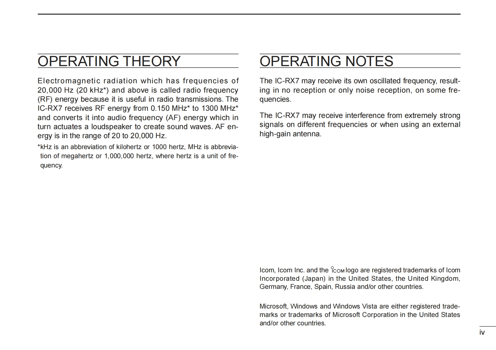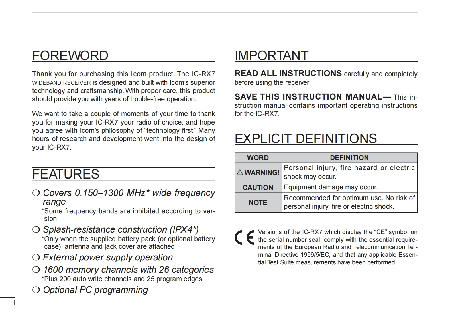 icOMINSTRUCTION MANUALWIDEBAND RECEIVERIC-RX7COMIC-RX7EKME22盟:a9盟This device complies with Part 15 of the FCC Rules.Operationis subject to the following two conditions:(1)this device maynot cause harmful interference,and (2)this device must acceptany interference received,including interference that may causeundesired operation.WARNING:MODIFICATION OF THIS DEVICE TO RECEIVE CEL-LULAR RADIOTELEPHONE SERVICE SIGNALS IS PROHIBITEDUNDER FCC RULES AND FEDERAL LAW.Icom Inc.