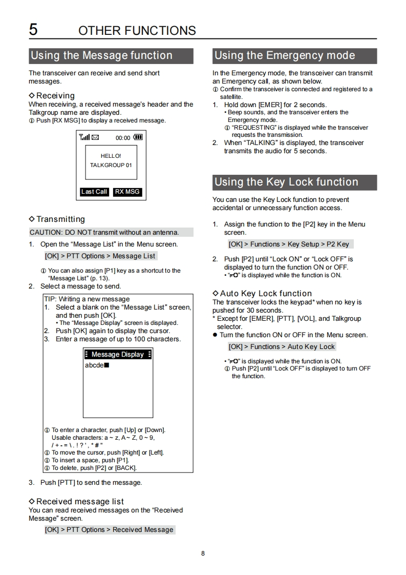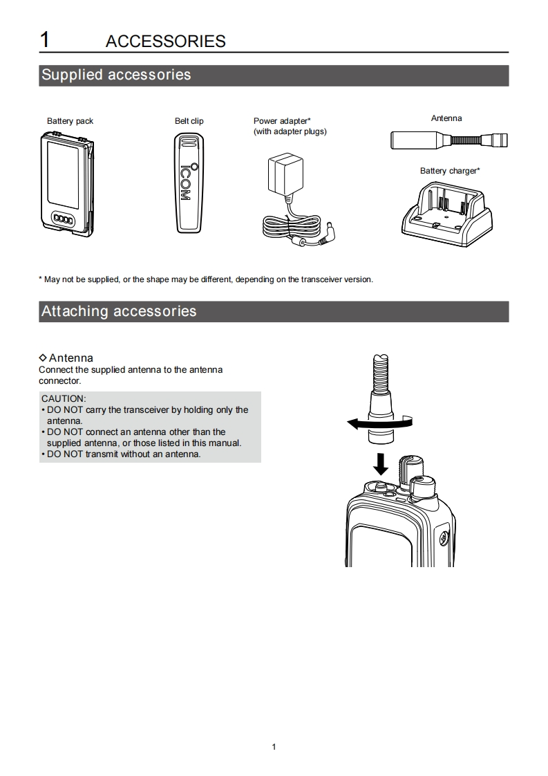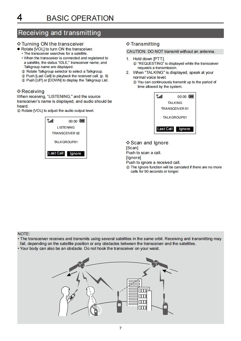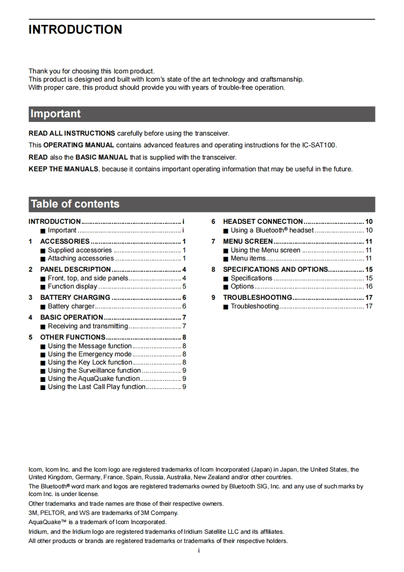 iCOMOPERATING MANUALSATELLITE PTTINTRODUCTIONIC-SATIOO1ACCESSORIES ATTACHMENTS2 PANEL DESCRIPTION3 BATTERY CHARGING4BASIC OPERATION5 OTHER FUNCTIONS6 HEADSET CONNECTION7MENU SCREEN8SPECIFICATIONS AND OPTIONS9 TROUBLESHOOTINGIcom Inc.