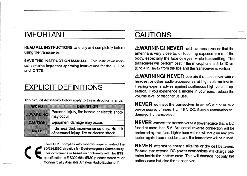 ●)OMINSTRUCTION MANUALDUAL BAND FM TRANSCEIVERSIC-T7A1亡-T7EThis device compfies with Part 15 of the FCC rules.Operation is sub-ject to the following two conditions:(1)This device may not causehammful interlerence,and (2)this device must accept any interferenoerecelved,including interlerence that may cause undesired operation.Icom Inc.