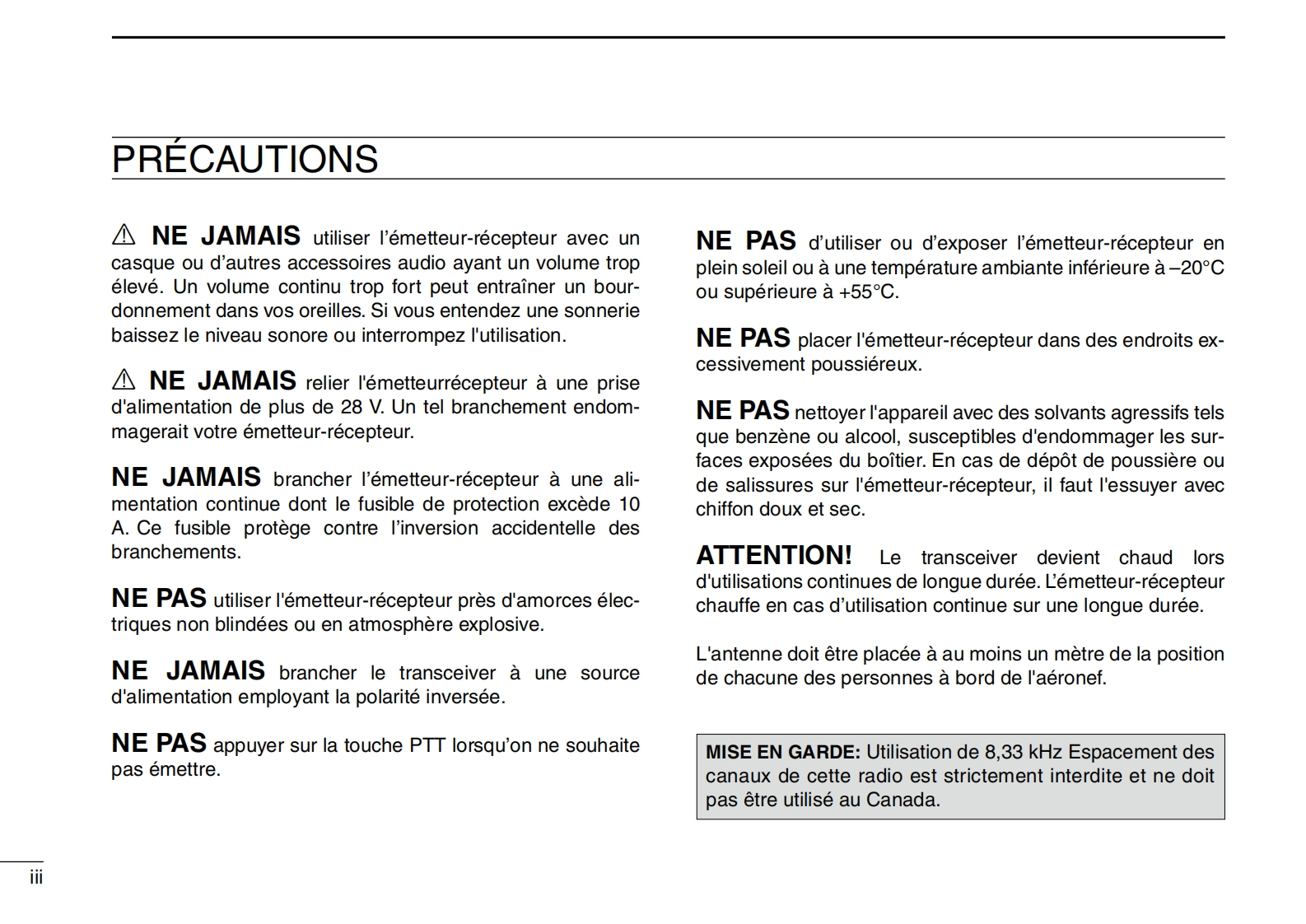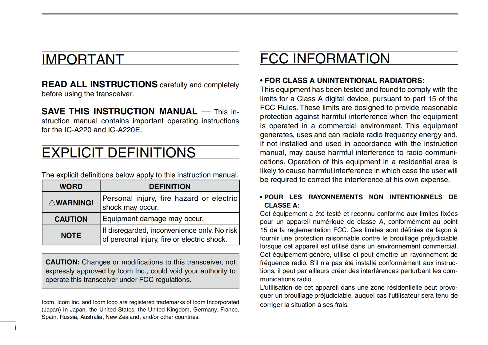 INSTRUCTION MANUALVHF AIR BAND TRANSCEIVERSIC-A2OEDUAL ECCOMRCLCOMMVOLR&118.00136.975MEMOFF1C-A220This device complies with Part 15 of the FCCRules.Operation is subject to the condition thatthis device does not cause harmful interference.Icom Inc.
