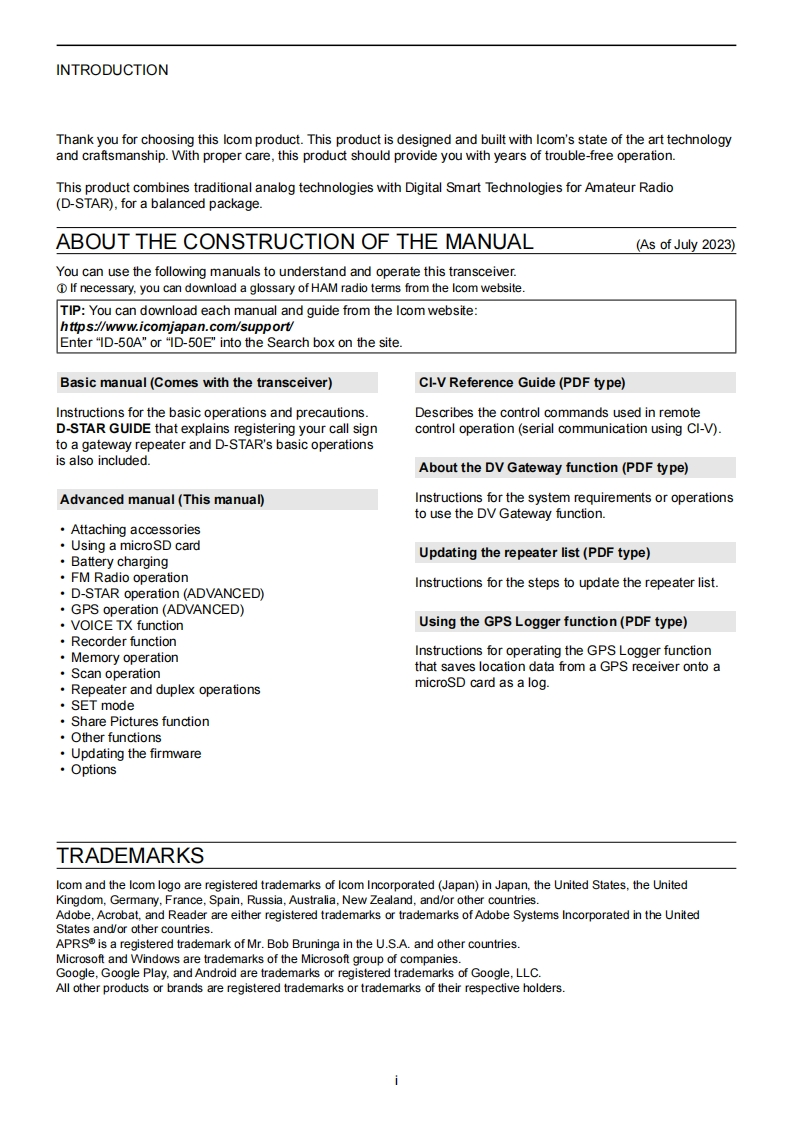 icoMADVANCED MANUALVHF/UHF TRANSCEIVER1 ATTACHING ACCESSORIESB-832 USING a microSD CARD3 BATTERY CHARGING4 FM RADIO OPERATION5 D-STAR OPERATION (ADVANCED)6 GPS OPERATION(ADVANCED)7VOICE TX FUNCTION8 RECORDER FUNCTION9 MEMORY OPERATION10 SCAN OPERATION11 REPEATER AND DUPLEX OPERATIONSThis manual describes instrucfions for advanced features and12 SET MODEinstrucfions.See the BASIC MANUAL that comes with the transceiver forprecautions and basic operations.13 SHARE PICTURES FUNCTION14 OTHER FUNCTIONS15 UPDATING THE FIRMWARE16 OPTIONSIcom Inc.