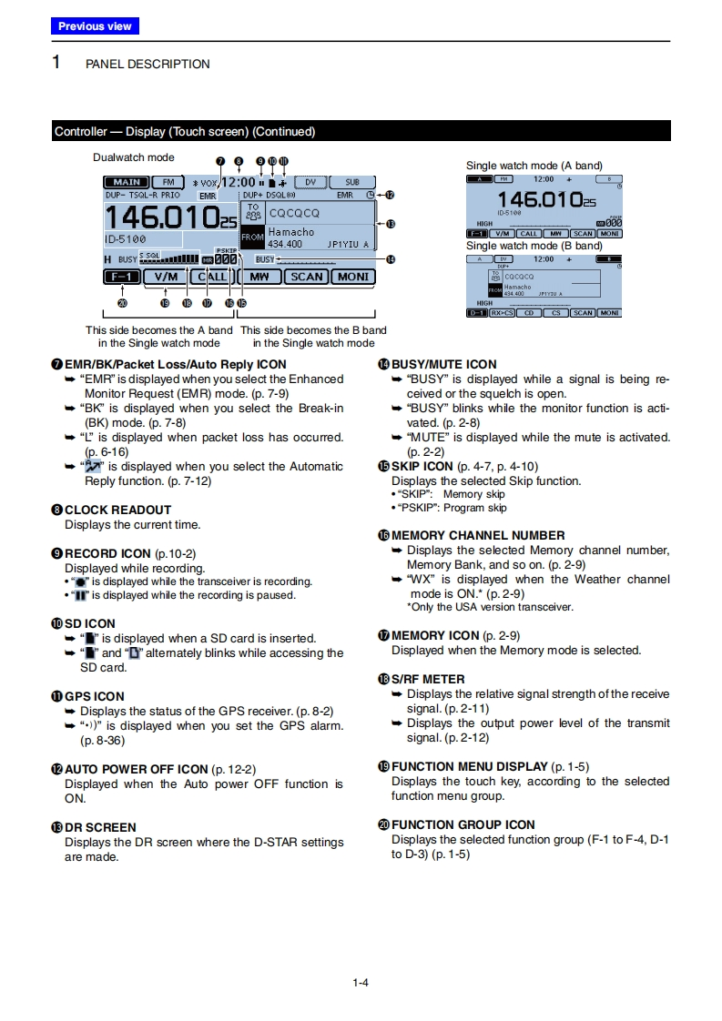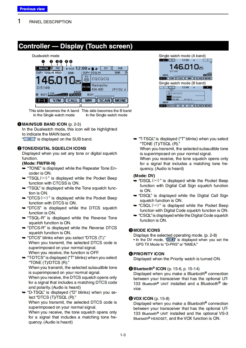 icomTo update the repeater list,click here!FULL MANUALINTRODUCTION1PANEL DESCRIPTION2BASIC OPERATION3MEMORY OPERATION4SCAN OPERATIONDUAL BAND TRANSCEIVER5PRIORITY WATCH1B-38836D-STAR OPERATION 7D-STAR OPERATION 8 GPS OPERATION9 USING AN SD CARD10 VOICE MEMORY11 REPEATER AND DUPLEX OPERATIONS12 MENU SCREEN13 OTHER FUNCTIONS14 OPTIONS15 Bluetooth OPERATION16 SPECIFICATIONS17 MAINTENANCEINDEXIcom Inc.