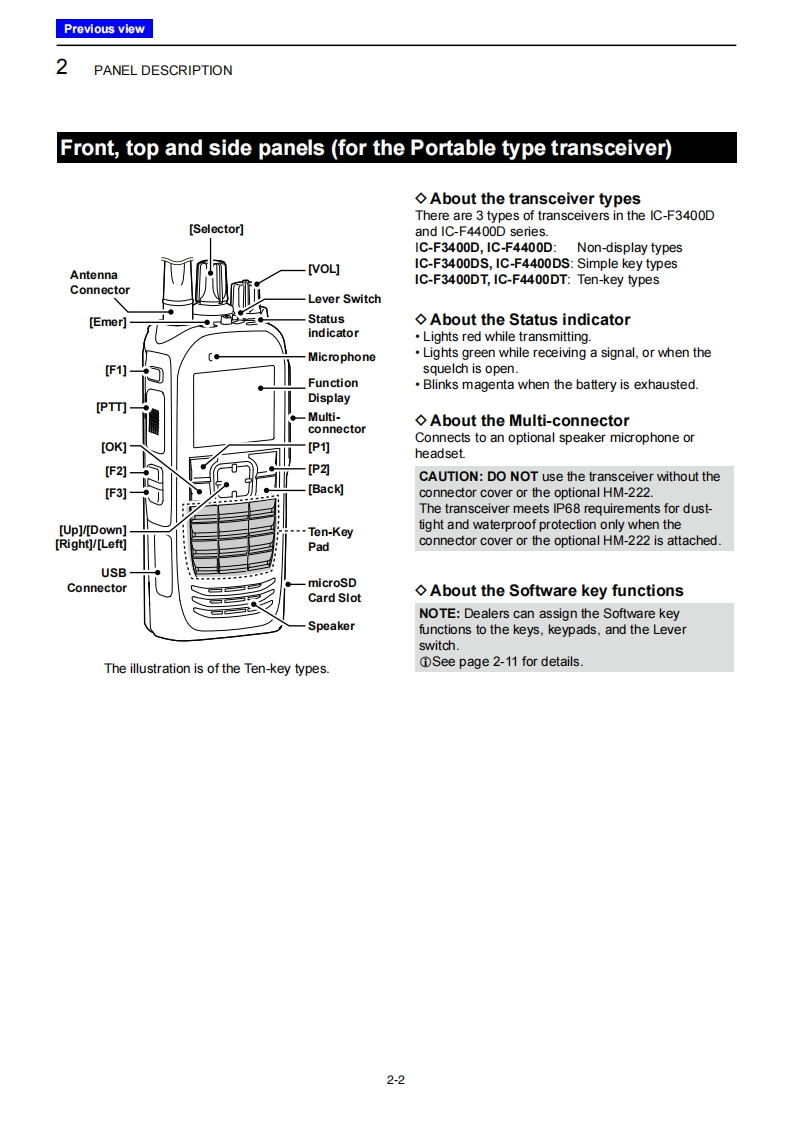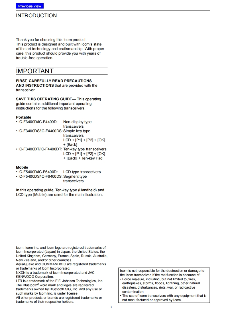 iCOMOPERATING GUIDEINTRODUCTION1ACCESSORIESPANEL DESCRIPTION3BASIC OPERATIONADVANCED OPERATIONVHF DIGITAL TRANSCEIVERS5SCAN OPERATIONIC-F3400Dseries6MENU SCREENIC-F5400D sondesNXDN OPERATIONUHF DIGITAL TRANSCEIVERSIC-F4400D sonles8MDC 1200 SYSTEM OPERATIONIC-F6400D9ABOUT THE microSD CARDseries10VOICE RECORDER FUNCTIONS11Bluetooth®OPERATION12USER SETTINGS13OTHERS14OPTIONSINDEXIcom Inc.