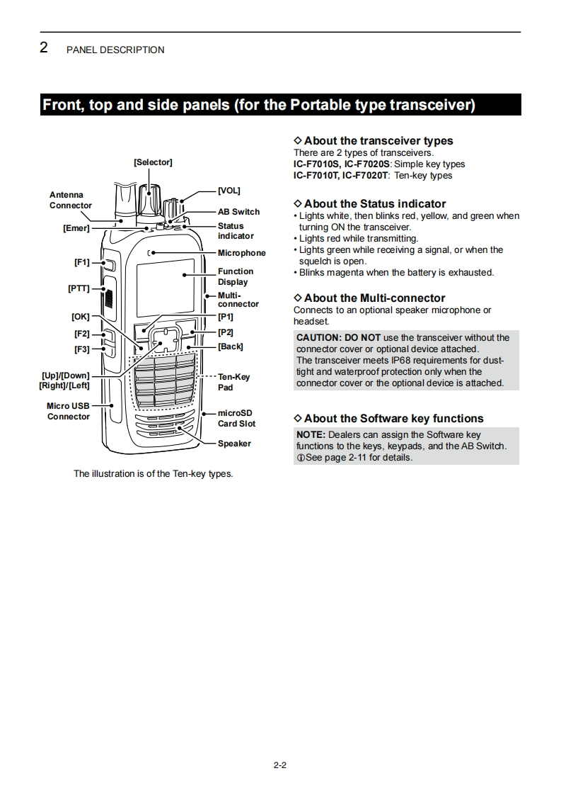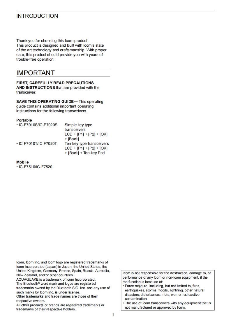 iCOMOPERATING GUIDEINTRODUCTION1ACCESSORIESPANEL DESCRIPTION3BASIC OPERATIONADVANCED OPERATIONVHF P25 TRANSCEIVERS5SCAN OPERATIONIC-F7010 series6MENU SCREENIC-F7510 seriesAPCO P25 MODE OPERATIONUHF P25 TRANSCEIVERSIC-F7020series8MDC 1200 SYSTEM OPERATIONIC-F7520 series9ABOUT THE microSD CARD10VOICE RECORDER FUNCTIONS11Bluetooth®OPERATION12USER SETTINGS13OTHERS14OPTIONSINDEXIcom Inc.