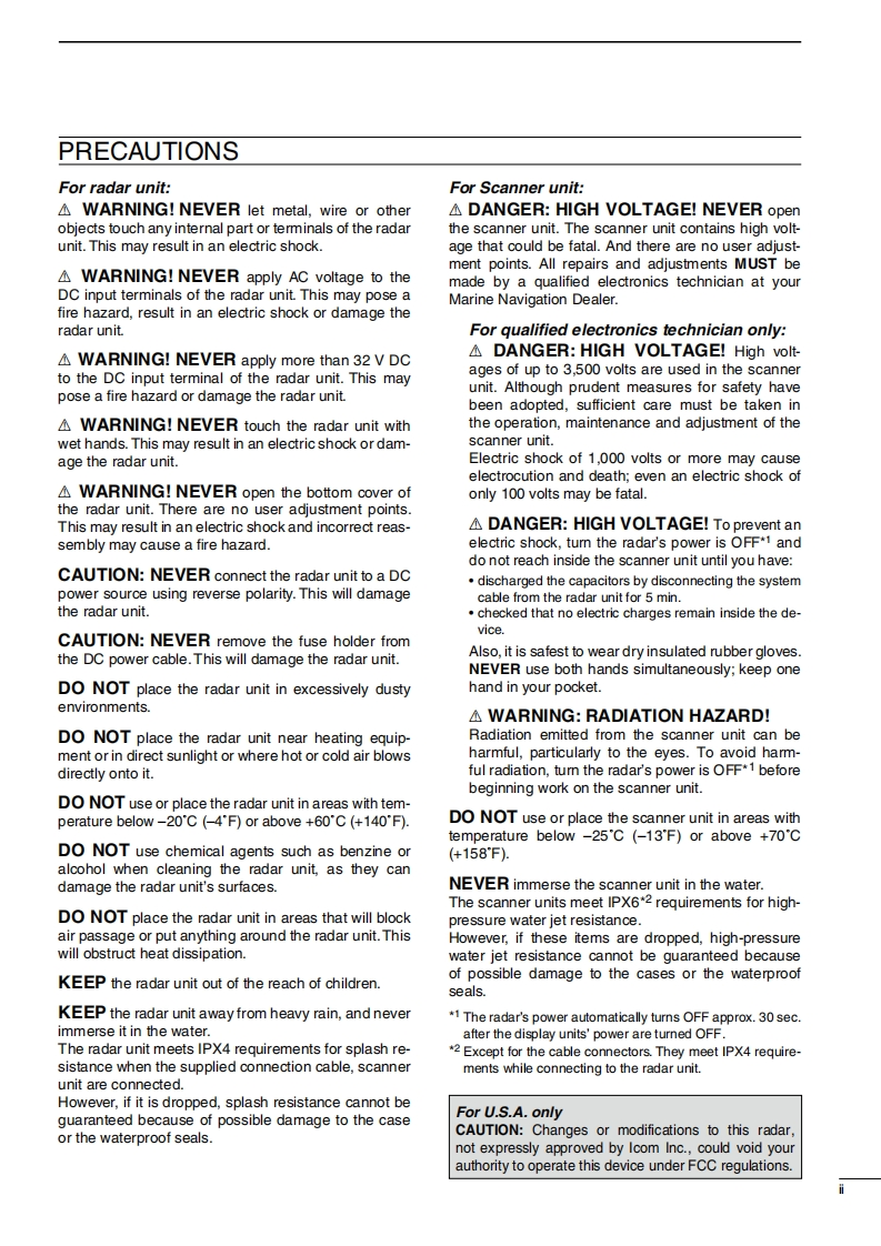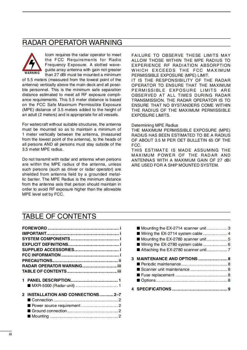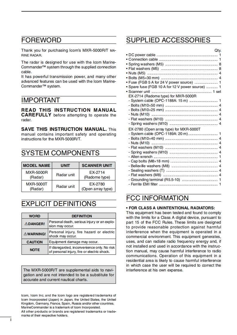iCOMINSTRUCTION MANUALMarineCommanderMARINE RADARMXR-5000R(Radome type)MXR-5000T(Open array type)This device complies with Part 15 of the FCC Rules.Op-eration is subject to the condition that this device doesnot cause harmful interference.Icom Inc.