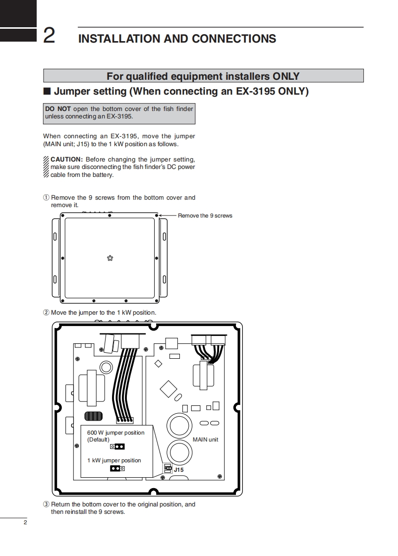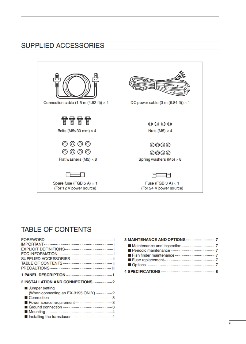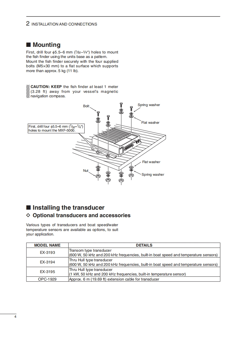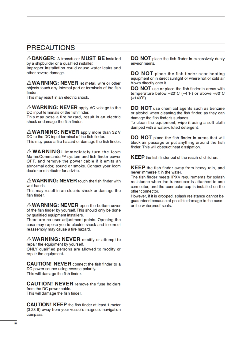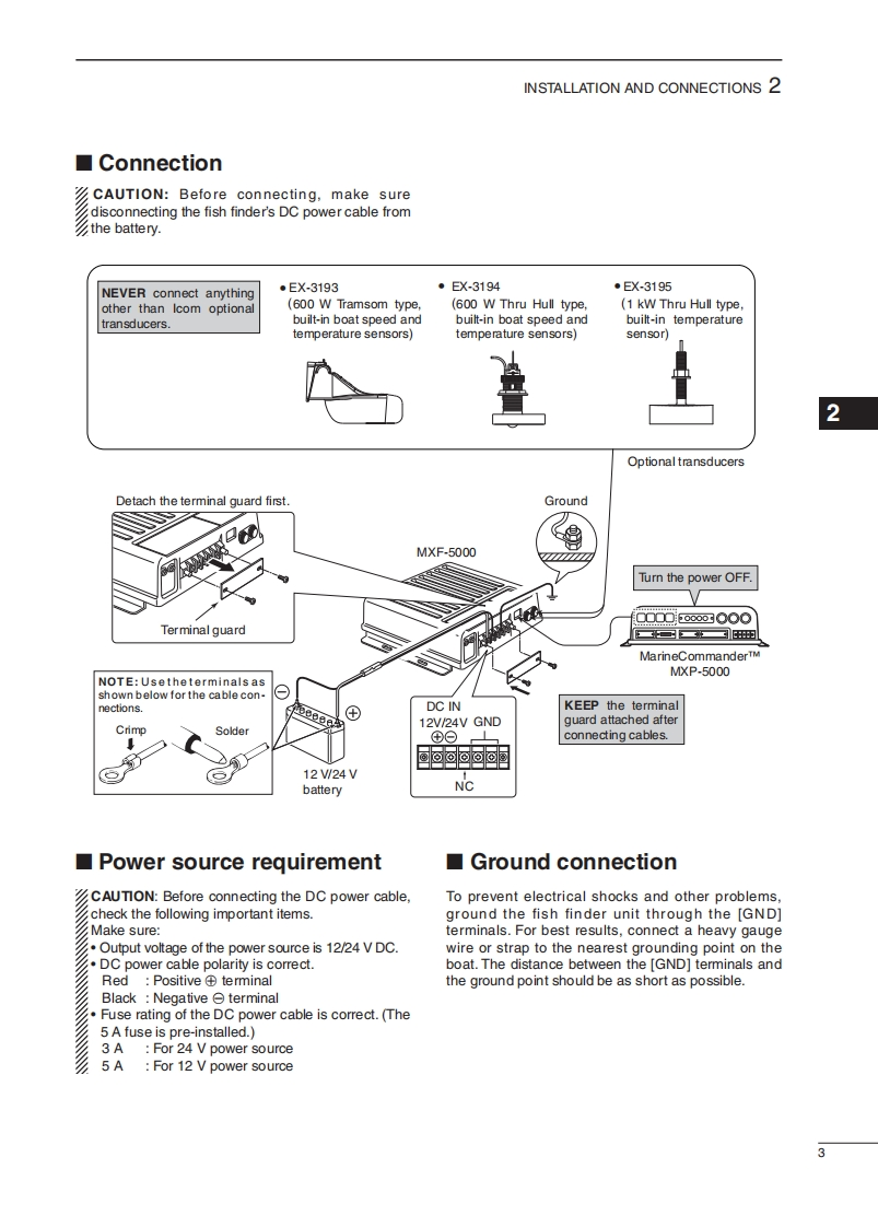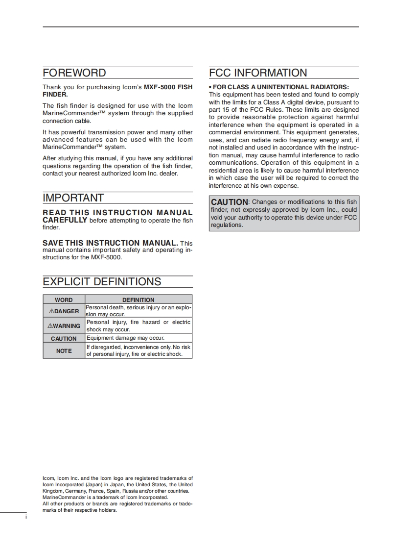 iCOMINSTRUCTION MANUAL④MarineCommanderFISH FINDERMXF-5000This device complies with Part 15 of the FCC Rules.Opera-tion is subject to the following two conditions:(1)this devicemay not cause harmful interference and(2)this device mustaccept any interference received,including interference thatmay cause undesired operation.Icom Inc.