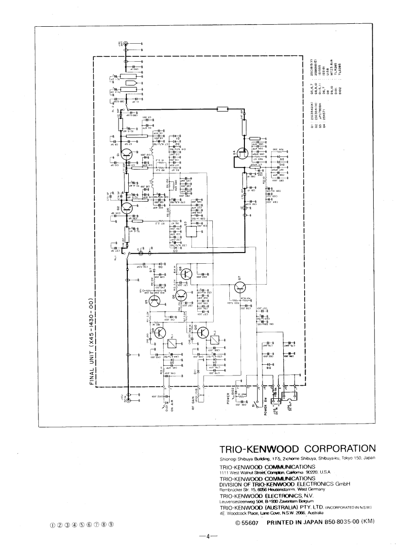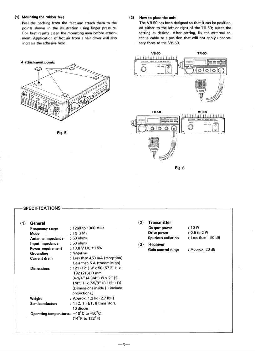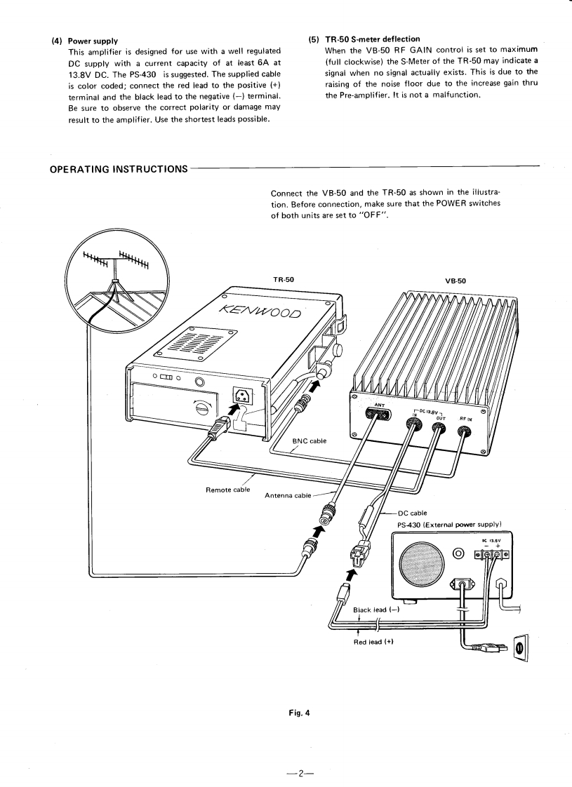 KENWOODVB-501200MHz FM POWER AMPLIFIERINTRODUCTIONPRECAUTIONSThe VB-50 is a 1200 MHz,10W FM power amplifier designed(1)Since no specific radiation hazard level has been estab-especially for the TR-50 portable transceiver.Solid-statelished yet for this band we recommend that this ampli-switching is provided to simplify the connections to thefier be used in Fixed Station locations only.transceiver.A newly developed metal-type low-noise micro-(2)The VB-50 is supplied with the following accessories:wave GaAs (Gallium Arsenide)FET is used to prevent anyDC cable (with 2-pin plug).................1loss of receiver performance when the amplifier is connected□Fuse(8Amp}.,.,........1to the radio.□F0ot.4Instruction manual......................1口Warranty card (U.S.A.only).........··.1CONTROLS AND THEIR FUNCTION(Front panel)①RF GAIN controlKENWOOD 1200MHz FM POWER AMPLIFIERRotate this control clockwise to increase the gain of theRF GAIN-POWERreceiver preamplifier.Use only the minimum amountnecessary as excessive levels will also increase the noisefloor.②ON AIR indicatorThis indicator will light when the amplifier is keyed bythe TR-50.③POWER indicatorFig.1This indicator will light when the amplifier is turned on(Rear panel)with the POWER switch.④POWER switchPlace this switch to ON to apply power to the amplifier.DCr3.8V-ANT⑤ANT terminal/cableConnect to an antenna with an impedance of 50g.AnN-type connector is supplied on the cable.6 DC 13.8V-IN terminal/cableThis cable is used to connect the amplifier to a 13.8VDC power source,and is provided with a 8 amp fuse.7DC 13.8V-OUT terminal/cableThis cable is used to supply power to the TR-50.8 RF IN connector/cableConnect the BNC connector to the external antennaconnector of the TR-50.Fig.2BEFORE·OPERATION(1)Installation locationed clean the connections thoroughly to remove anySelect a location that provides adequate ventilation.flux residue.Tighten the nut securely when soldering--Do not place anything on or near the amplifier.has been completed.(2)External antennaSoldering hole (Solder herelUse as large a 50n coaxial cable as possible to pre-坐!图vent any additional line losses.Use as short a leadCenterin as possible!contact(3)Connection between the antenna connector and coaxialCore conductorCoaxial cableWasher Clampconnector.NutBraid (Trim the(Example)Insulatingwasherbraid flush)Attach the end of the coaxial cable as shown in theillustration.Pay particular attention when solderingDimensions for an N-type connector with RG-8.9/Uthe center conductor.When soldering has been complet-Fig.3