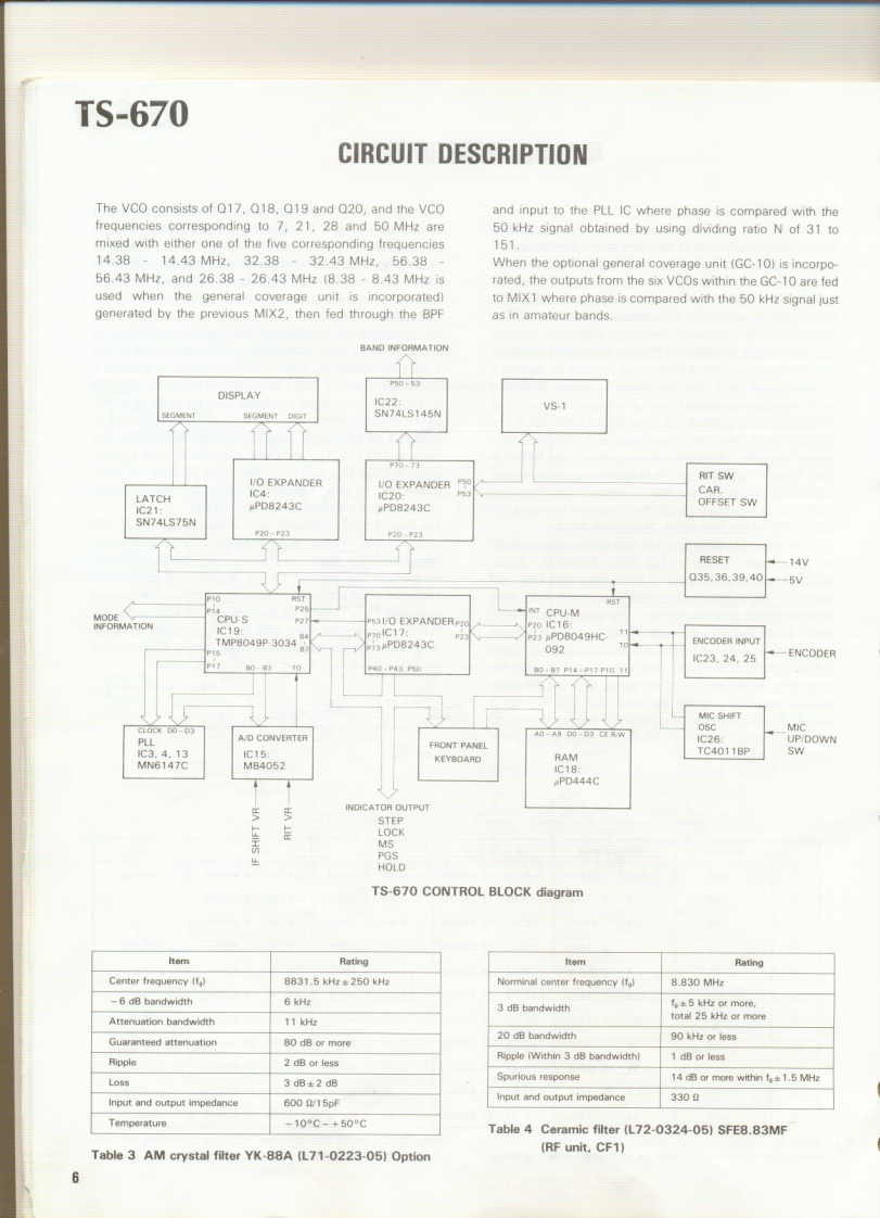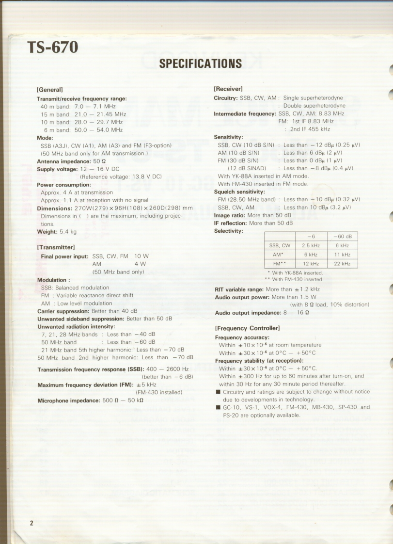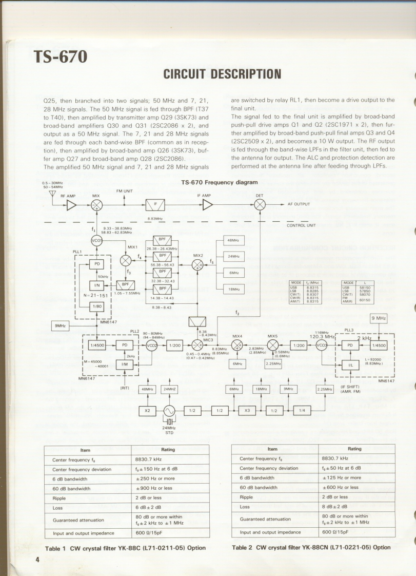 KENWOODSERVICE MANUALModel TS-670FM-430,GC-10,VS-1ALL MODE QUAD BANDER22430or287CONTENTSSPECIFICATIONS.ADJUSTMENT...22CIRCUIT DESCRIPTION..3PACKING...............................31PARTS LIST........1LEVELDIAGRAM..34PCB0 ARD VIEW............18BLOCK DIAGRAM...35SWITCH UNIT(X41-1550-00).....18DISASSEMBLY...................................36RF UNIT(X44-1580-00)........19TERMINAL FUNCTION.381FUN1T(X48-1390-00........200PT10N..42C0 NTROL UNIT(X53-1370-00)....21GC-10.42FINAL UNIT(X45-1350-00)..22FM-43046FILTER UNIT(X51-1320-001..22VS-1.48DISPLAY UNIT(X54-1800-00)....22SCHEMATIC DIAGRAM.....4ENCODER UNIT (W02-0328-10).........22