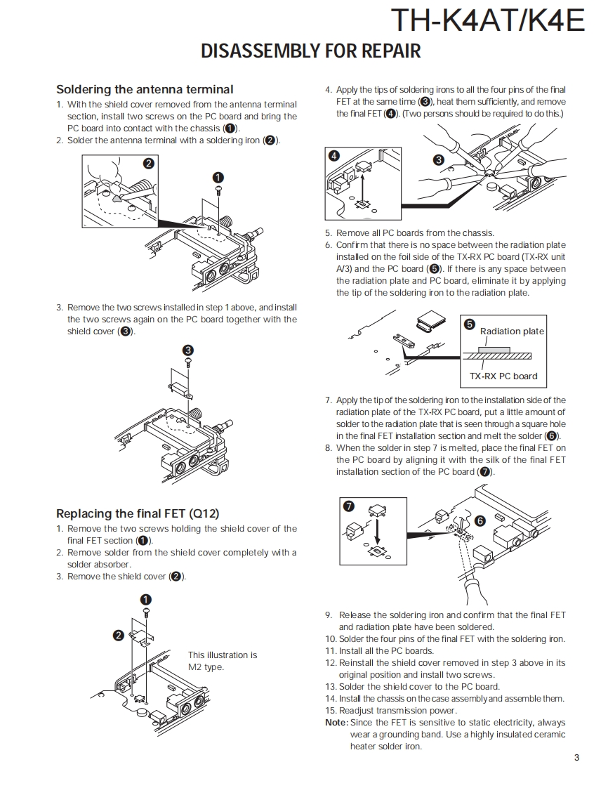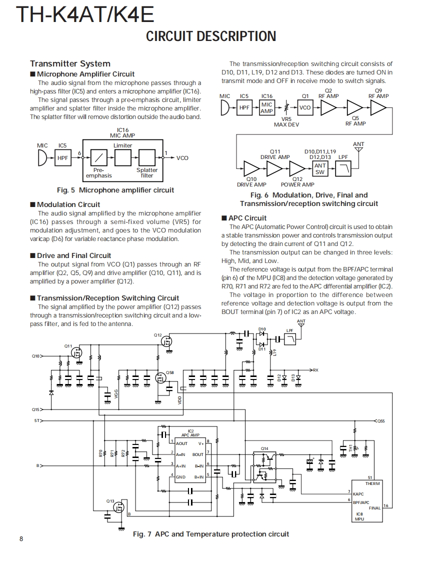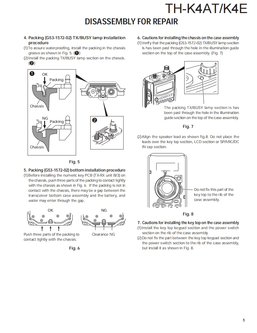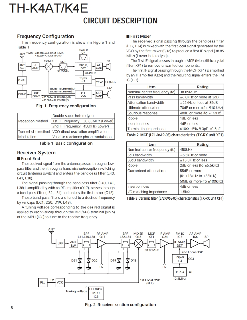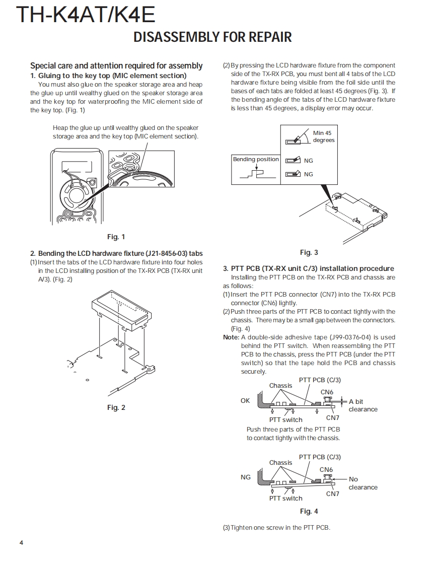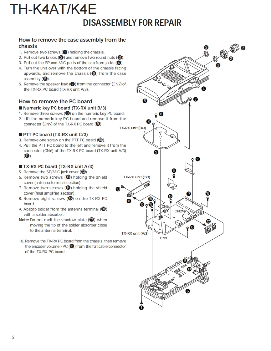 430MHz FM TRANSCEIVERKENWOODTH-K4AT/K4ESERVICE MANUAL2003-9 PRINTED IN JAPANB51-8660-00(S)497Helical AntennaHelical Antenna(T90-1019-25(T90-1019-25Knob (ENC)Knob (ENC)(K29-5159-03)(K29-5159-03)Knob (VOL)Knob (VOL)K29-5150-03)(K29-5150-03)Front glassFront glassKnobB10-2746-03)Knob(B10-2746-03)(PTT/LAMP/MON)-(PTT/LAMP/MON)(K29-9274-03)KENWOODCap(K29-9274-03)KENWOODCap(SP/MIC/DC IN)9999(SP/MIC/DC IN)B09-0675-03)(B09-0675-03)Cabinet assyCabinet assy(16key)(4key)(A02-3822-23)Key top (4key)(A023823-23)②③(K29-9276-02)高尚尚Key top (16key)65(K29-9272-02)TH-K4ATTH-K4ECONTENTSDISASSEMBLY FOR REPAIR2SCHEMATIC DIAGRAM..........50CIRCUIT DESCRIPTION ..........6LEVEL DIAGRAM....55SEMICONDUCTOR DATA....................14BLOCK DIAGRAM..56COMPONENTS DESCRIPTION ..................15BC-21 (WALL CHARGER)............58PARTS LIST17PB-43N (Ni-MH BATTERY PACK)..............58EXPLODED VIEW...23BT-14 (BATTERY CASE)...............59PACKING.25PG-4Y (PROGRAMMING INTERFACE CABLE)......59ADJUSTMENT...27MCP-1A (MEMORY CONTROL PROGRAM)..........59TERMINAL FUNCTION.…43SPECIFICATIONS......BACK COVERPC BOARDTX-RX UNIT (X57-675X-XX)(A/3).................4.4TX-RX UNIT (X57-675X-XX)(B/3),(C/3)..........48