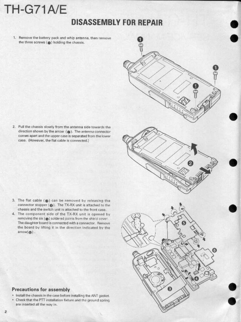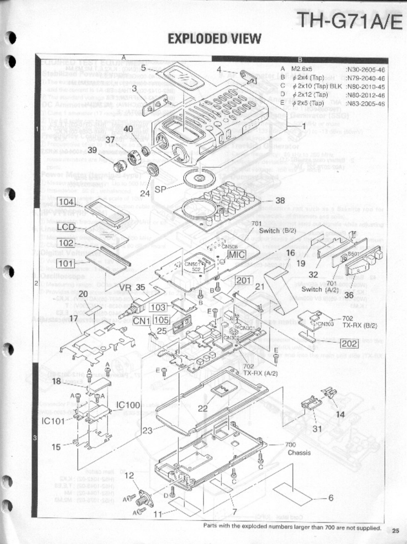 144/430(440)MHz FM DUAL BANDERTH-G71A/EKENWOODSERVICE MANUAL1997-10 PRINTED IN JAPANB51-8405-00B)940Whip antenna1T9-0634中05CONTENTSDISASSEMBLY FOR REPAIRT .........................2CIRCUmT DESCRIPTION................................3DESCRIPTION OF COMPONENTS ....................10SEMICONDUCTOR DATA.............................13PARTS LIST…18EXPL0 DED VIEW…25PACKING,…26ADJUSTMENT…27Knob (ENC)PC BOARD VIEWS1K29-5159030PTT UNIT(X41-342X-XX)(A/2)...................32KEY UNIT(X41-342X-XXB/2)...........33TX-RX UNIT(X57-5410-XX)(B/2)........................39Knob VOL)(K29-515003图TX-RX UNIT(X57-5410-XX)(A/2)........................SCHEMATIC DIAGRAM............................47Front gless ILCD月BLOCK DIAGRAM....................................51B10-1283-03WIRING DIAGRAM.…53