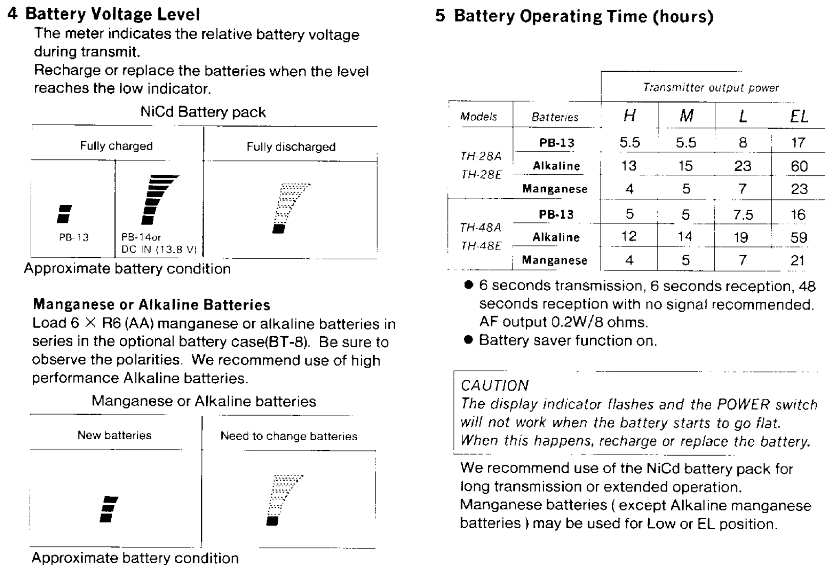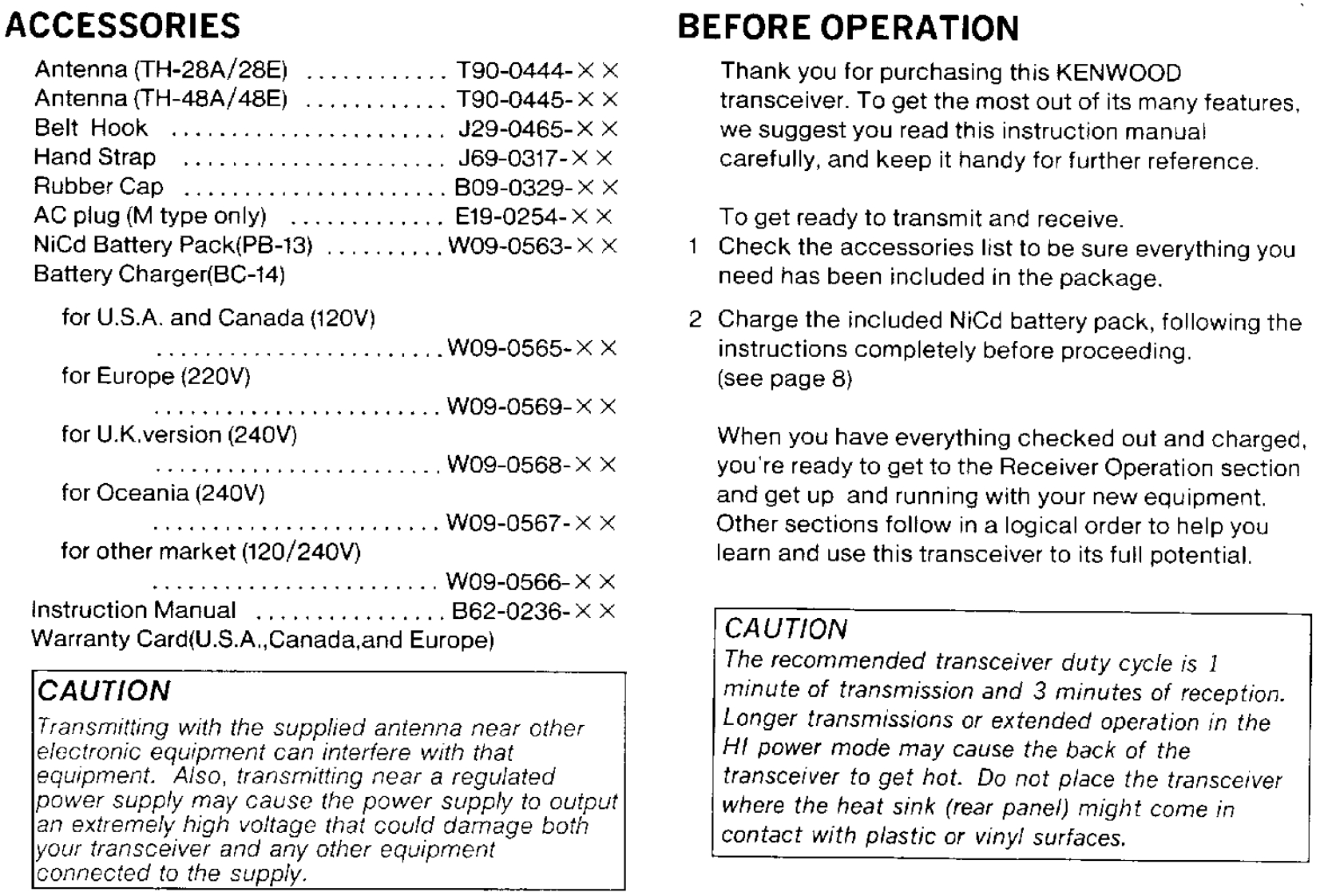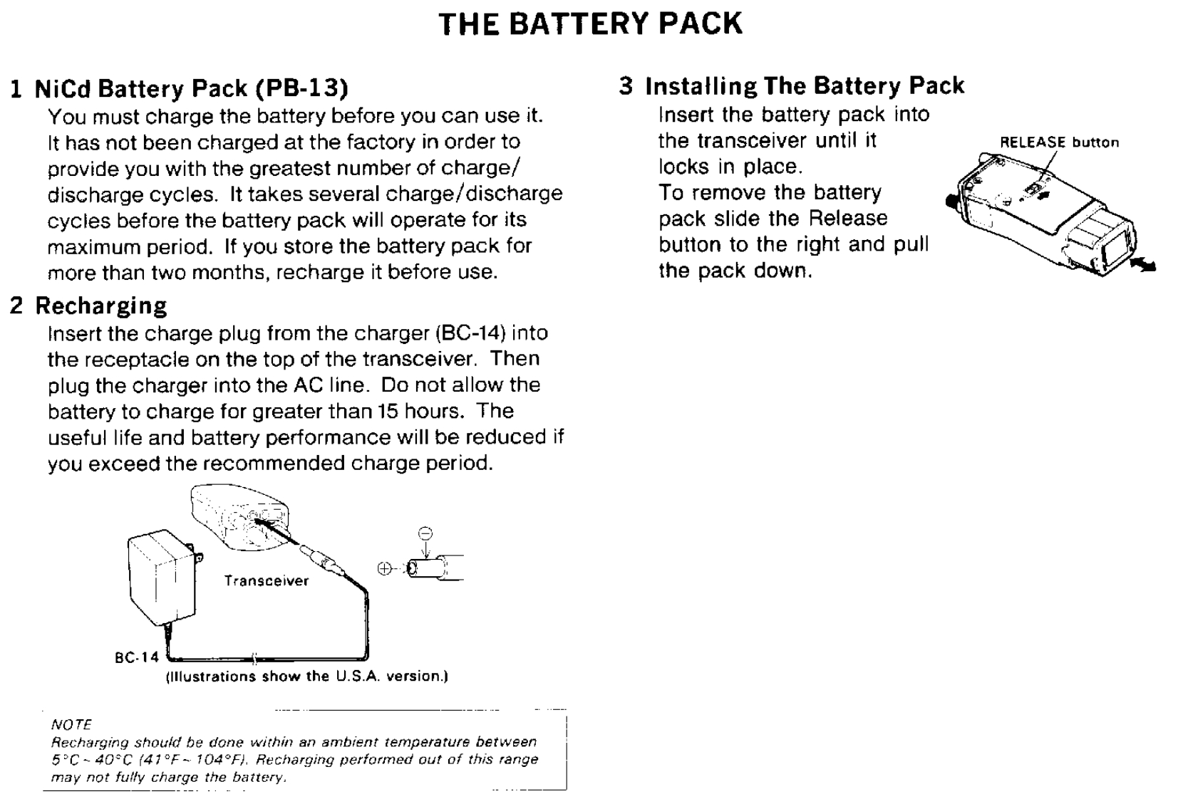 CONTENTSACCESSORIES55 Memory Contents.186 Entering Split Channel Frequencies ........19BEFORE OPERATION57 Entering The Call Channel Frequency ......19Controls Overview.68 Recalling Memory Channels20THE BATTERY PACK9 Memory Shift .....201 NiCd Battery Pack (PB-13)10 Memory Channel Character Display ......2182 Recharging.....·8SCANNING3 Installing The Battery Pack81 Hold/Resume Programming ....224 Battery Voltage Level92 Scan Options...,…·225 Battery Operating Time.........93Scanning Memory Channels23RECEIVER OPERATION4 Locking Out Memory Channels235 I1 Getting startedBand Scanning ........24102 Selecting Frequency6 Programmable Band Scan ..24117 MHz Scan3 Step Size Selection26128 VFO/Memory Scan4 Programmable VFO Tuning Limits2149 CALL/VFO Scan....5Subband Reception .....6....1410 CALL/Memory Scan26TRANSMITTER OPERATION11 V/M/C(VFO/Memory/CALL)Scan...261 To transmit.................15REPEATER OPERATION2 Changing Transmitter Output Power153 TX.Stop Function1 Transmitter Offsets.......27162 Selecting the Offset Direction4 Time Out Timer163 Automatic Offset Selection27USING THE MEMORY4 Manual Offset Selection1 Microprocessor Memory Backup175 The Reverse Function2 Entering Memory Data ..........176 Tone Operation ....3 initializing The Memory ..........187 Autopatch Operations .4 Memory Channel......188 DTMF Memory
