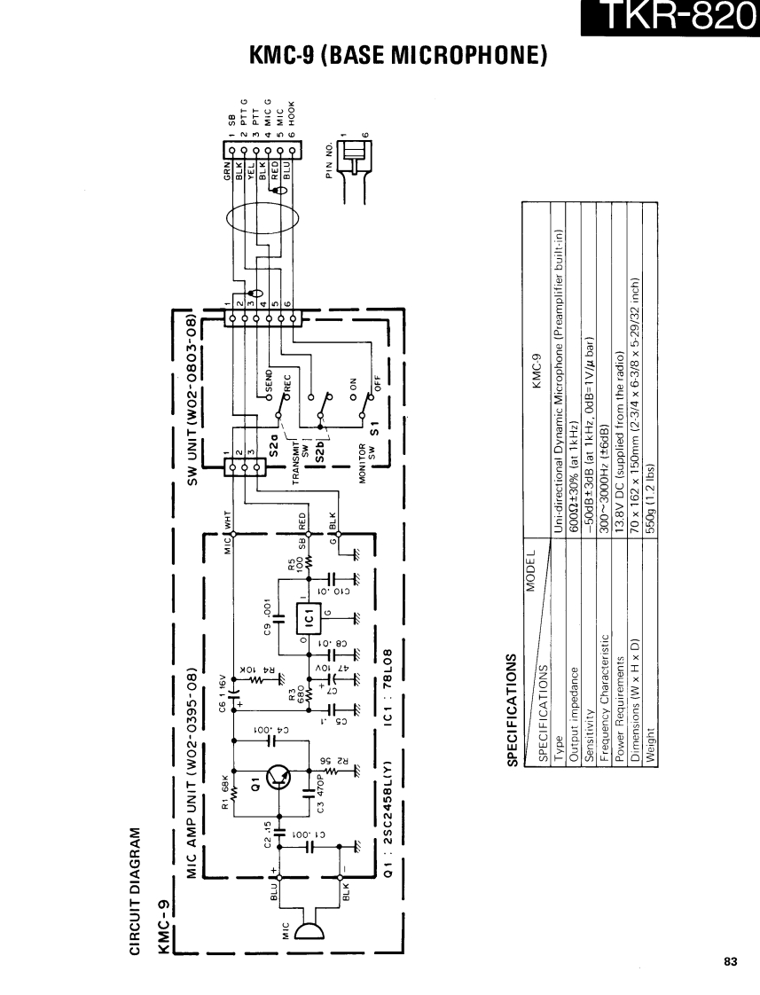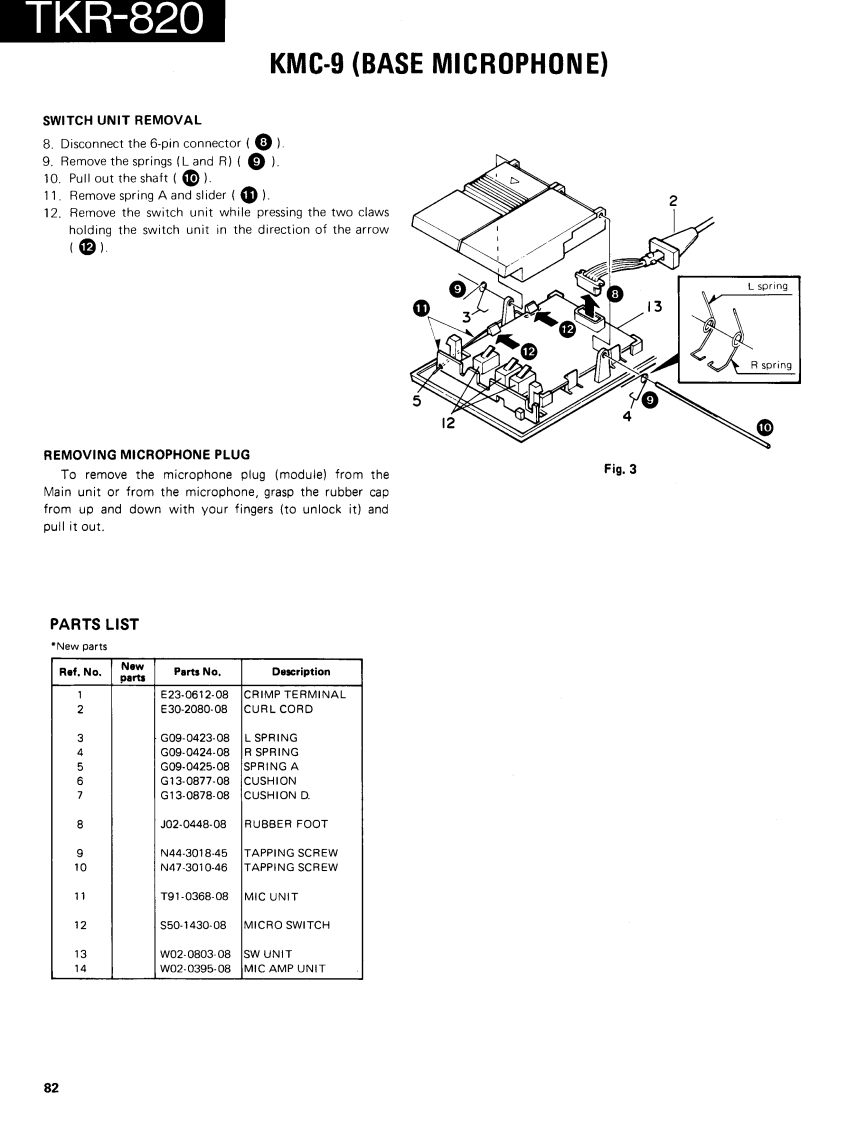 I KR-820KMC-9 (BASE MICROPHONE)EXTERNAL VIEWDISASSEMBLY FOR REPAIR0Case BKENWOODCase ACHASSIS REMOVAL1.Remove the four rubber feet (1).2.Remove the four screws ()-10X43.Remove the chassis ()Chassis4.Disconnect the 3-pin connector from the microphoneamplification unit ()8X4Fig.1REMOVAL OF MICROPHONE ELEMENT AND MICRO.9PHONE AMPLIFICATION UNIT65.Remove the two screws holding cases A and B(5).6.Remove case B().7.Remove the microphone element and microphone amp-lification unit(⑦).6Fig.281
