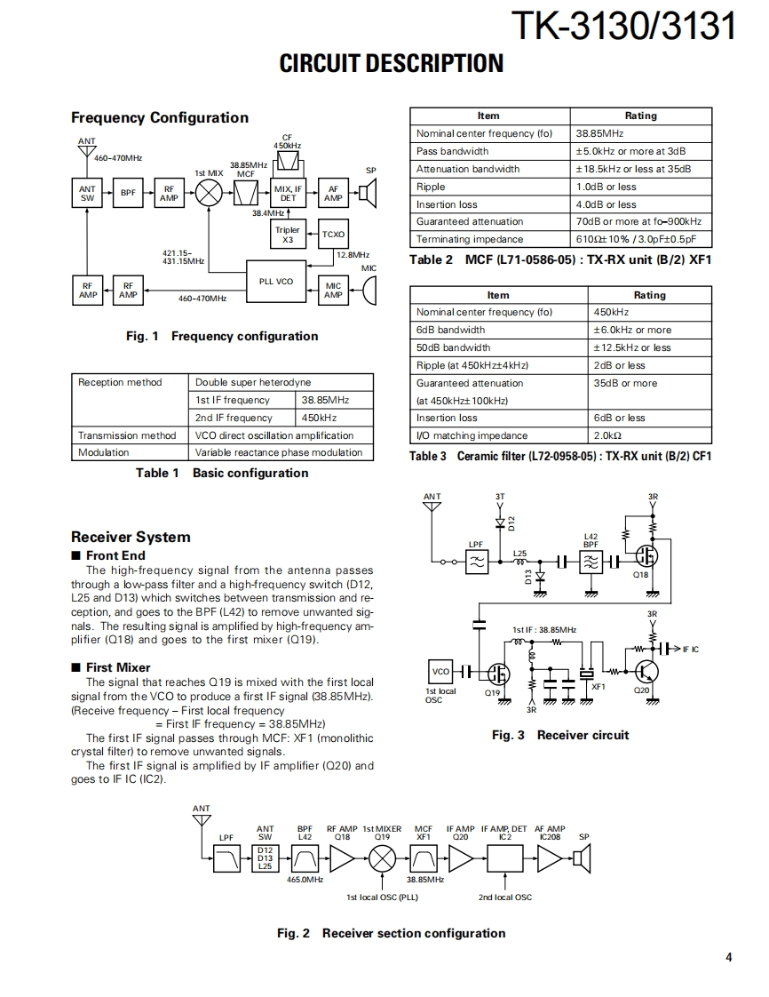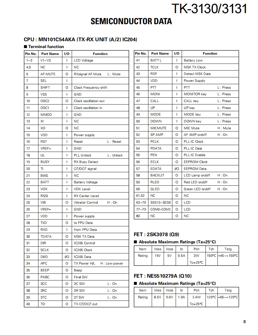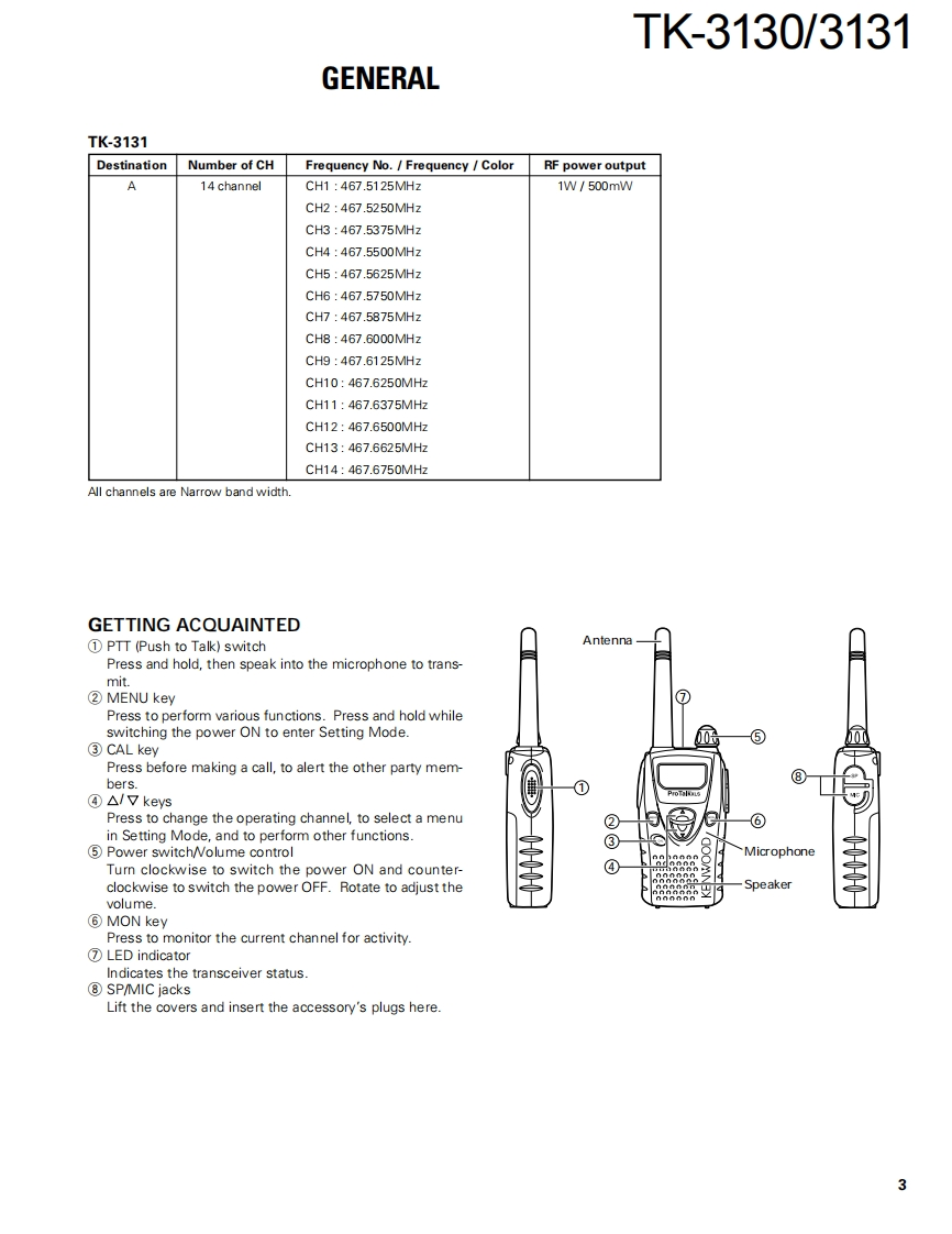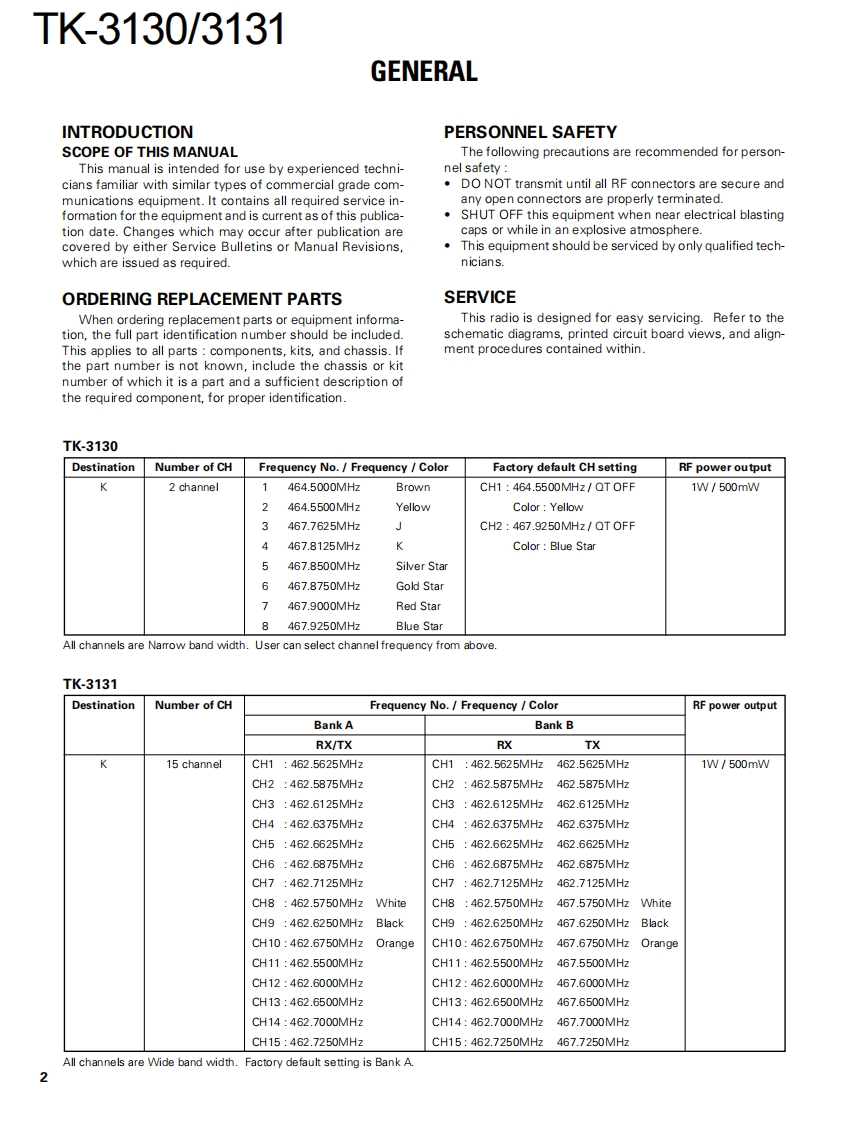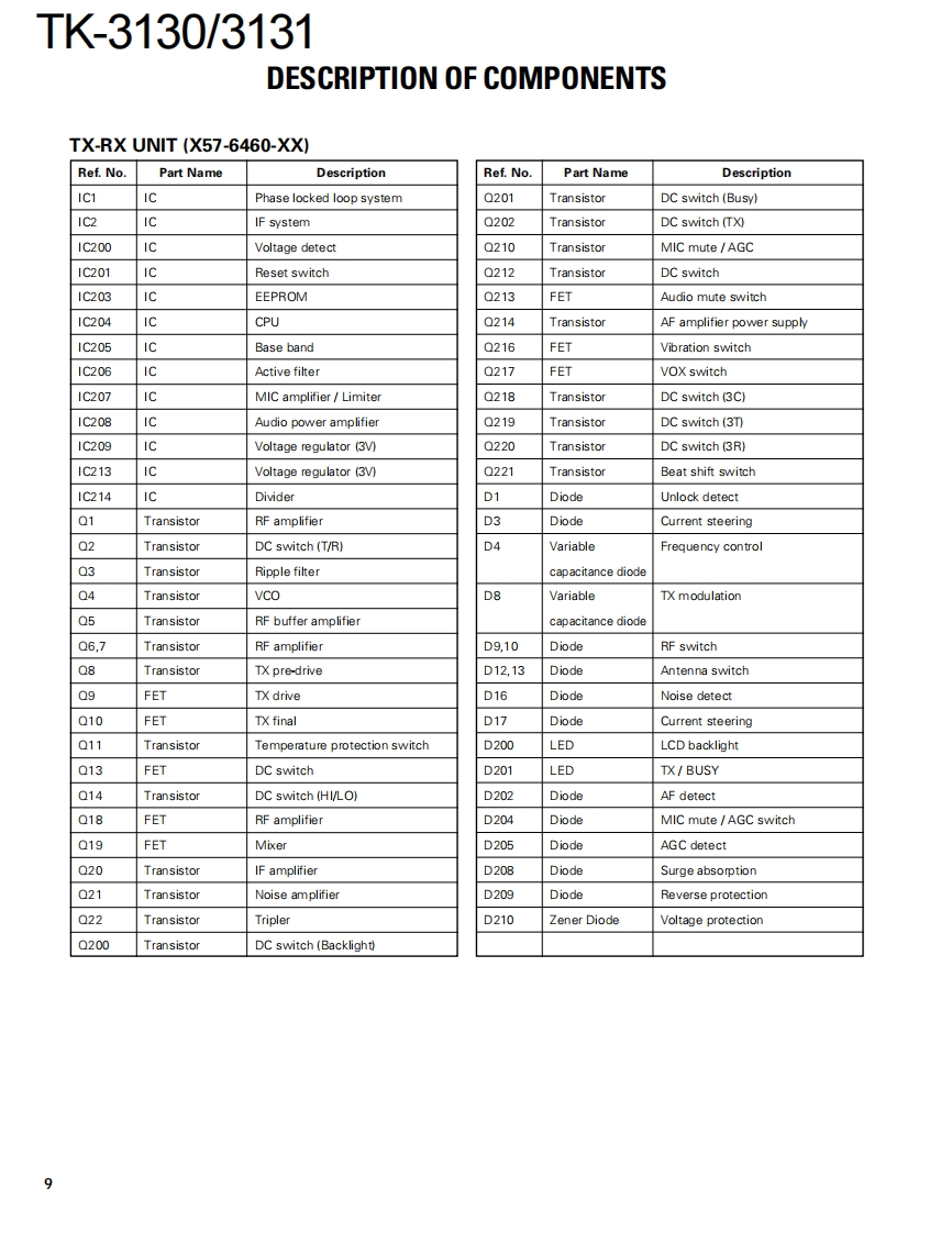 UHF FM TRANSCEIVERTK-3130/3131KENWOODSERVICE MANUAL©2001-11AntennaKnob (VOL)(T90-1004-05)(K29-9138-03)CONTENTSCap (P-jack)B09-0627-03)GENERAL…2BEALIGNMENT.3CIRCUIT DESCRIPTION.....................5SEMICONDUCTOR DATA...............9DESCRIPTION OF COMPONENTS .......10Button knob (PTT)PARTS LIST........11(K29.9137.13)ProTalkxLsEXPLODED VIEW.....17PACKING..…e.....18ADJUSTMENT.…20Key top(K29.9136-12)PC BOARD VIEWSTX-RX UNIT (X57-6460-XX)(B/2)......24TX-RX UNIT (X57-6460-XX)(A/2)......27Cabinet assy (Front)SCHEMATIC DIAGRAM................33(A02.3663-03):30K(A02-3705-03):31KBLOCK DIAGRAM...37(A02-3706-03):ALEVELDIAGRAM39TERMINAL FUNCTION.................40KNB-27N (Ni-MH BATTERY PACK)........40Photo is TK-3130.30K TK-3130(K type)SPECIFICATIONS.4131K TK-3131 (K type)A TK-3131 (A type)