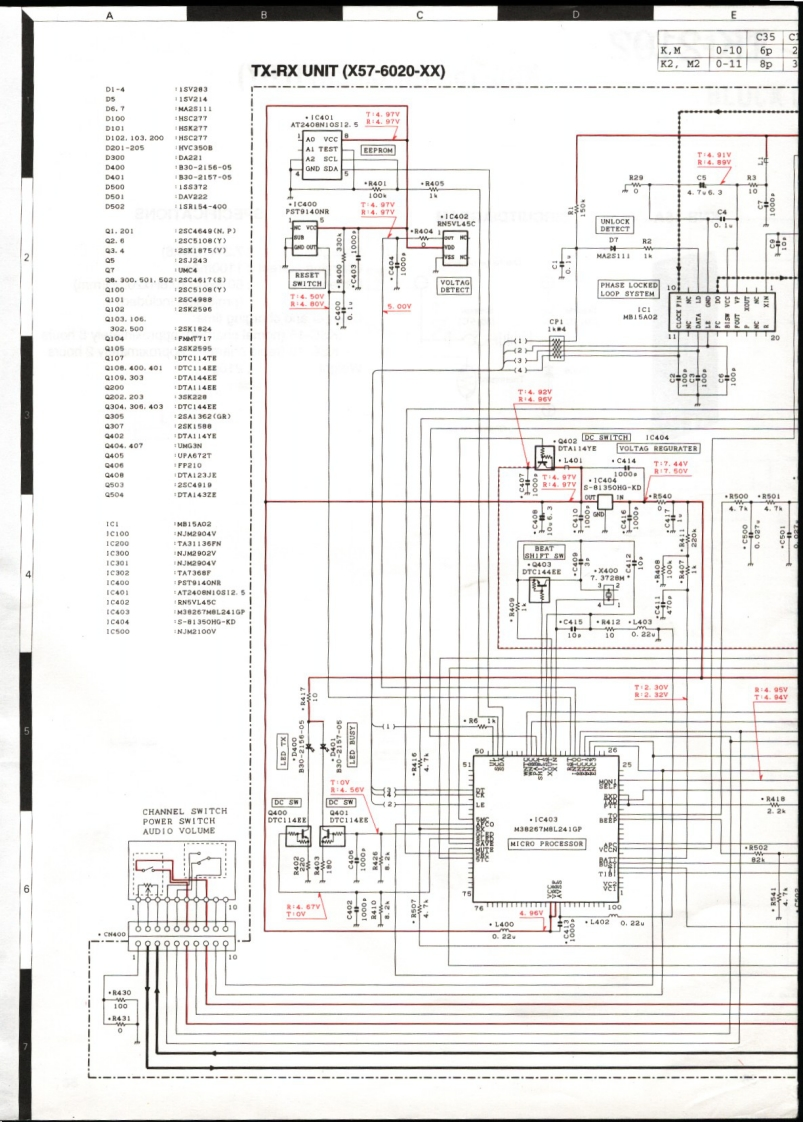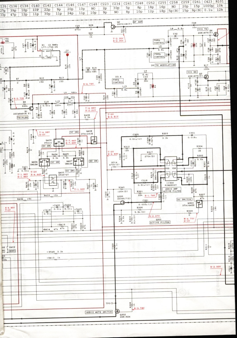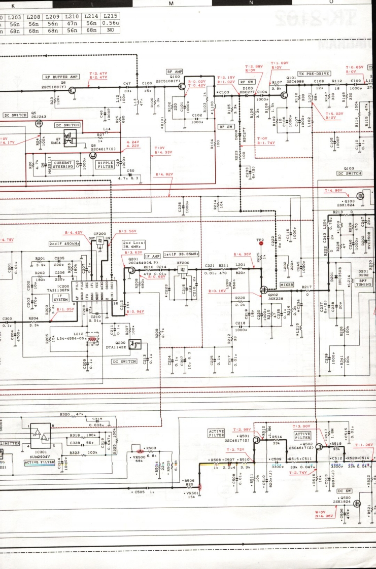 SCHEMATIC DIAGRAM TK-2102ANTENNA SW40C144CI4TLP可T:0.63VTX FINALD101L411C137L114L115114T1000c1161000p33T10.4V:肤8R101VR1230D102.103ANTENNA SW·R144TDPERATURE PROTICTION S 2SK1·R136150CD330·G13441009DC SWITCH6:·R133150k(D1·142T17.37y60R134150DR137R130APC22HIXER RP AMPC254T4.95V22a1.501.5DC SWITCHR240鲜020.20420R13.39yAUDIO MUTE SHITCK生删上·R31002st9890C337100w6.3R32C330100·C327d0.1AUDIO PONER AMP220288962aR)DC5WIT心470C333DE SWITCHD.DC SWITCH。304DTC144EEDTC144EEF500501REVERCE PROTECTION3.0536R524DC SWITCH·R526R5424别15k(D)0C520C524G525L5000,0270,1wR538100MIC AMPR535LIMITTER47月525C5181,5kND DET·8MIC MUTE,T2.50器AGCMIC MUTE/ACC SHITCHNote:Component marked with a dot (.are parts of pattern1.