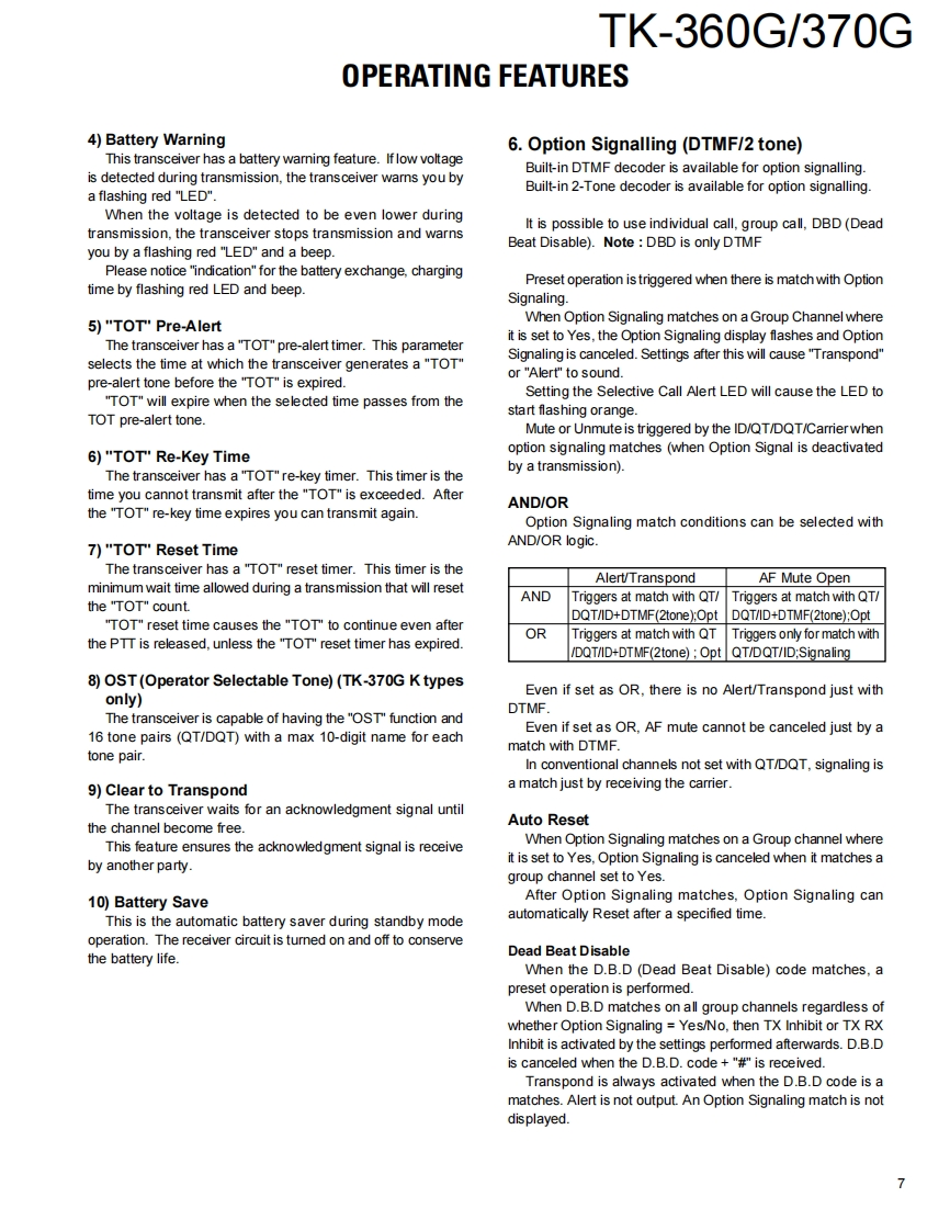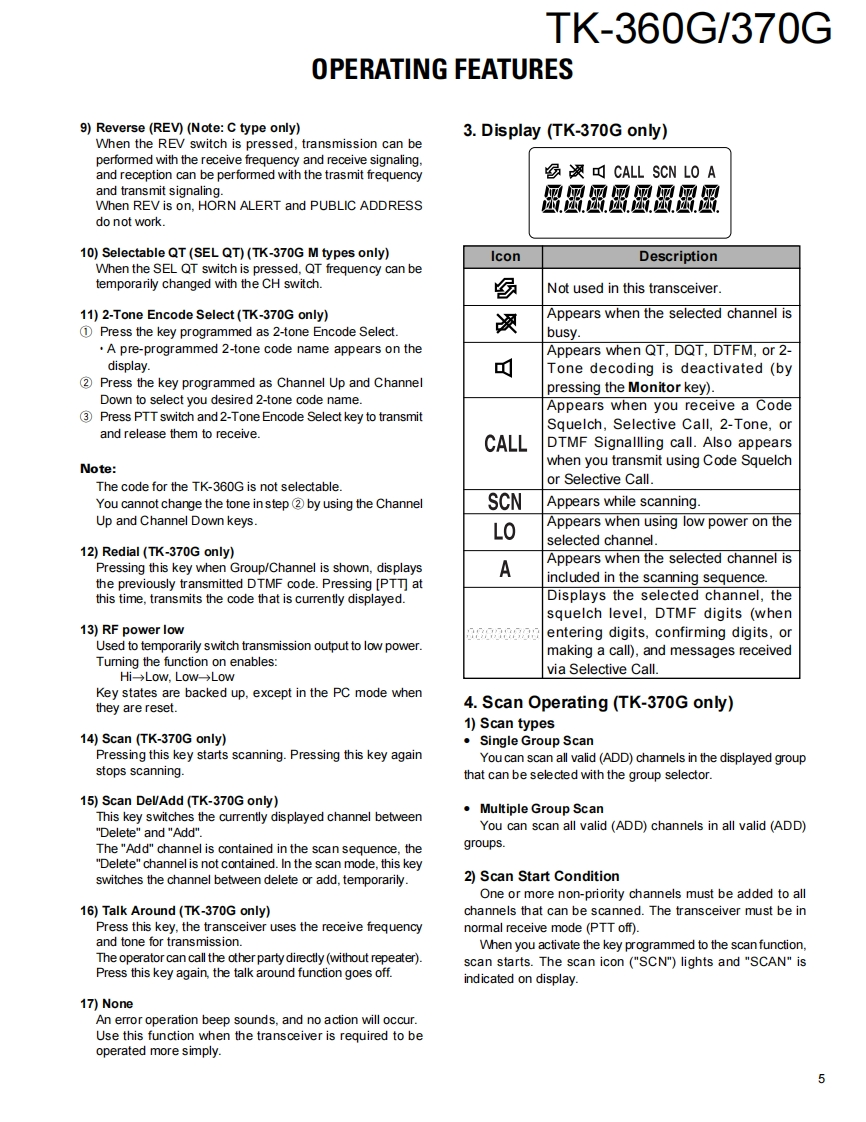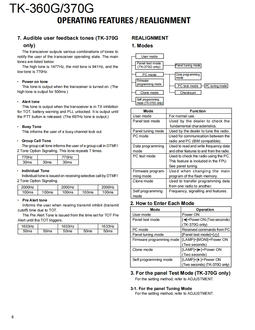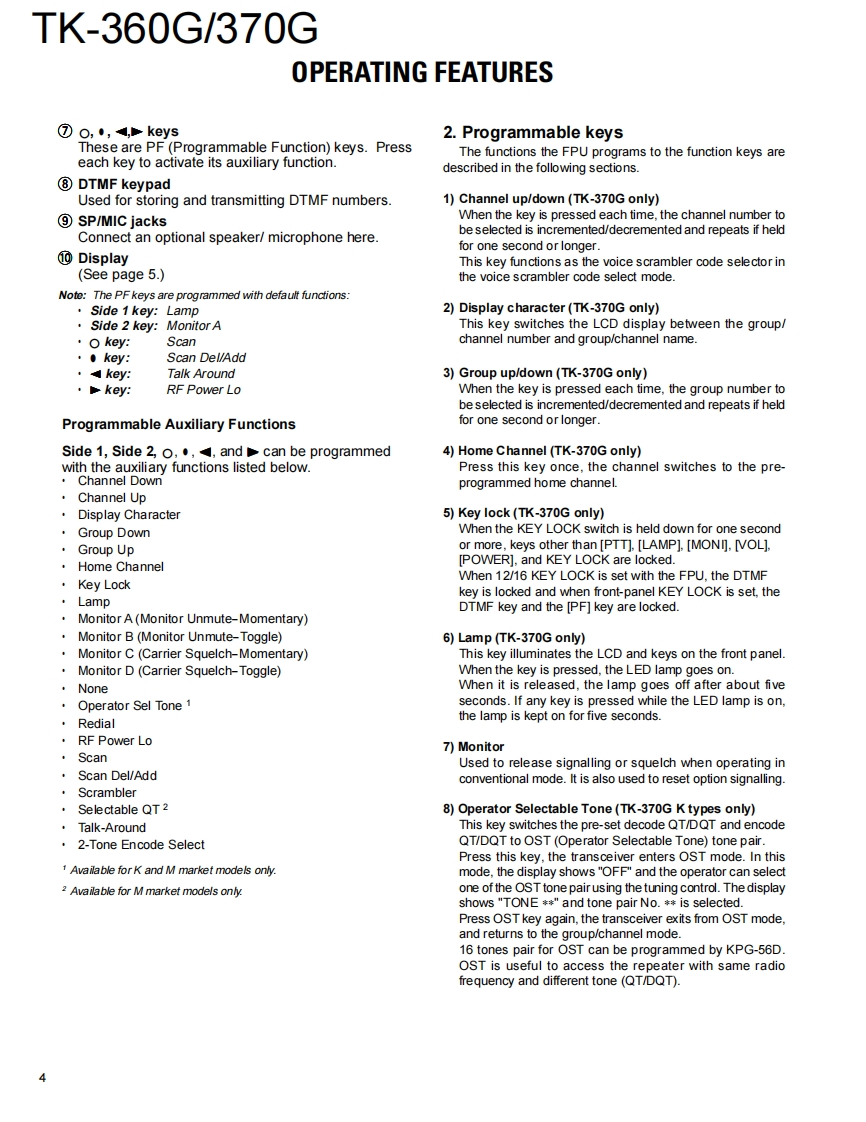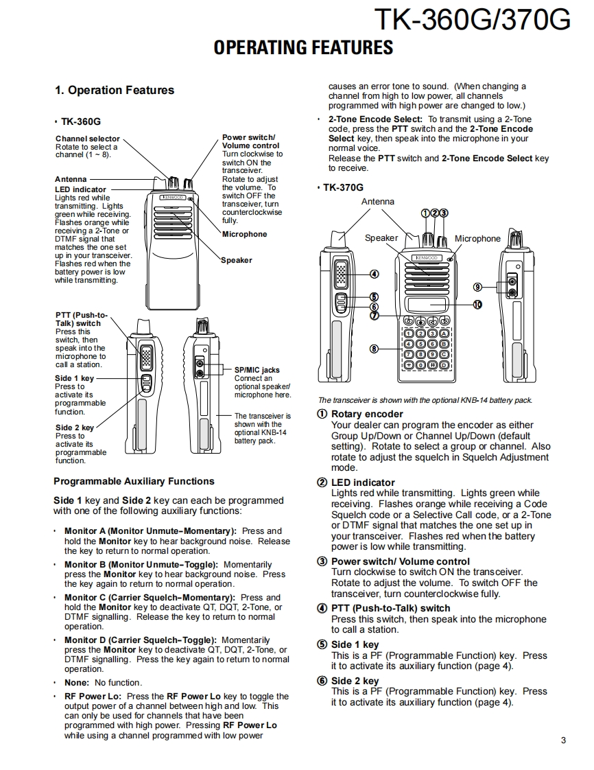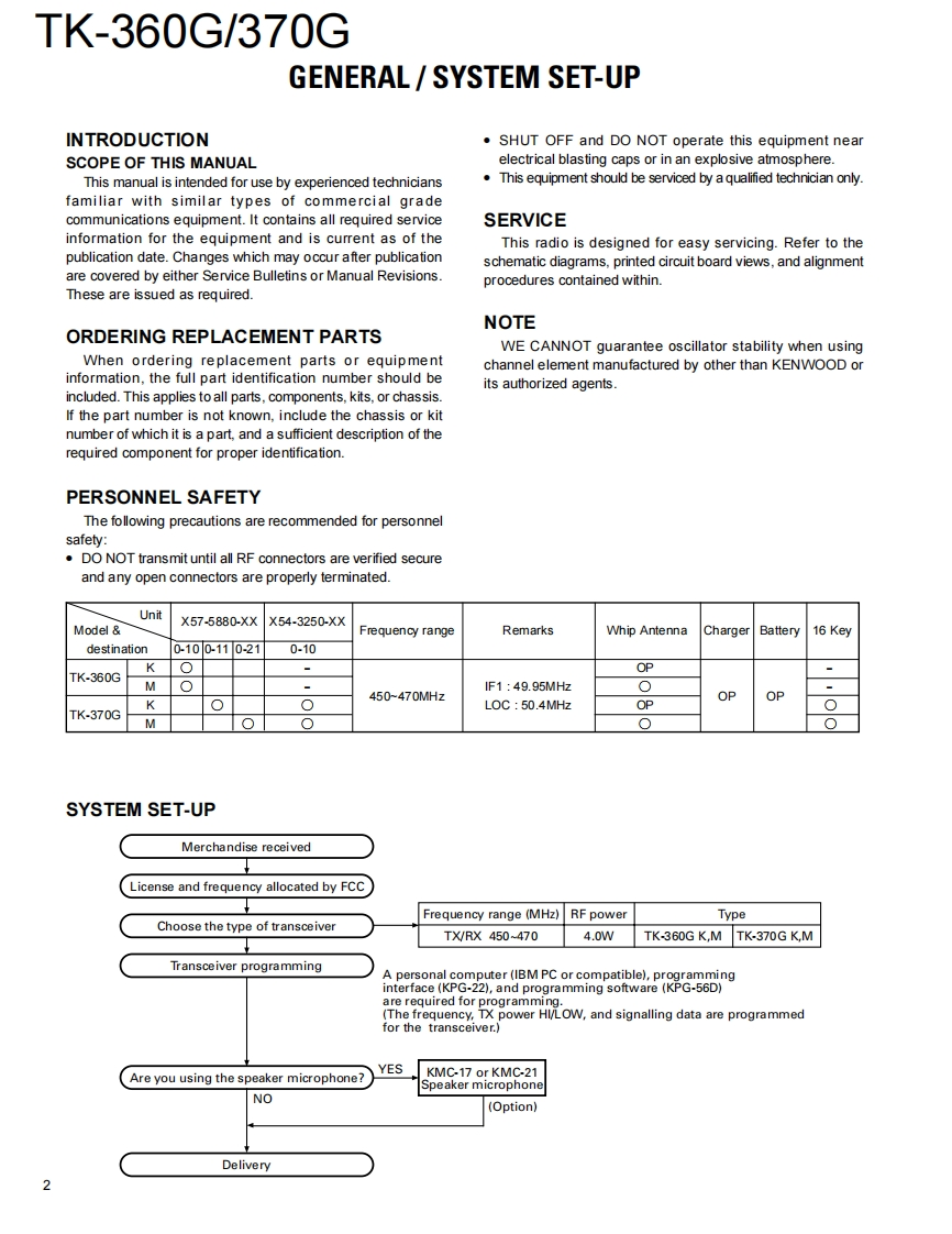 UHF FM TRANSCEIVERTK-360G/370GKENWOODSERVICE MANUAL1999-9 PRINTED IN JAPANB51-8494-00(S)1574-Antenna-(T90-0682-05:MKnob(CHANNEL SELECTOR)Knob (ENC)K29-5341-03)(K29-5331-03)Knob (VOL)Knob (VOL)K29-5332-03)(K29-5332-03)Cabinet assyCabinet assy(A02-2391-23)(A02-2385-23)Knob(PTT)Knob(PTT)(K29-533413)K29-5334-13)Knob(MON1)Knob (MON1)(K29-5333-13)K29-5333-13)Key top (DTMF)(K29-5330-02)TK-360GTK-370GM market models are shown.CONTENTSGENERAL.2PACKING.32SYSTEM SET-UP.....2ADJUSTMENT33OPERATING FEATURES.............3PC BOARD VIEWSREALIGNMENT........8DISPLAY UNIT (X54-3250-10).41DISASSEMBLY FOR REPAIR...16TX-RX UNIT(X57-588X-XX)43CIRCUIT DESCRIPTION.17SCHEMATIC DIAGRAM49SEMICONDUCTOR DATA21BLOCK DIAGRAM.........57DESCRIPTION OF COMPONENTS...........23LEVEL DIAGRAM...........59PARTS LIST24KNB-14/KNB-15A(Ni-Cd BATTERY)..60以PLODED VIEW30OPTIONS..61SPECIFICATIONS......BACK COVER