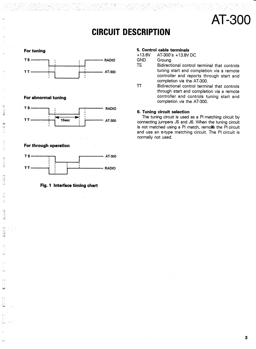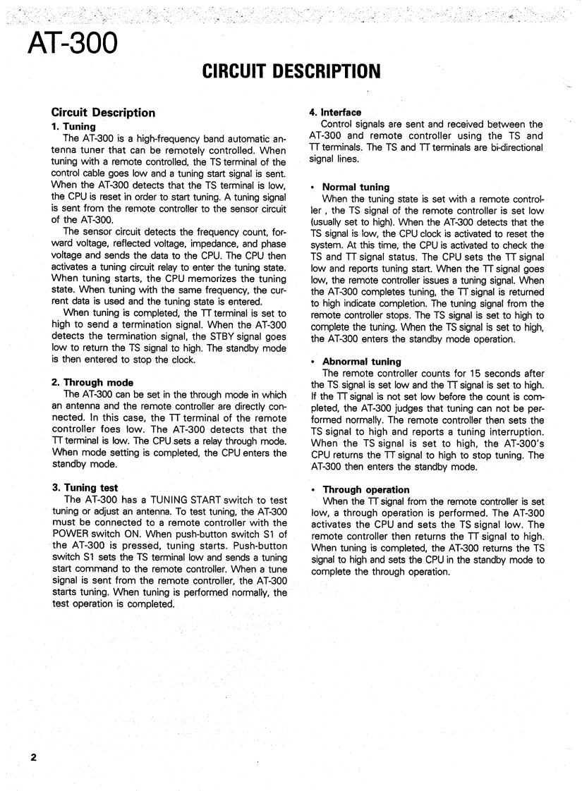 AUTOMATIC ANTENNA TUNERAT-300KENWOODSERVICE MANUAL1991-1 PRINTED IN JAPANB51-8100-00(0)996Cabinet (TOP)Packing(A01-2001-08)(G53-0588-081>KENWOODCable connector(J42-0469-08)Cabinet (BOTTOM)Mounting hardware(A01-2002-08)(J21-4302-08)CONTENTSCIRCUIT DESCRIPTIONutputTuningMode Setting Block9Through Mode2CPU Standby Operation and Interface............10Tuning TostLC Tuning Circuit.12Interface ........2BLOCK DIAGRAM14Control Cable Terminals3DESCRIPTION OF COMPONENTSTuning Circuit Selection.3ANT Tuner Unit W02-1684-08 ......154PARTSFrequency Read Block…EXPLODED VIEW…20A/D Converter.…1PC BOARD (COMPONENT SIDE VIEW)......21Digital Circuit Configuration..........SCHEMATIC DIAGRAM.23SPECIFICATIONS.................BACK COVER
