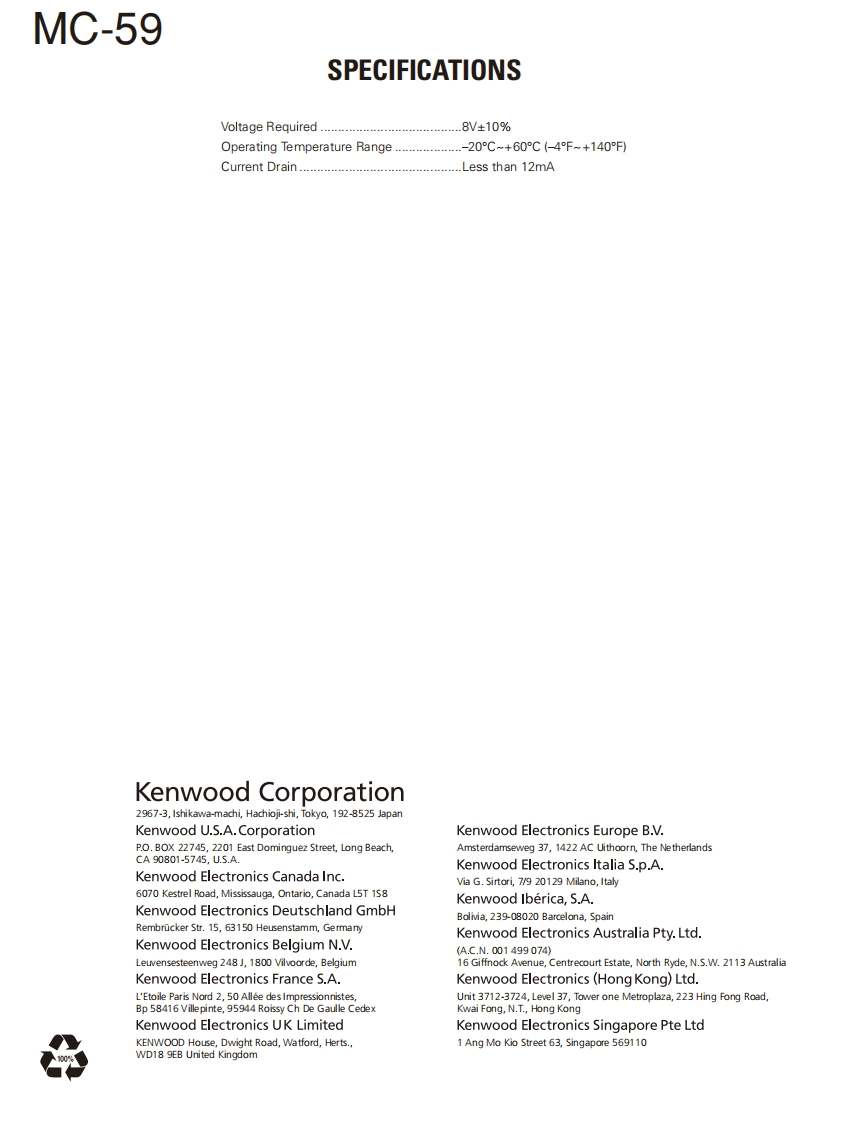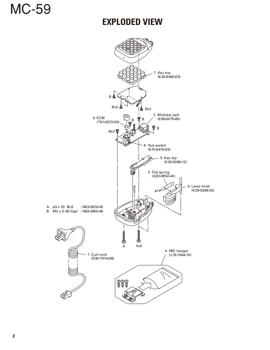 KEYPAD MICROPHONEMC-59KENWOODKenwood CorporationSERVICE MANUAL2007-8 PRINTED IN JAPANB51-8804-00(N)263Lever knobKey topCurl cord(K29-5369-23)(K29-9400-03)(E30-7614-08)PARTS LISTRef.NoAddressNewParts No.DescriptionDestinationparts1E30-7614-08CURL CORDACSY2E58-0475-05MODULAR JACKG02-0B52-44FLAT SPRINGPTTJ19-1584-15MIC HANGERACSYK29-536813KEY TOPPTTK29-5369-23LEVER KNOBPTT7K29-9400-03KEY TOP16 KEYN83-3020-45PAN HEAD TAPTITE SCREWBN89-2005-46BINDING HEAD TAPTITE SCREWS70-0476-05TACT SWITCH9T91-0572-05ECMDocument CopyrightsDisclaimerCopyright 2007 by Kenwood Corporation.All rightsWhile every precaution has been taken in the preparationreserved.of this manual,Kenwood assumes no responsibility forNo part of this manual may be reproduced,translated,errors or omissions.Neither is any liability assumed fordistributed,or transmitted in any form or by any means,damages resulting from the use of the information containedelectronic,mechanical,photocopying,recording,orherein.Kenwood reserves the right to make changes to anyotherwise,for any purpose without the prior writtenproducts herein at any time for improvement purposes.permission of Kenwood.This PCB does not have the LF silk screen,but itThis product complies with the RoHS directive for the European market.is a lead-free solder corresponding product.