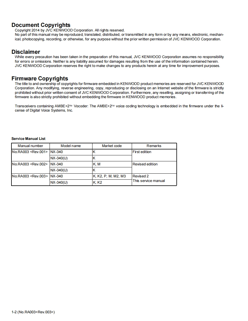 KENWOODSERVICE MANUALUHF DIGITAL TRANSCEIVERNX-340,NX-340(U)KENWOOD⊙Note:Lead free solder used in the board(material:Sn,Ag.In,Bi,melting point:227 Centigrade)TABLE OF CONTENTS1PRECAUTION.....SPECIFIC SERVICE INSTRUCTIONS......................................................1-4DISASSEMBLY1-13gADJUSTMENT1-16TROUBLESHOOTING...1-20REVISEDIIThis service manual has been revised due to the addition of NX-340 type K2,P,M2,M3and NX-340(U)type K2.LF)LFThis product complies with the RoHS directive for the European market.This product uses Lead Free solderB5B-7102-10COPYRIGHT 2014 JVC KENWOOD CorporationNo.RA0032014/3