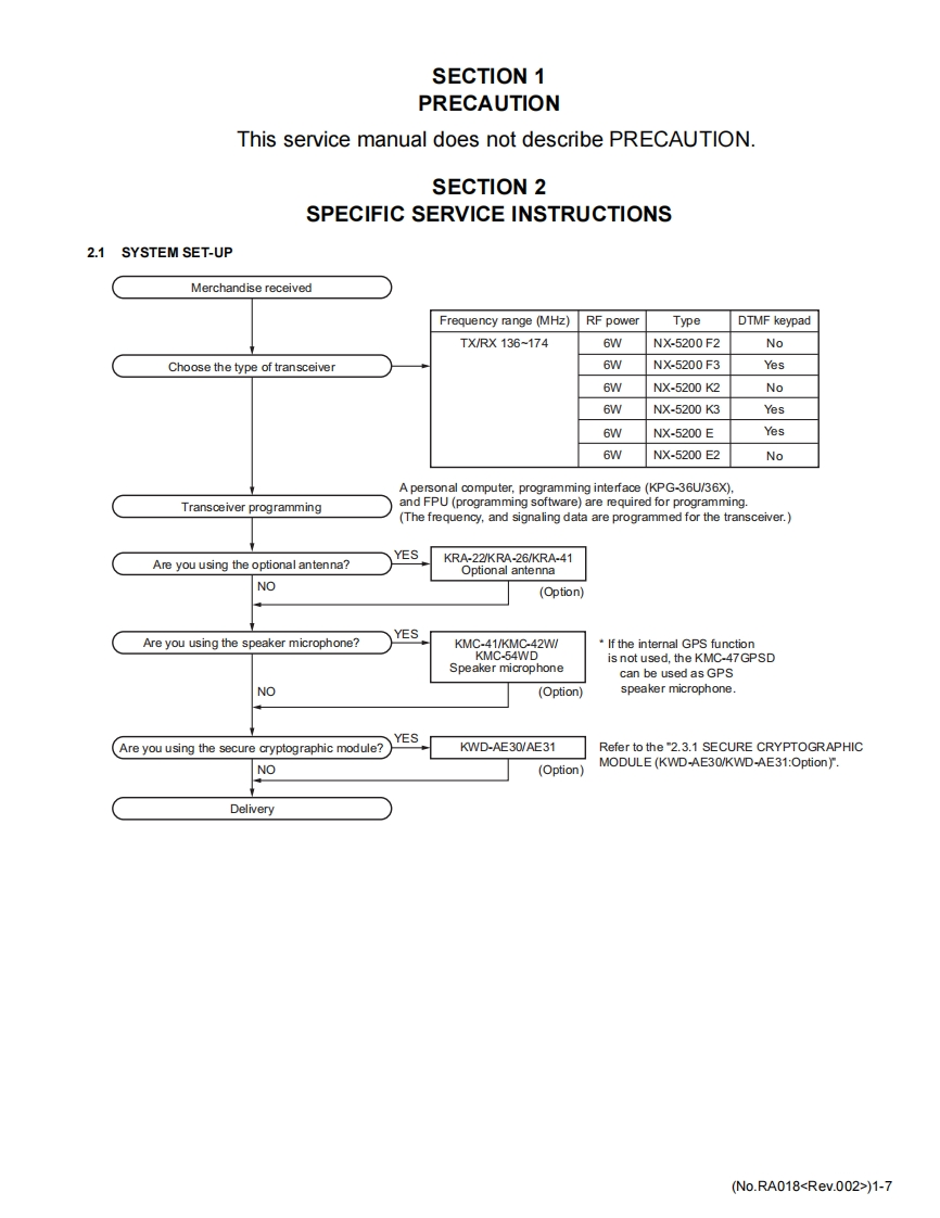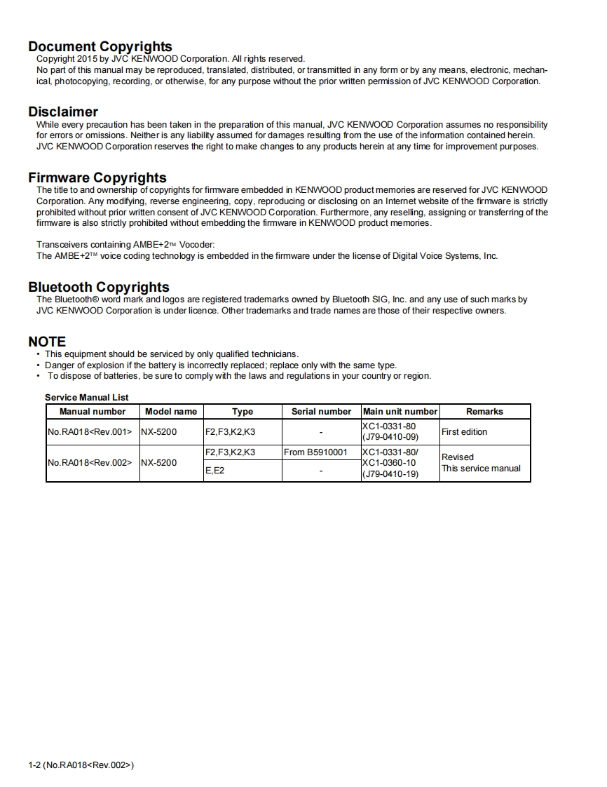 KENWOODSERVICE MANUALVHF DIGITAL TRANSCEIVERNX-5200NX-5200F2,K2,E2NX-5200F3,K3,EKENWOODKENWOODMHn 12:3481Channel 1Channel 1asevd Zone StatusPassed Zone-StatusAB C1☐2378w9.0#TABLE OF CONTENTS1PRECAUTION.........................................................................1-7SPECIFICSERVICEINSTRUCTIONS......................................................1-73DISASSEMBLY4ADJUSTMENT.......................................................................1-345TROUBLESHOOTING.........................1-94REVISEDThis service manual has been revised due to the addition of NX-5200 type E,E2.LP)LFThis product complies with the RoHS directive for the European market.This product uses Lead Free solderB5B-7164-10COPYRIGHT 2015 JVC KENWOOD CorporationNo.RA0182015/9