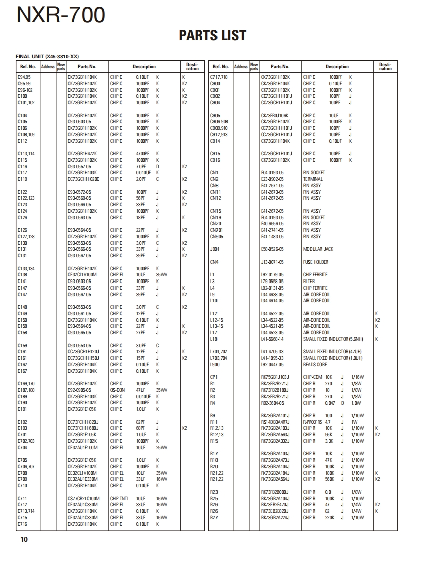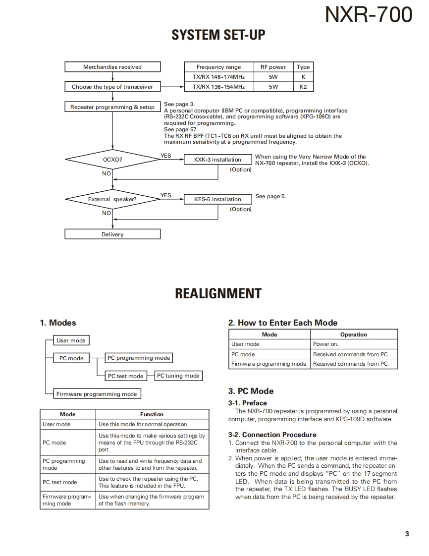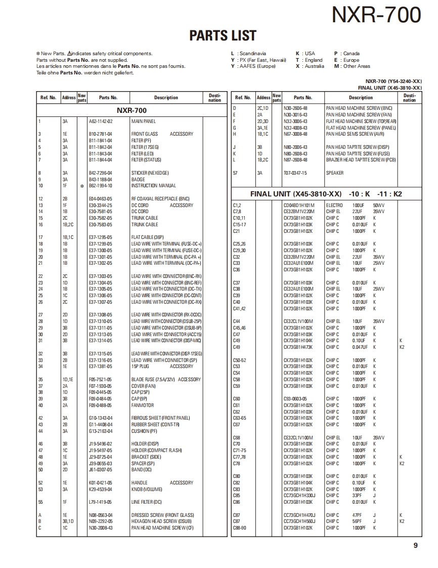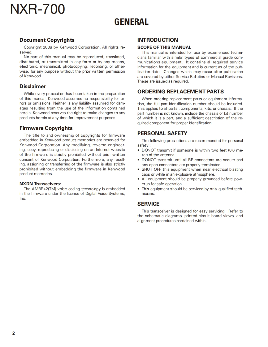 VHF DIGITAL BASE-REPEATERNXR-700KENWOODKenwood CorporationSERVICE MANUALSUPPLEMENT2008-4 PRINTED IN JAPANB51-8826-00(N0546This NXR-700(K,K2)service manual contains a number of sections which differfrom the service manual(B51-8794-00)for the NXR-700(K).For items other than those in this NXR-700 (K,K2)service manual please refer tothe service manual (B51-8794-00)for the NXR-700(K).Lead wire withBadgeMain panelconnector (DSUB-9P)Modular jack(B43.1188-04)(A62-1142-02)(E37.1311-05)(E58-0526-05)0000图ti00066的图0000000品品品7日20000⑧Knob (VOL)(K29-4539-04)Lead wire withLead wire withRF coaxialconnector (BNC-RX)Modular jackconnector (BNC-REF.)Cover (Fan)receptacle (BNC)(E37-1307-05)(E58-0533-05)x2(E37-1304-05)x2(f07.1930-05)(E04-0463.05)CONTROL O9O书中。@圆Lead wire withLead wire withModular jackBlade fuseDC cordFanmotorconnector(ACC15)connector(DSUB-25P)(E58-0516-05)(F05-7521-05)(E30-7581-05)(F09-0488-05(E37.1313-05)(E37-1310-05)CONTENTSTROUBLE SHOOTING...4SYSTEMSET-UP.................3ADJUSTMENT......49REALIGNMENT.3PC BOARD......60INSTALLATION.5BLOCK DIAGRAM.86CIRCUIT DESCRIPTION.6INTERCONNECTION DIAGRAM ..................90PARTS HST............8SCHEMATIC DIAG RAM............94EXPLODED VIEW....38OPTIONAL ACCESSORIES....................118PACKING.....40SPECIFICATIONS .......BACK COVERLFThis product complies with the RoHS directive for the European market.This product uses Lead Free solder.
