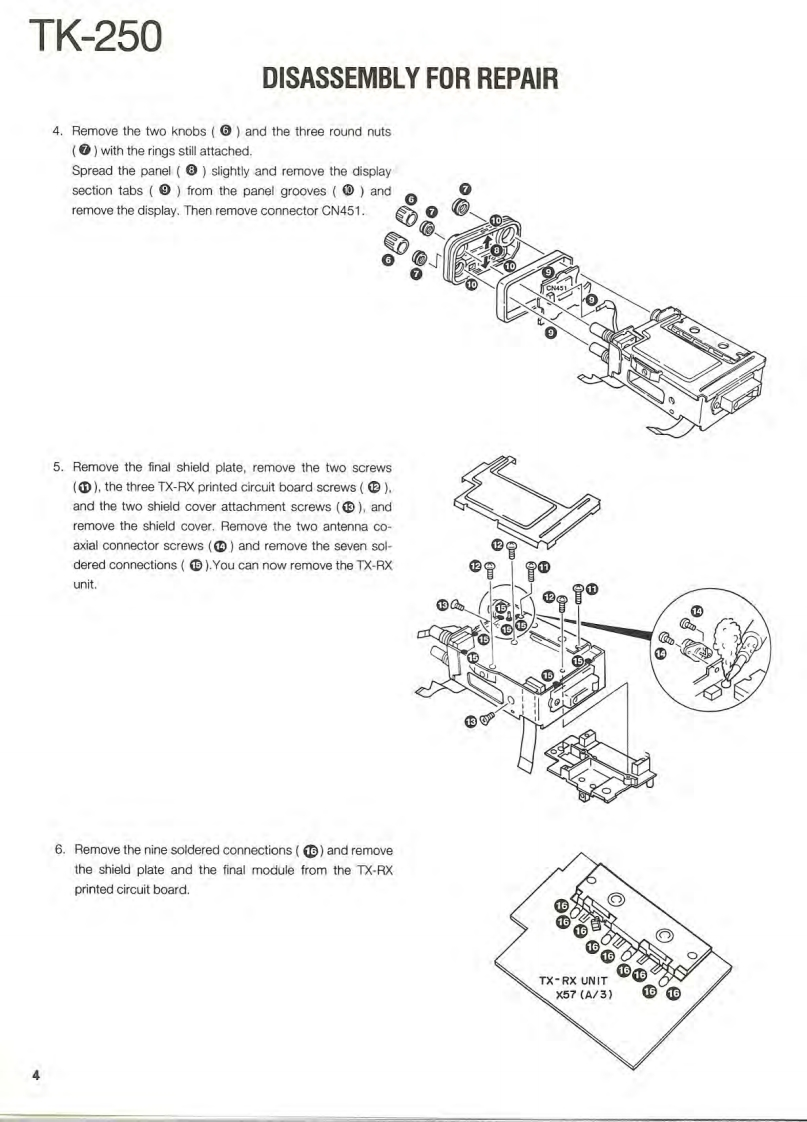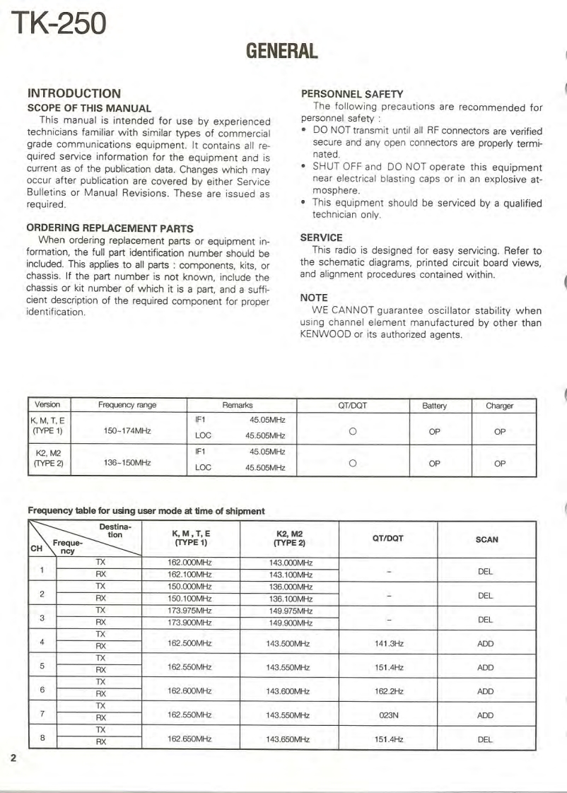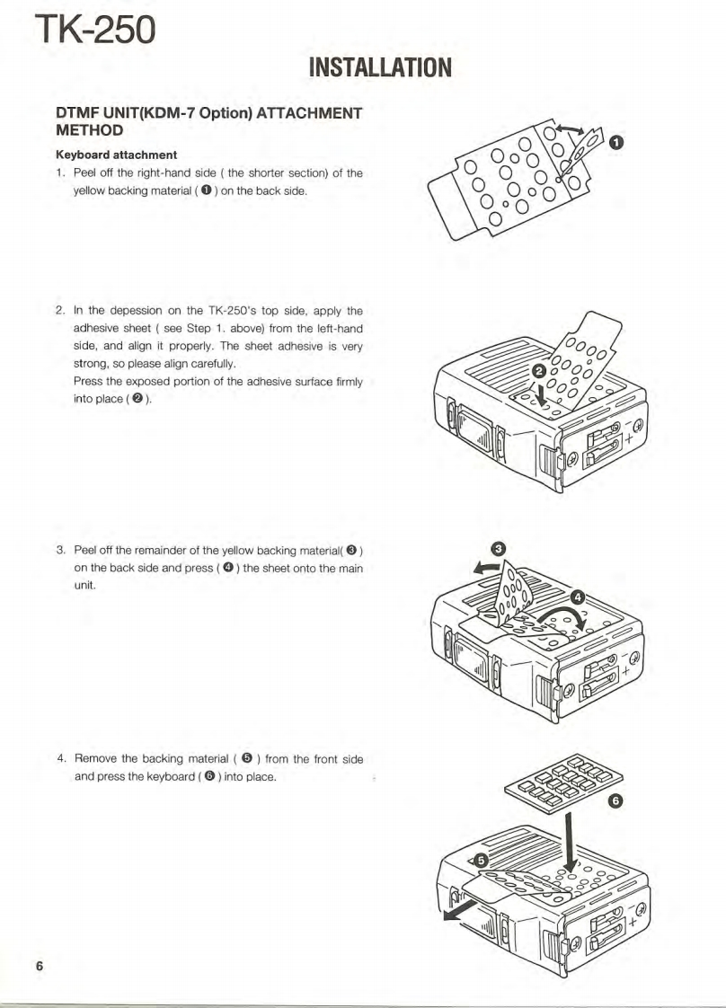 VHF FM TRANSCEIVERTK-250KENWOODSERVICE MANUALREVISED1995-4 PRINTED IN JAPANB51-8279-20(B)1558This service manual is the same as the service manual(B51-8279-10)for TK-250(K,K2,M and M2 destina-tions except that this manual contains new items (T,Edestinations).Use it together with the previous service manual (B51-8279-10).CONTENTSGENERALAntennaDISASSEMBLY FOR REPAIR..9T90-7INSTALLATION.6REALIGNMENT*154611*CIRCUIT DESCRIPTION....16SEMICONDUCTOR DATA.........24DESCRIPTION OF COMPONENTS......31Knob(CHANNEL SELECTOR)PARTS LIST330K29-4920-03EXPLODED VIEW…40PACKING42TERMINAL FUNCTION.......43ADJUSTMENT............416416141*46PC BOARD VIEWSKnob(VOLUME)0K29-4918-03)VC0 UNIT(X:58-4130-10)…51VC0UNTX58-4290-50)m52TX-RX UNIT(X57-444X-XX)(A/3)..53BadgeTX-RX UNIT(X57-444X-XX)(B/3)....Knob(PTT)(B43-1100-04)TX-RX UNIT(X57-4442-71)(A/3)..61K29-4917-02TX-RX UNIT(X57-4442-71)(B/3).65TX-RX UNIT(X57-444X-XX)(C/3)....69SCHEMATIC DIAGRAM.......73Dressing panelA21-1544-03)BLOCK DIAGRAM…81Cabinet(A02-1829-01)LEVEL DIAGRAM83KDM-7(DTMF KEY PAD).84KHS-1 (HEAD SET WITH VOX PTT)........84KSC-76(MULTIPLE RAPID CHARGER).............86KSC-8(COMPACT CHARGER)..89KSC-86 (MULTIPLE CHARGER)...90KNB-11A/12A(Ni-Cd BATTERY)..93KPG-22(PC PROGRAM INTERFACE)............93SPECIFICATIONS..BACK COVER"Refer to parts list on page 33.CAUTION:When using an external power connector,please use with maximum final moduleprotection of 9V.