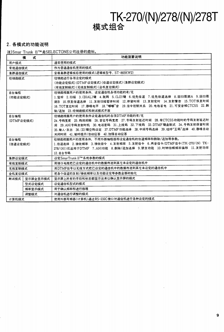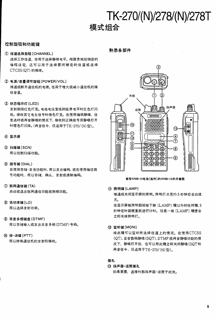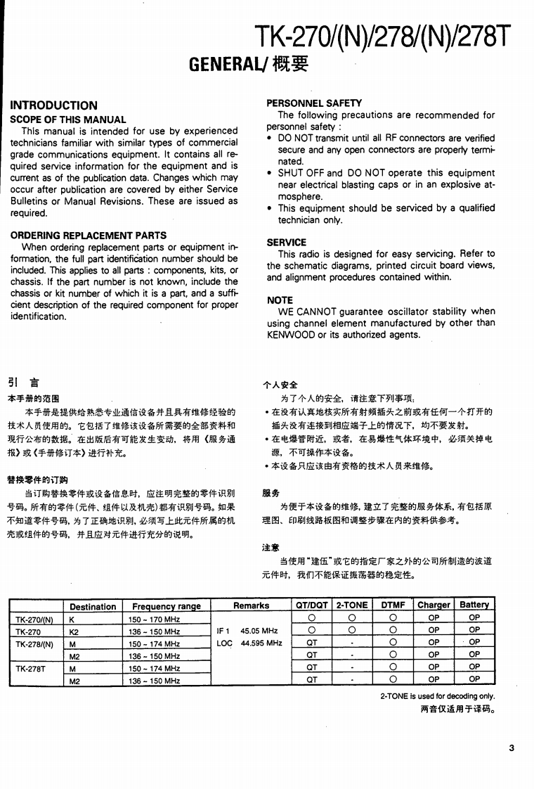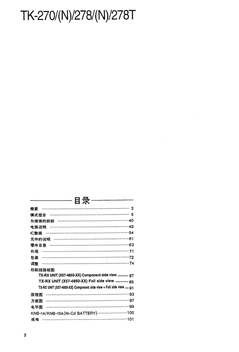 VHF FM TRANSCEIVER/甚高频调频无线电收发机KENWOODTK-270/N/278/N/278TSERVICE MANUAL/维修手册REVISED/修订版1997-7 PRINTED IN JAPANB51-8320-10(B)1003This service manual is same as the TK-270/278(B51-8320-00)service manual with destinations K,M,K2,andM2,with the exception of the new destinations,(N)K,(N)M,(N)K2,(N)M2,TM,and TM2.本维修手册与TK-270/278(B51-8320-00)相同带有终点K,M,K2及M2,新终点(N)K,(N)M,(N)K2,(N)M2,TM及TM2除外。Antenna(T90-0381-05):K2T90-0450-05):K(T90-0615-05):M2,TM2T90-0616-05):M,TMKnob(CHANNEL SELECTOR)K29-5167-03)Knob (VOL)(K29-5168-03)CONTENTSGENERAL...REALIGNMENT........4DISASSEMBLY FOR REPAIR40CIRCUIT DESCRIPTION ......43Plastic cabinetSEMICONDUCTOR DATA .......…53Knob (PTT)-(A02-2091-03)(K29-5069-12)DESCRIPTION OF COMPONENTS59PARTS LIST..........63DisplayEXPLODED VIEW ...…71(B38-0755-05)PACKING72ADJUSTMENT.....…73PCBORD VIEW6KeypadTX-RX UNIT(X57-4850-XX)Component side view ......87(K29-5067-02)TX-RX UNIT (X57-4850-XX)Foil side view ...........898TX-RX UNIT (X57-4850-XX)Component side view+Foil side view..91SCHEMATIC DIAGRAM..93BLOCK DIAGRAM…97LEVEL DIAGRAM99KNB-14/KNB-15A (Ni-Cd BATTERY)..100PHOTO is M,M2 TYPESPECIFICATIONSBACKCOVERCAUTION:When using an external power connector,please use with maximum final moduleprotection of 9V.