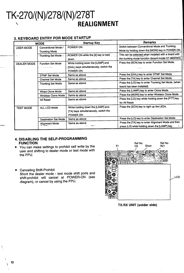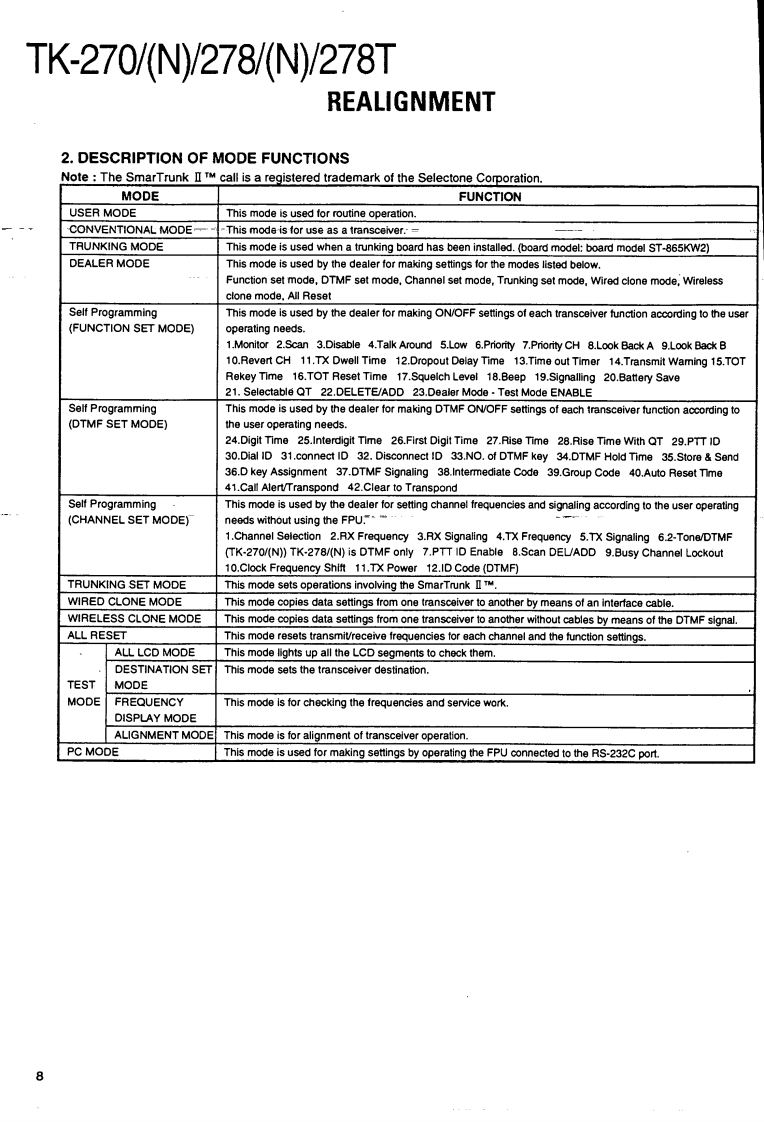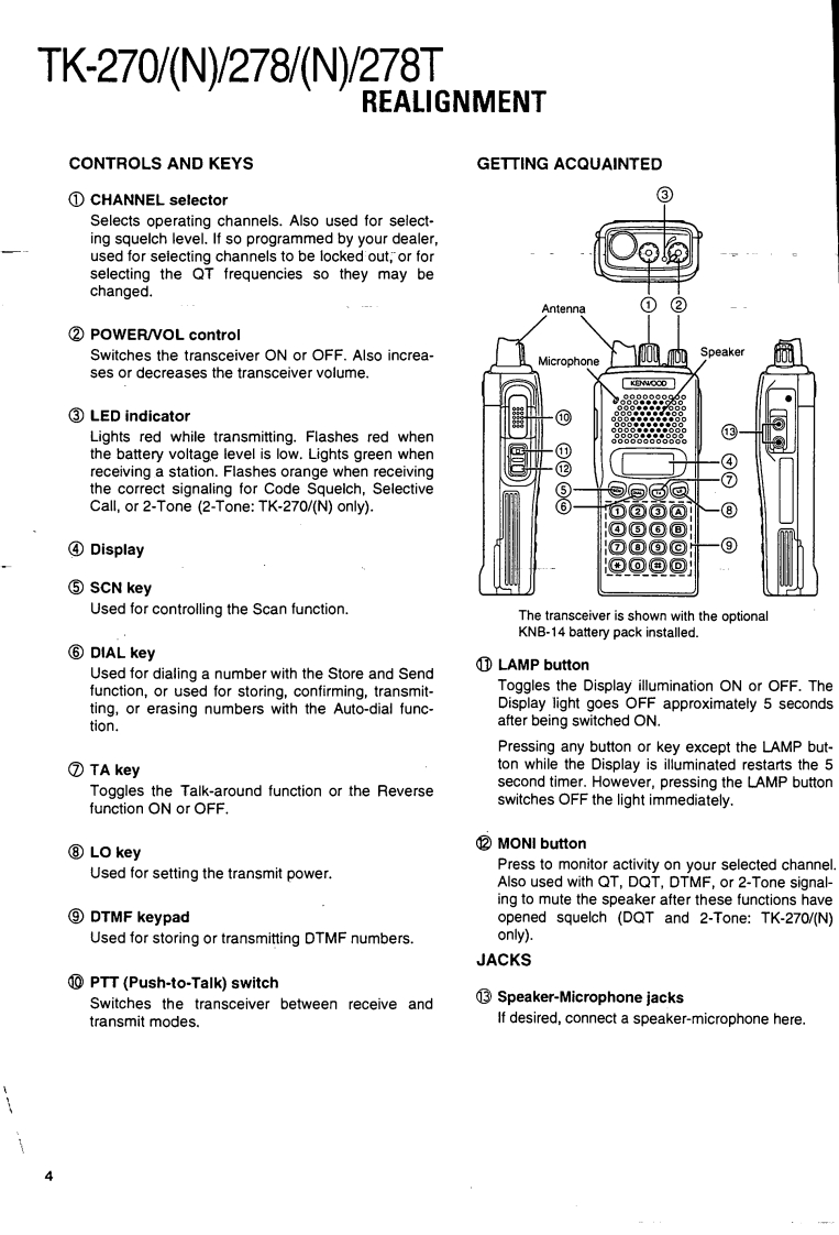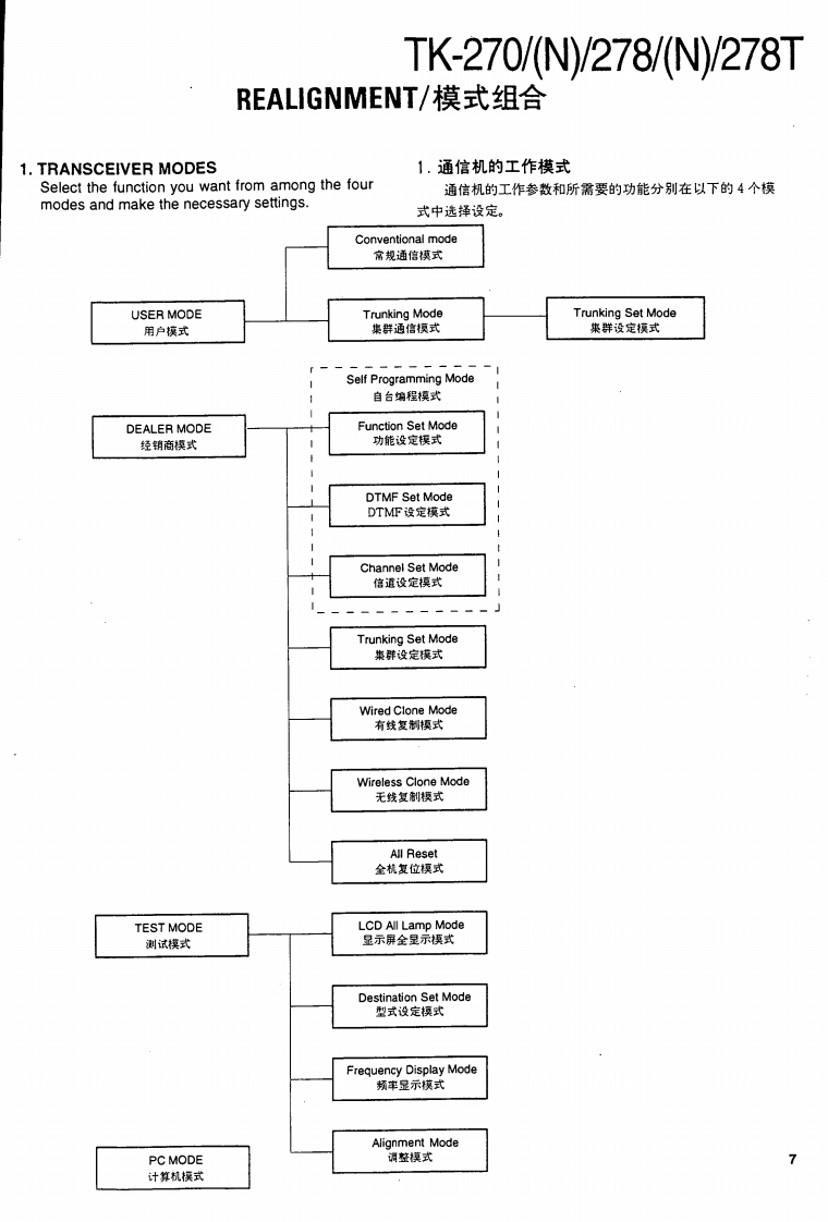 VHF FM TRANSCEIVER/甚高频调频无线电收发机KENWOODTK-270/N/278/N/278TSERVICE MANUAL/维修手册REVISED/修订版1997-7 PRINTED IN JAPANB51-8320-10(B)1003This service manual is same as the TK-270/278(B51-8320-00)service manual with destinations K,M,K2,andM2,with the exception of the new destinations,(N)K,(N)M,(N)K2,(N)M2,TM,and TM2.本维修手册与TK-270/278(B51-8320-00)相同带有终点K,M,K2及M2,新终点(N)K,(N)M,(N)K2,(N)M2,TM及TM2除外。Antenna(T90-0381-05):K2T90-0450-05):K(T90-0615-05):M2,TM2T90-0616-05):M,TMKnob(CHANNEL SELECTOR)K29-5167-03)Knob (VOL)(K29-5168-03)CONTENTSGENERAL...REALIGNMENT........4DISASSEMBLY FOR REPAIR40CIRCUIT DESCRIPTION ......43Plastic cabinetSEMICONDUCTOR DATA .......…53Knob (PTT)-(A02-2091-03)(K29-5069-12)DESCRIPTION OF COMPONENTS59PARTS LIST..........63DisplayEXPLODED VIEW ...…71(B38-0755-05)PACKING72ADJUSTMENT.....…73PCBORD VIEW6KeypadTX-RX UNIT(X57-4850-XX)Component side view ......87(K29-5067-02)TX-RX UNIT (X57-4850-XX)Foil side view ...........898TX-RX UNIT (X57-4850-XX)Component side view+Foil side view..91SCHEMATIC DIAGRAM..93BLOCK DIAGRAM…97LEVEL DIAGRAM99KNB-14/KNB-15A (Ni-Cd BATTERY)..100PHOTO is M,M2 TYPESPECIFICATIONSBACKCOVERCAUTION:When using an external power connector,please use with maximum final moduleprotection of 9V.