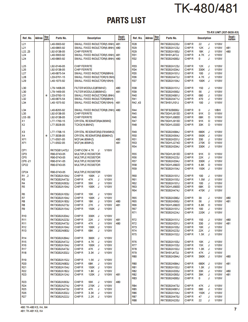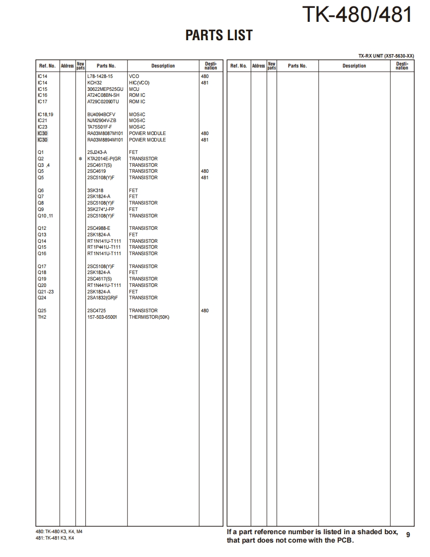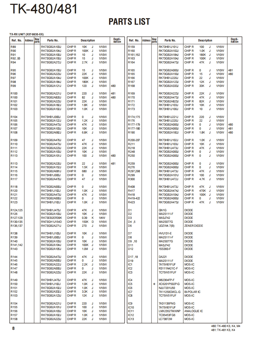 800MHz/900MHz FM TRANSCEIVERTK-480/481KENWOODKenwood CorporationSERVICE MANUALSUPPLEMENT K3,K4,M4 versions2011-5 PRINTED IN JAPANB51-8977-00)PDFThis service manual applies to products with A8A00001 (TK-480),B160001 (TK-481)orsubsequent serial numbers.Refer to the TK-480/481 series service manual for any infor-mation which has not been covered in this manual.Knob(SEL)(K29-5232-03)Knob (VOL)(K29-5231-03)Whip antenna(T90-0636-25):TK-480(T90-0640-25):TK-481Panel assyBadgeTKENWOOD】(A62-0981-04)(B43.1139-04)Knob(PTT)CONTENTS(K29-5157-03)☐5G50J8GENERAL.2DISASSEMBLY FOR REPAIR..............3SA®G@PARTS LIST.…4PackingPC BOARD(G53-0841-22):K4TX-RX UNIT(X57-5630-XX).....10SCHEMATIC DIAGRAM...................14Cabinet assy(A02-3659-23):K4CAUTIONIllustration is TK-480/481 K4 type.When using an external power connector,please use with maximum final module protec-tion of 9V.