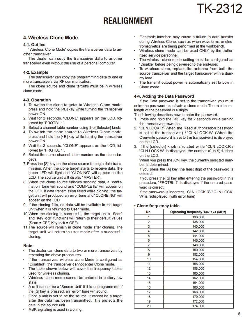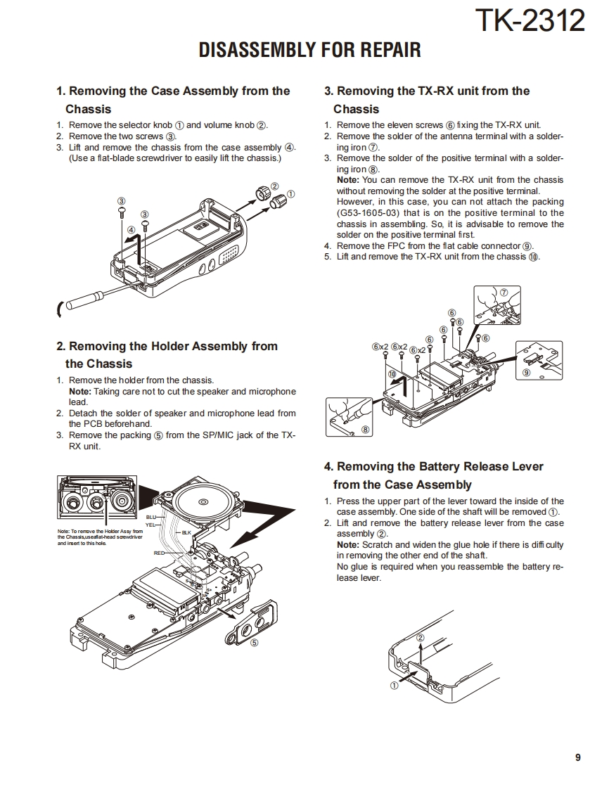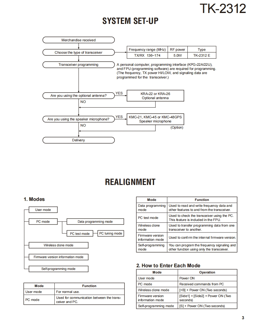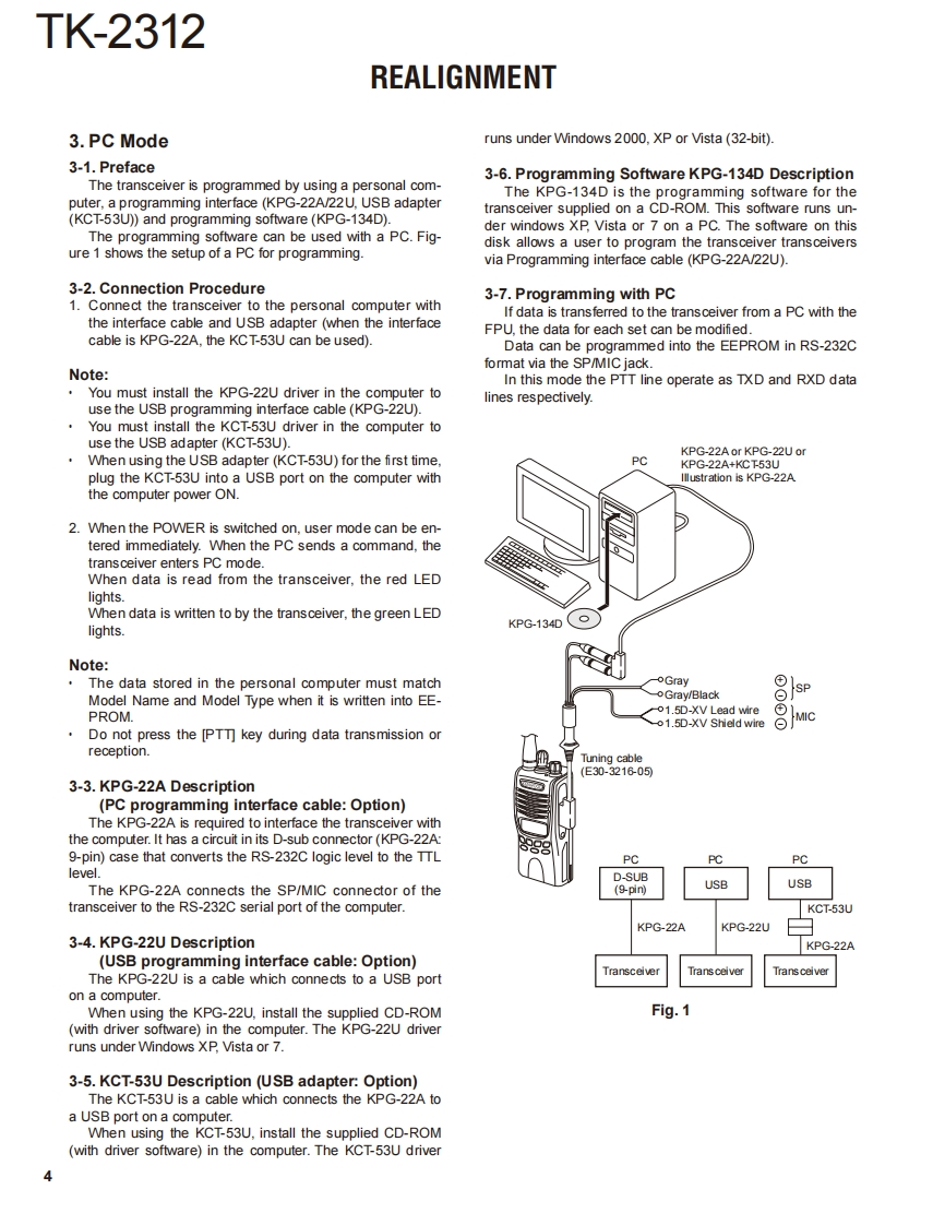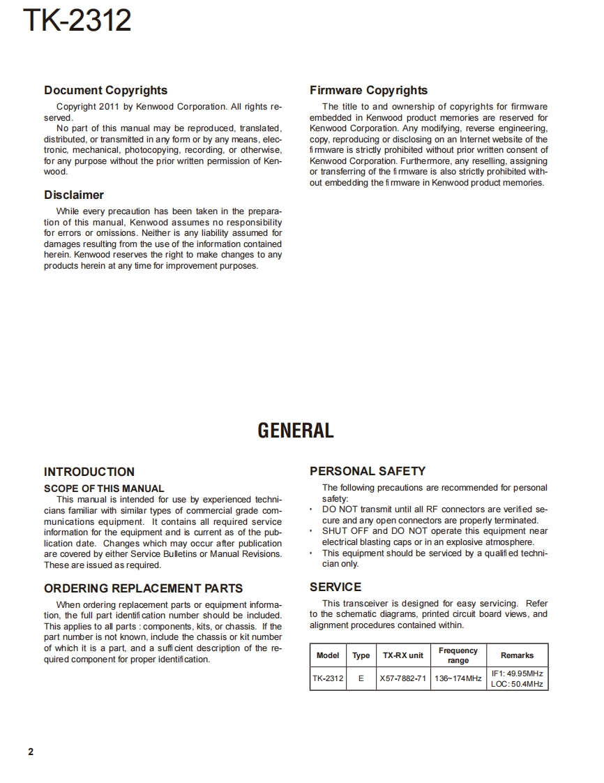 VHF FM TRANSCEIVERTK-2312KENWOODKenwood CorporationSERVICE MANUALE version2011-4 PRINTED IN JAPANB51-8970-00)87CONTENTSGENERAL......2SYSTEM SET-UP ...................3REALIGNMENT.............3DISASSEMBLY FOR REPAIR................9CIRCUIT DESCRIPTION ..........12Helical antennaKnob(Selector)SEMICONDUCTOR DATA .......................17(KRA-26 Option)(K29-9427-03)COMPONENTS DESCRIPTION............18Knob (Volume)K29-9309-13)PARTS LIST..19EXPLODED VIEW......................27PACKING28ADJUSTMENT..........29PC BOARDKENWOOD)TX-RX UNIT(X57-7882-71)34SCHEMATIC DIAGRAM..38Button knob (PTT)(K29-9425-03)BLOCK DIAGRAM...........44LEVEL DIAGRAM..........46Button knob☑0♪生回PL自(SIDE1/SIDE2)恩盈盛盛母原盈OPTIONAL ACCESSORIES(K29-9426-03KNB-29N(Ni-MH Battery Pack).........47Key top (7key)KNB-45L (Li-ion Battery Pack).............47(K29-9463-12)KNB-53N (Ni-MH Battery Pack)...........47KMC-48GPS(GPS Speaker Microphone)..47Plastic cabinet assy(A024095-23)SPECIFICATIONS..........BACK COVERLFThis product complies with the RoHS directive for the European market.This product uses Lead Free solder.