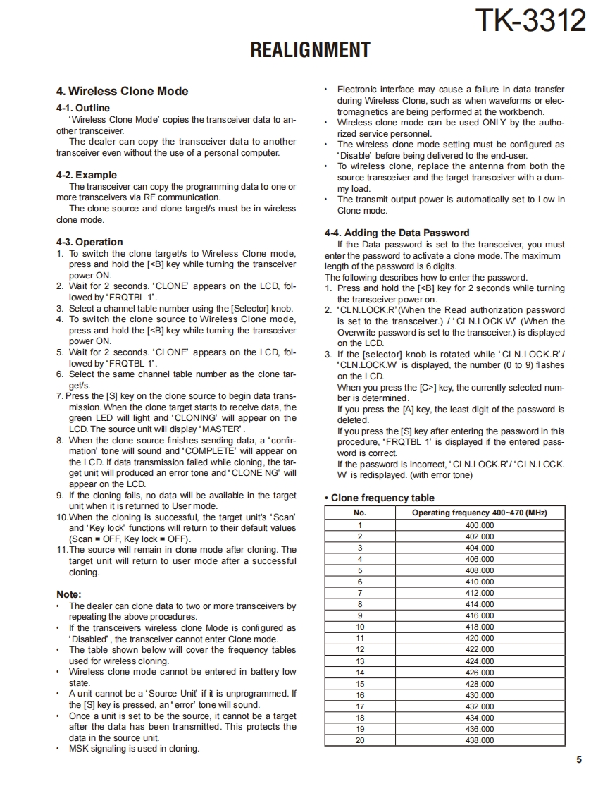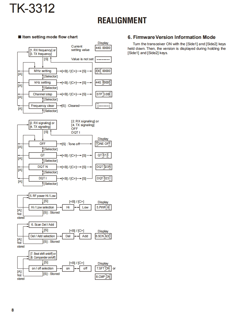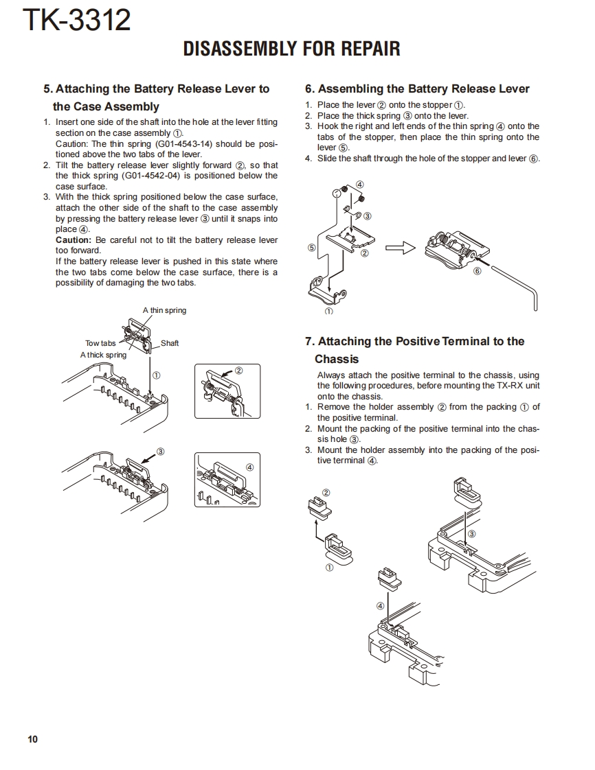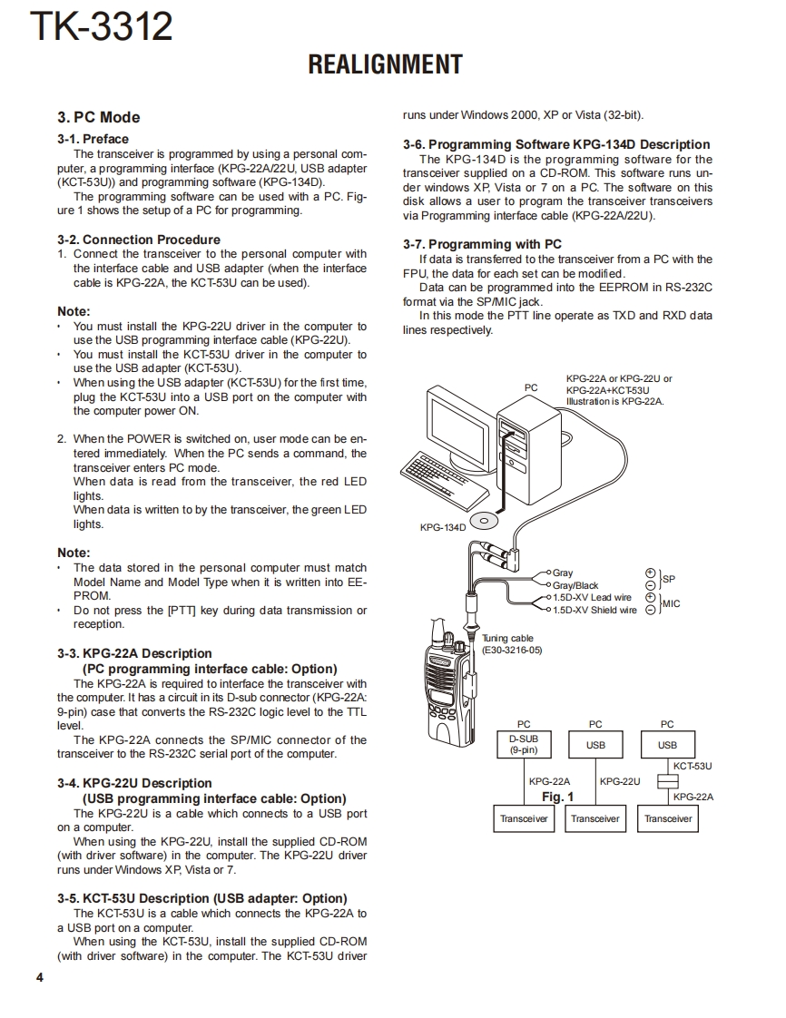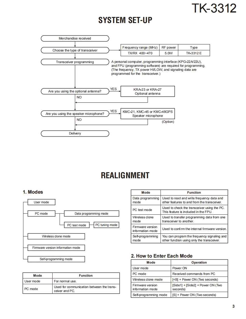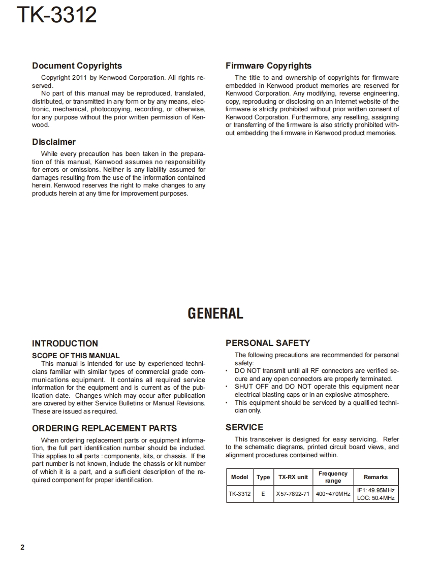 UHF FM TRANSCEIVERTK-3312KENWOODKenwood CorporationSERVICE MANUALE version2011-4 PRINTED IN JAPANB51-8971-00)87CONTENTSGENERAL…2SYSTEM SET-UP...................3REALIGNMENT.........3DISASSEMBLY FOR REPAIR................9CIRCUIT DESCRIPTION ..........12Whip antennaKnob (Selector)SEMICONDUCTOR DATA.............17(KRA-27:Option)(K29-9427-03)COMPONENTS DESCRIPTION............18Knob (Volume)(K29-9309-13)PARTS LIST..19EXPLODED VIEW......................27PACKING28ADJUSTMENT........29KENWOOD)PC BOARDTX-RX UNIT(X57-7892-71)34SCHEMATIC DIAGRAM..38Button knob(PTT)】(K29-9425-03)BLOCK DIAGRAM...........44LEVEL DIAGRAM.........46Button knob7可上2☒PL0自(SIDE1/SIDE2)OPTIONAL ACCESSORIES(K29-9426-03)】KNB-29N(Ni-MH Battery Pack).........47Key top(7key)KNB-45L (Li-ion Battery Pack).............47(K29-9463-12)oKNB-53N(Ni-MH Battery Pack).........47Plastic cabinet assyKMC-48GPS(GPS Speaker Microphone)..47(A02.4095-23)SPECIFICATIONS..........BACK COVERLFThis product complies with the RoHS directive for the European market.This product uses Lead Free solder.