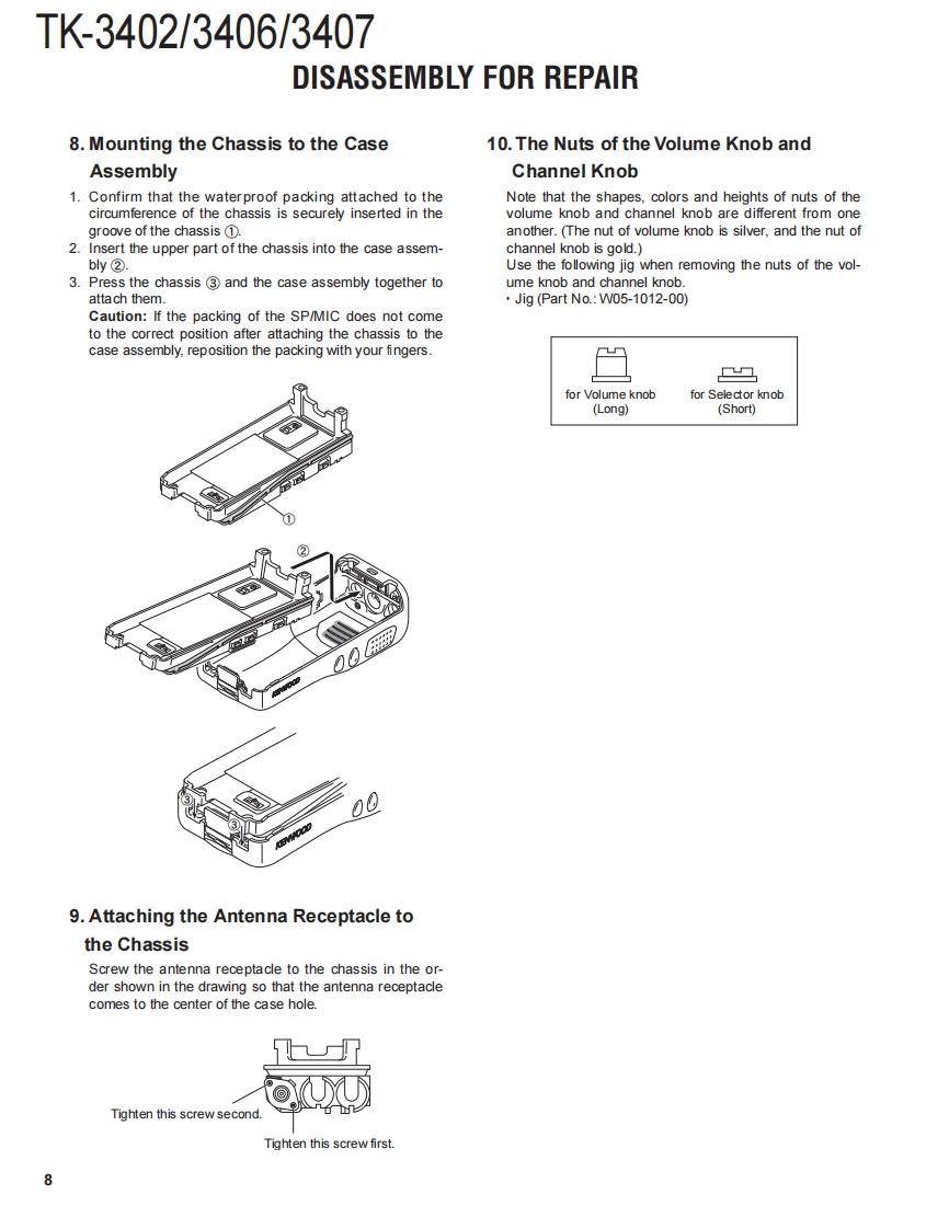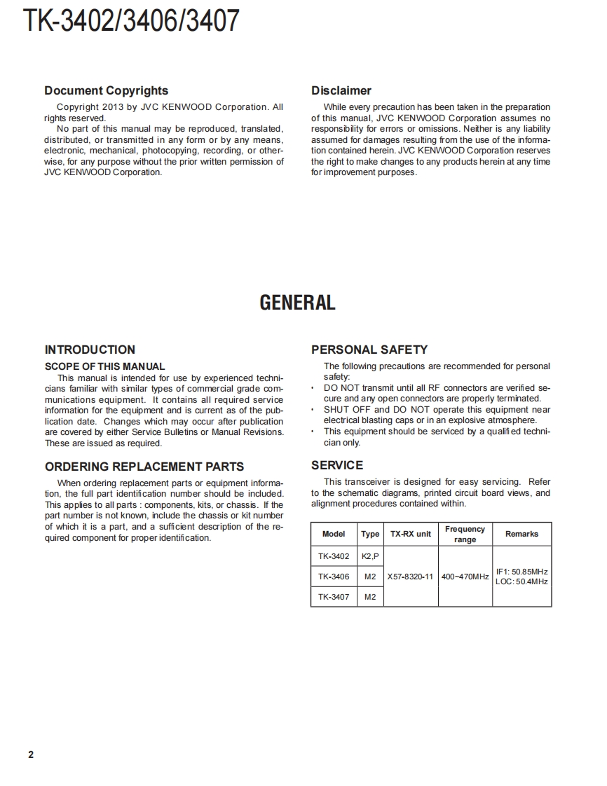 UHF FM TRANSCEIVERTK-3402/3406/3407KENWOODJVCKENWOOD CorporationSERVICE MANUALK2,P,M2 versions2013-02 PRINTED IN JAPANB53-7049-00Y)241CONTENTSGENERAL…2SYSTEM SET-UP ................3REALIGNMENT.........3DISASSEMBLY FOR REPAIR................6CIRCUIT DESCRIPTION .........9Knob (Selector)Whip antennaSEMICONDUCTOR DATA ..................14(T90-1041-25):TK.3402(K29-9615-03)(K2,P only)Knob (Volume)COMPONENTS DESCRIPTION.............15(K29-9614-03)PARTS LIST...16EXPLODED VIEW......................22PACKING23ADJUSTMENT..........25KENWOODPC BOARDTX-RX UNIT(X57-8320-11)30Button knob (PTT)SCHEMATIC DIAGRAM.34(K29-9612-03)BLOCK DIAGRAM...38Button knobLEVEL DIAGRAM0(SIDE1/SIDE2)(K29-9613-03)】SPECIFICATIONS.Plastic cabinet assy(A02-4200-03&LFThis product complies with the RoHS directive for the European market.This product uses Lead Free solder.