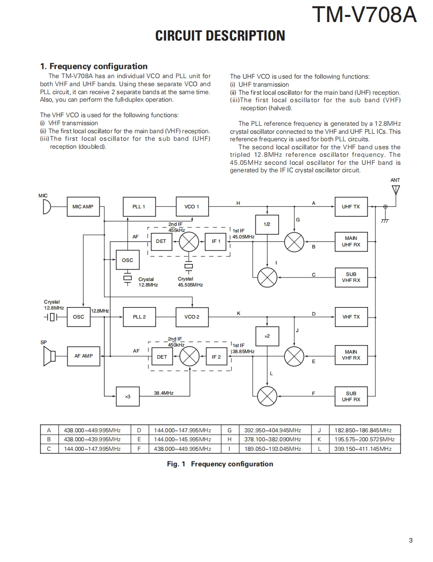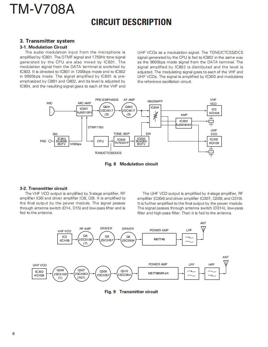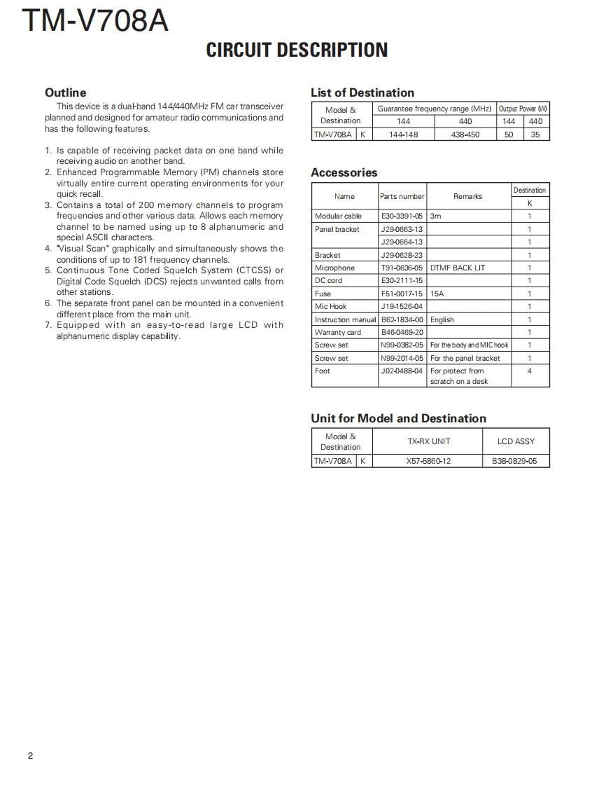 144/440MHz FM DUAL BANDERKENWOODTM-V708ASERVICE MANUALC2004-11 PRINTED IN JAPANB51-8704-00(S)237Microphone(T91-0636-05)Panel (DISPLAY)000(A62-0775-03)KENWOODButton knob月t1 anta se附E(K295400-11)Button knob(K29-5400-11)146.970448.525Knob (SQL)(K29-5223-03)Knob (ENC)(K29-5381-03)Cabinet (UPPER)Knob (VOL)(A01-2122-.23)(K29-5222-03)Panel (MAIN UNIT)(A62-1122-03)CONTENTSCIRCUIT DESCRIPTION...........2PC BOARDSEMICONDUCTOR DATA......14TX-RX UNIT(X57-5860-12).47COMPONENTS DESCRIPTION.......7PANEL UNIT(X54-3290-00).53TERMINAL FUNCTION..19SCHEMATIC DIAGRAM...........57PARTS LIST20BLOCK DIAGRAM..67EXPLODED VIEW...31INTERCONNECTION DIAGRAM........69PACKING.32LEVEL DIAGRAM.70ADJUSTMENT33OPTION (PG-4X)........71SPECIFICATIONS..........BACK COVER